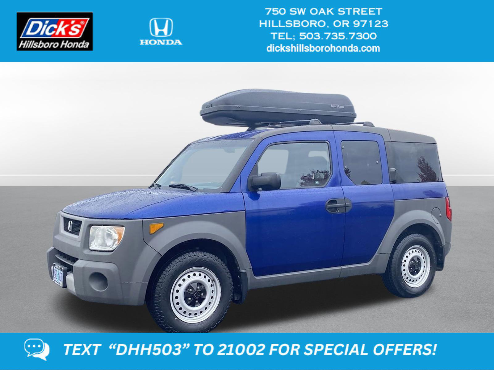 2004 Honda Element LX Fiji Blue Pearl FWD 4-Speed Automatic with Overdrive 2.4L I4 MPFI DOHC 16V i-VTECTwo owners (second almost 13 years) with immaculate service records!CLEAN CARFAX: NO ACCIDENTS, **LOCAL TRADE-IN**, FULLY SERVICED/MAINTAINED, 16 x 6.5 Steel Wheels, 4 Speakers, 4.438 Axle Ratio, 4-Wheel Disc Brakes, Air Conditioning, AM/FM radio, AM/FM/CD Audio System w/4 Speakers, CD player, Cloth Seat Trim, Driver door bin, Dual front impact airbags, Four wheel independent suspension, Front anti-roll bar, Front Bucket Seats, Passenger door bin, Power steering, Power windows, Rear anti-roll bar, Rear window defroster, Rear window wiper, Speed-sensing steering, Split folding rear seat, Tachometer, Tilt steering wheel.Recent Arrival!Odometer is 34462 miles below market average!22/26 City/Highway MPGCome to www.dickshillsborohonda.com To See Our Specials!! Call us at (866) 973-3693 For help with any of our departments!! We gave it a full lube-oil-filter service, pressure tested the coolant/antifreeze system for leaks & protection, checked the brakes & tires, checked all parts/systems for excessive wear & tear, topped off needed fluids, detailed the vehicle and gave it a thorough diagnostic/frame/safey inspection!Awards:* 2004 KBB.com Top 10 Coolest New Cars Under $18,000For more information, visit www.kbb.com. Kelley Blue Book is a registered trademark of Kelley Blue Book Co., Inc. This fwd 2004 Honda Element LX is one of those used cars Portland, Hillsboro & Beaverton, OR shoppers seek out. This Honda Element features a Fiji Blue Pearl exterior with a Black Interior. With 133,605 miles this 2004 Element with a 2.4l engine and a 4-speed automatic w/od transmission is your best buy near Portland, Hillsboro & Beaverton, Oregon.Your Fiji Blue Pearl 2004 Honda Element LX near Beaverton is available for immediate test drives in Hillsboro, OR.*Our Car Dealership in Hillsboro:* Call Dicks Hillsboro Honda today at *(503) 616-4532 TO SCHEDULE YOUR TEST DRIVE* of this 2004 Honda Element LX! Dicks Hillsboro Honda serves Portland, Hillsboro & Beaverton, OR. You can also visit us at, 750 SW Oak St. Hillsboro OR, 97123 to check it out in person! Dicks Hillsboro Honda Used car dealership only sells used cars Beaverton, OR buyers can trust for safety and worry free driving.*MECHANICAL FEATURES:* This Honda Element comes factory equipped with an impressive 2.4l engine, and 4-speed automatic w/od transmission. Other installed mechanical features include Power One-touch Down windows, Power Locks, Front Wheel Drive, Ventilated Disc Brakes, Intermittent Wipers, Variable Speed Intermittent Wipers, Trip Computer, Tires - Rear All-Season, Power Steering, Tires - Front All-Season. Dicks Hillsboro Honda is Northwest Oregon's only location where you can test drive a new, used or Certified car. That's why more Oregon used car shoppers and owners drive to Dicks Hillsboro Honda in Hillsboro for used cars, trucks & SUVs sales, service, parts and accessories.*INTERIOR OPTIONS:* Cloth Seats, Pass-Through Rear Seat, Air Conditioning, Bucket Front Seats, Single-Disc CD Player, AM/FM Stereo, Trip Odometer, Tilt Steering Wheel, Rear Window DefrosterThis 2004 Honda Element LX comes standard with peace of mind for any driving conditions*Why utilize Honda Financial Financing?* You can use our Honda Dealer car payment calculator to calculate your payment on this Fiji Blue Pearl 2004 Honda Element LX. Our Dicks Hillsboro Honda Honda Financial Specialists work with every level of credit and Honda Financing needs. From bad credit car financing to the highest credit scores, our Honda Financial experts offer more and better credit options than used car lots in Portland, Oregon.The Dicks Hillsboro Honda used car dealership in Northwest Oregon is an easy drive or fly in from anywhere in the United States. Our car lot sits just west of Beaverton where your 2004 Honda Element LX will be waiting for your test drive and/or shipping instructions.When shopping for used cars Portland shoppers prefer the short drive to Hillsboro. We're glad you found this pre-owned Honda Element for sale at our used car dealership near Beaverton in Hillsboro, OR. Looking for Honda financing? Our Dicks Hillsboro Honda finance specialist will find the best rates available for this pre-owned Honda Element for sale. Dicks Hillsboro Honda has new cars for sale and used cars for sale in Hillsboro just west of Portland. So, if you're shopping used car dealerships in Beaverton, OR consider driving just past Aloha, Oregon to Hillsboro where you'll experience Northwest Oregon's preferred Honda dealer service, sales and the Dicks Hillsboro Honda difference!Dicks Hillsboro Honda Used Car, Truck, SUV And Van Super center stocks the vehicles Portland, Hillsboro & Beaverton, Oregon shoppers prefer like this 2004 Honda Element LX stock # 4L013286.