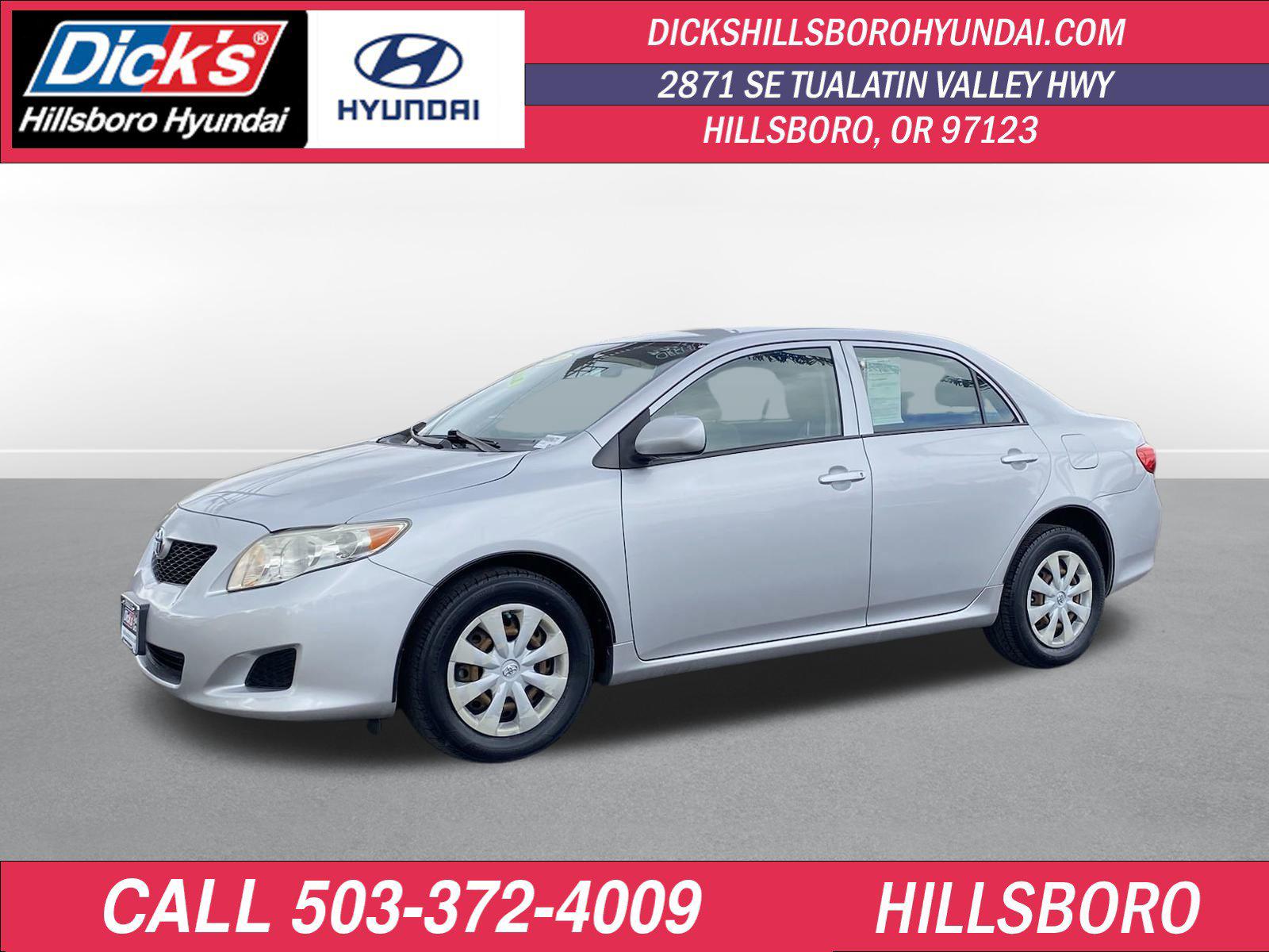 2009 Toyota Corolla LE Classic Silver Metallic FWD 1.8L I4 DOHC Dual VVT-i 4-Speed Automatic15 Steel Disc Wheels, 4 Speakers, ABS brakes, Air Conditioning, AM/FM radio, AM/FM Stereo w/CD/MP3 & 4 Speakers, Anti-whiplash front head restraints, Brake assist, Bumpers: body-color, CD player, Cloth Seat Trim, Driver door bin, Driver vanity mirror, Dual front impact airbags, Dual front side impact airbags, Front anti-roll bar, Front Bucket Seats, Front Center Armrest, Front wheel independent suspension, Illuminated entry, Low tire pressure warning, Occupant sensing airbag, Outside temperature display, Overhead airbag, Passenger door bin, Passenger vanity mirror, Power Door Locks, Power door mirrors, Power steering, Power Windows, Power windows, Rear anti-roll bar, Rear window defroster, Speed-sensing steering, Split folding rear seat, Tachometer, Telescoping steering wheel, Tilt steering wheel.Odometer is 7192 miles below market average!You make the drive, we'll make the deal! Come to www.dickshillsborohyundai.com To See Our Specials!! Call us at 503-608-7456 For help with any of our departments!!Awards:* 2009 KBB.com Best Resale Value Awards * 2009 KBB.com Brand Image AwardsReviews:* * Trustworthy * Efficient * Superb reputation * Excellent resale value * Choice of engines: 1.8 or 2.4 (XRS) Source: KBB.com