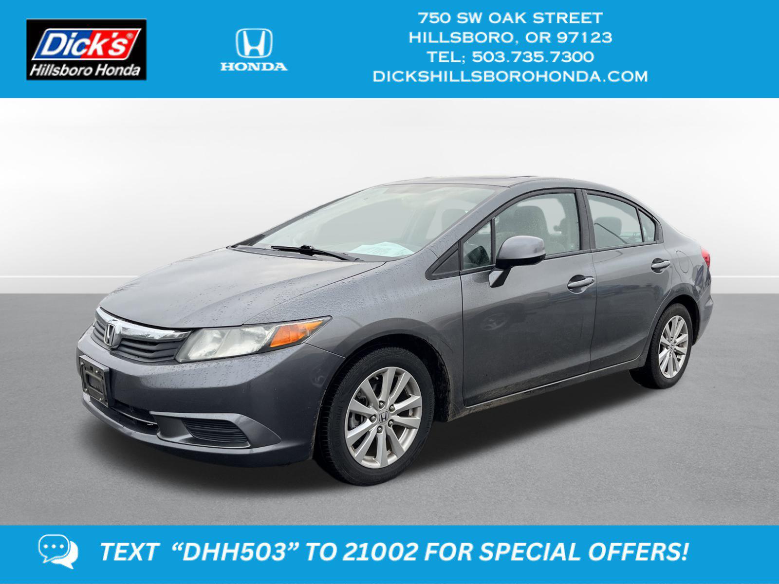 This is the one you want!! Great history, runs and drives awesome. We did new front brakes at inspection! 2012 Honda Civic EX-L Urban Titanium Metallic FWD 5-Speed Automatic 1.8L I4 SOHC 16V i-VTEC1-OWNER!, CLEAN CARFAX: NO ACCIDENTS, FULLY SERVICED/MAINTAINED, Stone w/Leather Seat Trim, 4-Wheel Disc Brakes, 6 Speakers, ABS brakes, Air Conditioning, Alloy wheels, Brake assist, Bumpers: body-color, CD player, Delay-off headlights, Driver door bin, Driver vanity mirror, Dual front impact airbags, Dual front side impact airbags, Electronic Stability Control, Four wheel independent suspension, Front anti-roll bar, Front Bucket Seats, Front Center Armrest, Front reading lights, Fully automatic headlights, Heated door mirrors, Heated front seats, Illuminated entry, Leather Seat Trim, Low tire pressure warning, Occupant sensing airbag, Outside temperature display, Overhead airbag, Panic alarm, Passenger door bin, Passenger vanity mirror, Power door mirrors, Power moonroof, Power steering, Power windows, Radio data system, Rear anti-roll bar, Rear seat center armrest, Rear window defroster, Reclining Heated Front Bucket Seats, Remote keyless entry, Security system, Speed control, Speed-sensing steering, Split folding rear seat, Steering wheel mounted audio controls, Tachometer, Telescoping steering wheel, Tilt steering wheel, Traction control, Trip computer, Variably intermittent wipers, **NEW FRONT BRAKES**, **HEATED SEATS**, Stone w/Leather Seat Trim.Recent Arrival!28/39 City/Highway MPGCome to www.dickshillsborohonda.com To See Our Specials!! Call us at (503) 735-7310 For help with any of our departments!! We gave it a full lube-oil-filter service, pressure tested the coolant/antifreeze system for leaks & protection, checked the brakes & tires, checked all parts/systems for excessive wear & tear, topped off needed fluids, detailed the vehicle and gave it a thorough diagnostic/frame/safey inspection!Awards:* 2012 KBB.com Brand Image AwardsKelley Blue Book Brand Image Awards are based on the Brand Watch(tm) study from Kelley Blue Book Market Intelligence. Award calculated among non-luxury shoppers. For more information, visit www.kbb.com. Kelley Blue Book is a registered trademark of Kelley Blue Book Co., Inc.Reviews:* * Engine choices include hybrid and natural gas versions * Excellent fuel economy * Relatively spacious for a compact sedan or coupe * Well-tuned suspension offering comfort with control Source: KBB.com