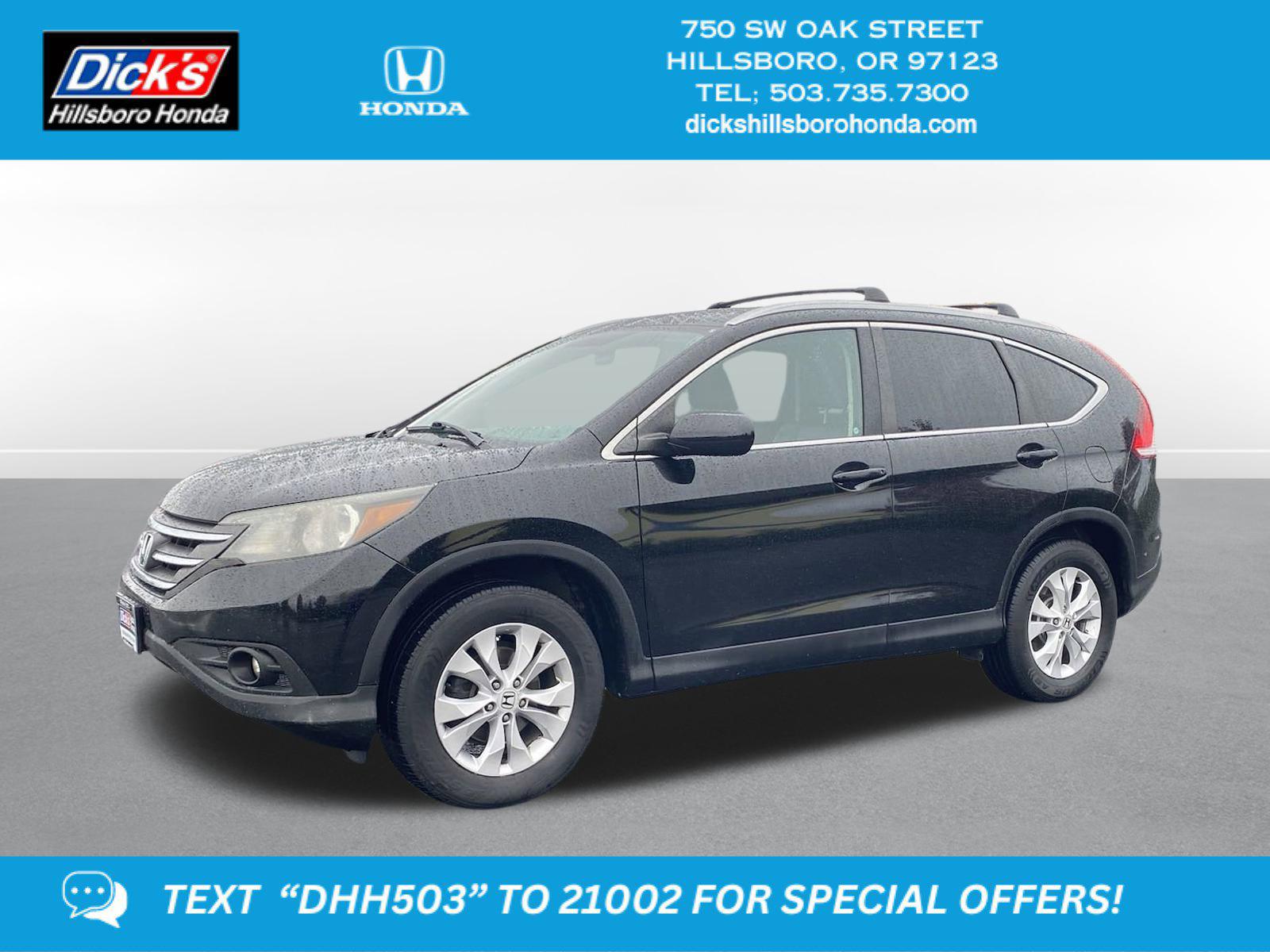 2014 Honda CR-V EX-L Crystal Black Pearl AWD 5-Speed Automatic 2.4L I4 DOHC 16V i-VTECLEATHER INTERIOR, **LOCAL TRADE-IN**, FULLY SERVICED/MAINTAINED, AWD, 17 10-Spoke Alloy Wheels, 4-Wheel Disc Brakes, 4.44 Axle Ratio, 7 Speakers, ABS brakes, Air Conditioning, Alloy wheels, AM/FM radio: XM, Automatic temperature control, Brake assist, Bumpers: body-color, CD player, Compass, Delay-off headlights, Driver door bin, Driver vanity mirror, Driver's Seat Mounted Armrest, Dual front impact airbags, Dual front side impact airbags, Electronic Stability Control, Exterior Parking Camera Rear, Four wheel independent suspension, Front anti-roll bar, Front Bucket Seats, Front dual zone A/C, Front fog lights, Front reading lights, Heated door mirrors, Heated Front Bucket Seats, Heated front seats, Illuminated entry, Leather Shift Knob, Leather-Trimmed Seats, Low tire pressure warning, Occupant sensing airbag, Outside temperature display, Overhead airbag, Overhead console, Panic alarm, Passenger door bin, Passenger seat mounted armrest, Passenger vanity mirror, Power door mirrors, Power driver seat, Power moonroof, Power steering, Power windows, Radio data system, Radio: AM/FM/CD Audio System w/XM Radio, Rear anti-roll bar, Rear seat center armrest, Rear window defroster, Rear window wiper, Remote keyless entry, Roof rack: rails only, Security system, Speed control, Speed-sensing steering, Speed-Sensitive Wipers, Split folding rear seat, Steering wheel mounted audio controls, Tachometer, Telescoping steering wheel, Tilt steering wheel, Traction control, Trip computer, Variably intermittent wipers, AWD.Recent Arrival!22/30 City/Highway MPGCome to www.dickshillsborohonda.com To See Our Specials!! Call us at (866) 973-3693 For help with any of our departments!! We gave it a full lube-oil-filter service, pressure tested the coolant/antifreeze system for leaks & protection, checked the brakes & tires, checked all parts/systems for excessive wear & tear, topped off needed fluids, detailed the vehicle and gave it a thorough diagnostic/frame/safey inspection!Awards:* 2014 KBB.com Brand Image AwardsKelley Blue Book Brand Image Awards are based on the Brand Watch(tm) study from Kelley Blue Book Market Intelligence. Award calculated among non-luxury shoppers. For more information, visit www.kbb.com. Kelley Blue Book is a registered trademark of Kelley Blue Book Co., Inc.Reviews:* Abundant passenger and cargo room; good fuel economy; user-friendly controls; ample standard tech features; strong crash test scores. Source: Edmunds* The 2014 Honda CR-V is as comfortable mushing through unplowed streets as it is circling the flea market ready to haul home some vintage antiques. Excellent fuel economy, a very reasonable price, and a near flawless repair record should seal the deal. Source: KBB.com* The 2014 Honda CR-V has a modern aerodynamic look, with sweeping lines, exciting body sculpting, and a dramatic profile. It has enough attitude and ability to get you around town and then tackle the open road and the great outdoors. The CR-V comes equipped with a 2.4-Liter i-VTEC 4-Cylinder engine with 185 Horsepower and a 5-Speed Automatic Transmission. It has a rigid unit-body structure, coupled with taut suspension tuning, which give it impressive handling characteristics. For ultimate 4-season security, the 2014 CR-V is available with Honda's Real Time All-Wheel Drive with Intelligent Control System that smoothes out initial acceleration and can transfer up to 100 percent of torque to the rear wheels if necessary. The CR-V is very fuel-efficient and can get up to an EPA estimated 31 MPG Highway when in two-wheel drive. Hit the green ECON button, and the vehicle makes adjustments to its systems so they can be more efficient. Then you get feedback as you drive from Eco Assist to let you know how efficient your driving is. Honda has placed bars around the speedometer, and the longer you This awd 2014 Honda CR-V EX-L is one of those used cars Portland, Hillsboro & Beaverton, OR shoppers seek out. This Honda CR-V features a Crystal Black Pearl exterior with a Black Interior. With 132,305 miles this 2014 CR-V with a 2.4 l engine and a 5-speed automatic w/od transmission is your best buy near Portland, Hillsboro & Beaverton, Oregon.*TECHNOLOGY FEATURES:* SiriusXM Satellite Radio, Bluetooth Connection, Keyless Entry. Your Crystal Black Pearl 2014 Honda CR-V EX-L near Beaverton is available for immediate test drives in Hillsboro, OR.*Our Car Dealership in Hillsboro:* Call Dicks Hillsboro Honda today at *(503) 616-4532 TO SCHEDULE YOUR TEST DRIVE* of this 2014 Honda CR-V EX-L! Dicks Hillsboro Honda serves Portland, Hillsboro & Beaverton, OR. You can also visit us at, 750 SW Oak St. Hillsboro OR, 97123 to check it out in person! Dicks Hillsboro Honda Used car dealership only sells used cars Beaverton, OR buyers can trust for safety and worry free driving.*MECHANICAL FEATURES:* This Honda CR-V comes factory equipped with an impressive 2.4 l engine, and 5-speed automatic w/od transmission. Other installed mechanical features include Heated Mirrors, All Wheel Drive, Power Mirrors, Ventilated Disc Brakes, Cruise Control, Intermittent Wipers, Power Steering, Variable Speed Intermittent Wipers, Tires - Rear All-Season, Tires - Front All-Season. Dicks Hillsboro Honda is Northwest Oregon's only location where you can test drive a new, used or Certified car. That's why more Oregon used car shoppers and owners drive to Dicks Hillsboro Honda in Hillsboro for used cars, trucks & SUVs sales, service, parts and accessories.*INTERIOR OPTIONS:* Sunroof, Leather Seats, Heated Front Seats, Automatic Climate Control, Adjustable Lumbar Seats, Leather Wrapped Steering Wheel, Power Drivers Seat, Woodgrain Trim, Steering Wheel Audio Controls, Pass-Through Rear Seat, Air Conditioning, Bucket Front Seats, Driver Illuminated Vanity Mirror, Multi-zone Climate Control, Single-Disc CD Player, Passenger Illuminated Visor Mirror, Tilt Steering Wheel, Vanity Mirro