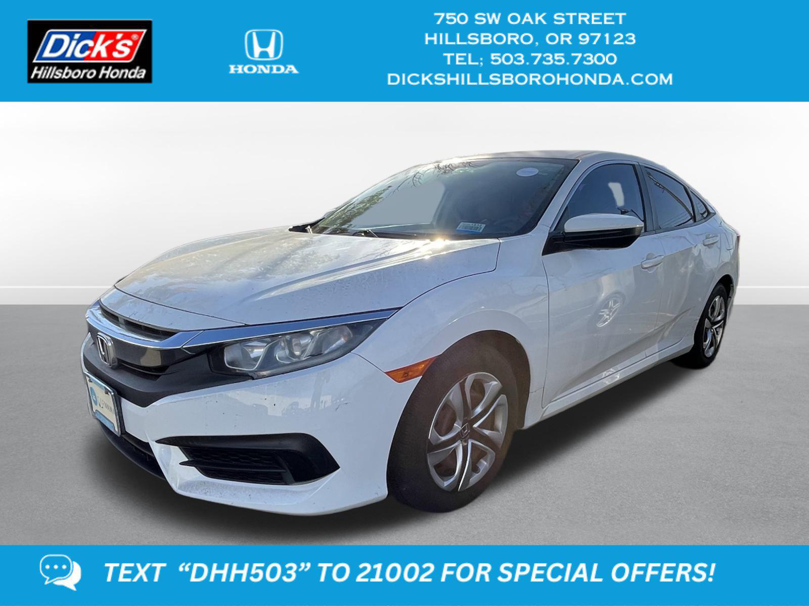 ^ year previous owner!! Inexpensive, low miles, great MPGs.... this one has all you need! 2018 Honda Civic LX Taffeta White FWD CVT 2.0L I4 DOHC 16V i-VTECBlack/Ivory w/Fabric Seating Surfaces, 16 Wheels w/Full Covers, 4 Speakers, 4-Wheel Disc Brakes, ABS brakes, Air Conditioning, AM/FM radio, Automatic temperature control, Brake assist, Bumpers: body-color, Cloth Seat Trim, Compass, Delay-off headlights, Driver door bin, Driver vanity mirror, Dual front impact airbags, Dual front side impact airbags, Electronic Stability Control, Exterior Parking Camera Rear, Four wheel independent suspension, Front anti-roll bar, Front Bucket Seats, Front Center Armrest, Front reading lights, Fully automatic headlights, Illuminated entry, Low tire pressure warning, Occupant sensing airbag, Outside temperature display, Overhead airbag, Panic alarm, Passenger door bin, Passenger vanity mirror, Power door mirrors, Power steering, Power windows, Radio data system, Radio: 160-Watt AM/FM Audio System, Rear anti-roll bar, Rear window defroster, Reclining Front Bucket Seats, Remote keyless entry, Security system, Speed control, Speed-sensing steering, Steering wheel mounted audio controls, Tachometer, Telescoping steering wheel, Tilt steering wheel, Traction control, Black/Ivory w/Fabric Seating Surfaces.Recent Arrival!31/40 City/Highway MPGYou get the peace of mind with our Royal Shield used vehicle limited warranty.You also get free 24-hour roadside assistance, rental coverage reimbursement , a free Carfax report, a free 50-point vehicle inspection, a copy of our inspection checklist & more! Why buy an used car without warranty, when you can buy ours and get this amazing coverage?Awards:* 2018 KBB.com Brand Image Awards * 2018 KBB.com 10 Most Awarded BrandsKelley Blue Book Brand Image Awards are based on the Brand Watch(tm) study from Kelley Blue Book Market Intelligence. Award calculated among non-luxury shoppers. For more information, visit www.kbb.com. Kelley Blue Book is a registered trademark of Kelley Blue Book Co., Inc.