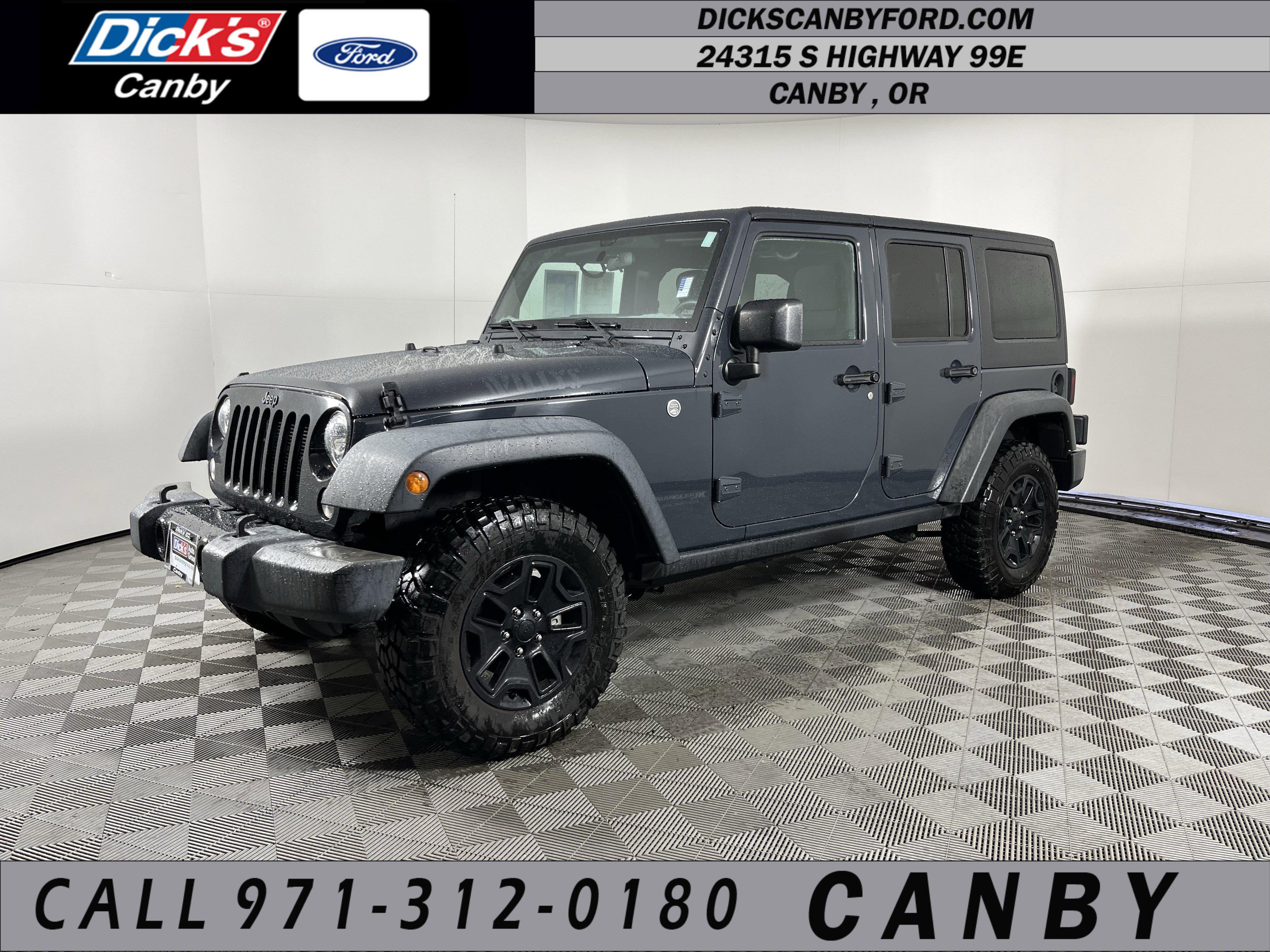 KBB.com 10 Most Awarded Brands. Only 57,901 Miles! Boasts 20 Highway MPG and 16 City MPG! This Jeep Wrangler JK Unlimited boasts a Regular Unleaded V-6 3.6 L/220 engine powering this Automatic transmission. TRANSMISSION: 5-SPEED AUTOMATIC (W5A580) -inc: Tip Start, Hill Descent Control, TRAILER TOW GROUP -inc: Class II Receiver Hitch, Trailer Tow w/4-Pin Connector Wiring, SWING GATE REINFORCEMENT.*This Jeep Wrangler JK Unlimited Comes Equipped with These Options *OVERSIZE SPARE TIRE CARRIER, LED LIGHTING GROUP -inc: LED Fog Lamps, LED Reflector Headlamps, ENGINE: 3.6L V6 24V VVT (STD), BLACK, CLOTH SEATS W/ADJUSTABLE HEAD RESTRAINTS, 3.73 REAR AXLE RATIO (STD), Variable Intermittent Wipers, Trip Computer, Transmission: 6-Speed Manual (NSG370), Towing Equipment -inc: Trailer Sway Control, Tires: LT255/75R17C BSW Off Road.* Stop By Today *Come in for a quick visit at Dick's Canby Ford, 24315 Hwy 99 East, Canby, OR 97013 to claim your Jeep Wrangler JK Unlimited!