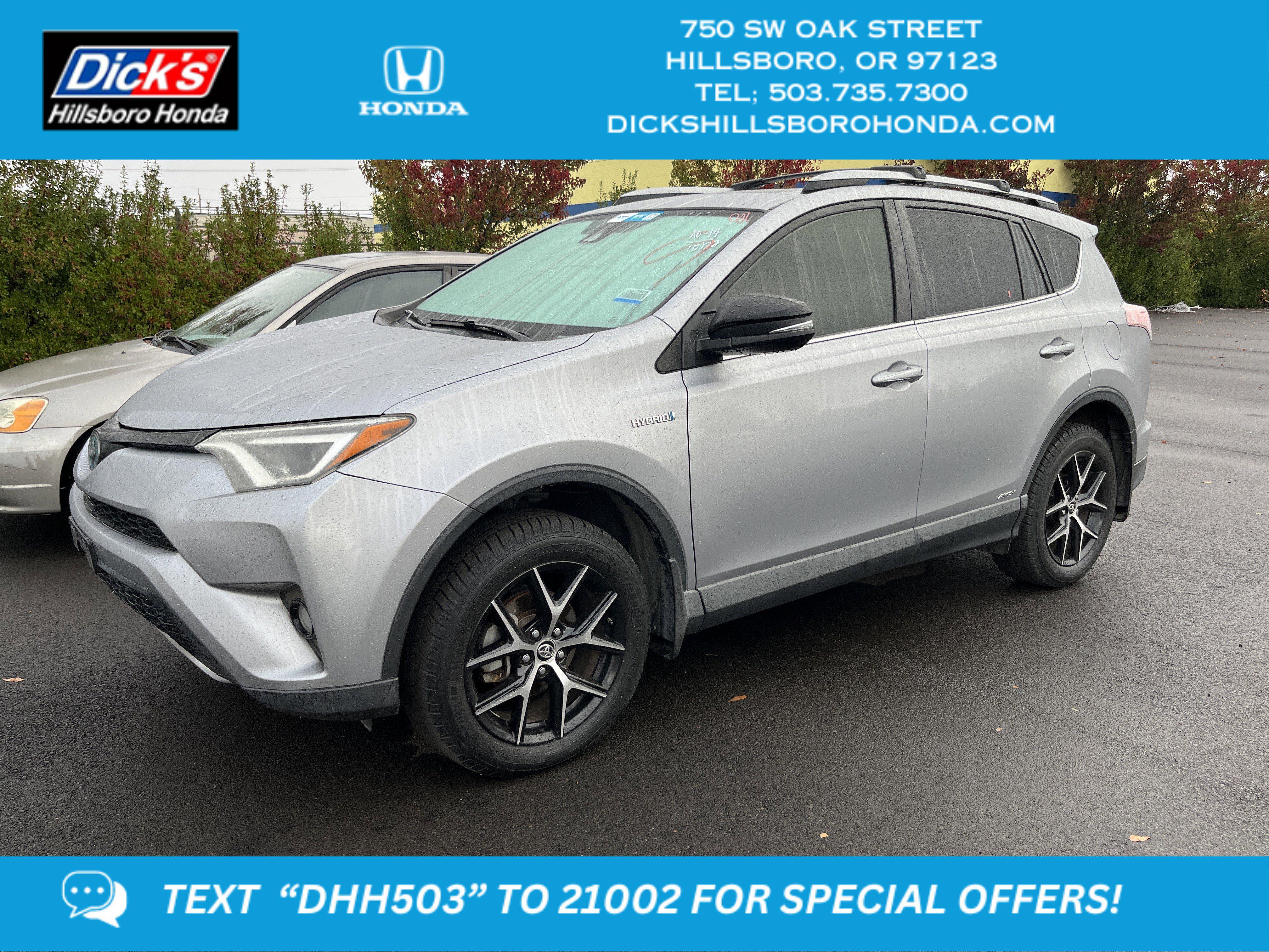 You won't find a nicer or better maintained RAV4 Hybrid on the market in this price range!! 2018 Toyota RAV4 Hybrid SE Silver Sky Metallic AWD CVT 2.5L 4-Cylinder1-OWNER!, CLEAN CARFAX: NO ACCIDENTS, LEATHER INTERIOR, GPS NAVIGATION, FULLY SERVICED/MAINTAINED, 2.5L 4-Cylinder, Radio: Premium JBL Audio w/Navigation, 4-Wheel Disc Brakes, 6 Speakers, ABS brakes, Air Conditioning, Alloy wheels, AM/FM radio: SiriusXM, Auto High-beam Headlights, Automatic temperature control, Axle Ratio: 3.542, Brake assist, Bumpers: body-color, CD player, Compass, Driver door bin, Driver vanity mirror, Dual front impact airbags, Dual front side impact airbags, Electronic Stability Control, Exterior Parking Camera Rear, Four wheel independent suspension, Front anti-roll bar, Front Bucket Seats, Front Center Armrest, Front dual zone A/C, Front fog lights, Front reading lights, Fully automatic headlights, Heated door mirrors, Heated front seats, Heated Front Sport Seats, Illuminated entry, Knee airbag, Leather Shift Knob, Leather steering wheel, Low tire pressure warning, Navigation System, Occupant sensing airbag, Outside temperature display, Overhead airbag, Overhead console, Panic alarm, Passenger door bin, Passenger vanity mirror, Power door mirrors, Power driver seat, Power Liftgate, Power moonroof, Power steering, Power windows, Radio data system, Radio: Entune Audio Plus AM/FM/MP3/WMA Playback, Rear anti-roll bar, Rear seat center armrest, Rear window defroster, Rear window wiper, Remote keyless entry, Roof rack: rails only, SofTex Synthetic Trim, Speed control, Speed-sensing steering, Split folding rear seat, Spoiler, Steering wheel mounted audio controls, Telescoping steering wheel, Tilt steering wheel, Traction control, Trip computer, Turn signal indicator mirrors, Variably intermittent wipers, Wheels: 18 Sport Aluminum Alloy, **APPLE CARPLAY/ ANDROID**, **AUTOMATIC HEADLIGHTS**, **BACKUP CAMERA**, **BLINDSPOT MONITOR**, **BLUETOOTH**, **KEYLESS ACCESS W/ PUSHBUTTON START**, **LANE KEEPING ASSIST**, **NAVIGATION**, **TOUCHSCREEN CONTROLS**, 2.5L 4-Cylinder, Radio: Premium JBL Audio w/Navigation.Recent Arrival!34/30 City/Highway MPGCome to www.dickshillsborohonda.com To See Our Specials!! Call us at (503) 735-7310 For help with any of our departments!! We gave it a full lube-oil-filter service, pressure tested the coolant/antifreeze system for leaks & protection, checked the brakes & tires, checked all parts/systems for excessive wear & tear, topped off needed fluids, detailed the vehicle and gave it a thorough diagnostic/frame/safey inspection!Awards:* 2018 KBB.com 10 Best SUVs Under $25,000 * 2018 KBB.com 10 Most Awarded Brands * 2018 KBB.com Best Resale Value Awards