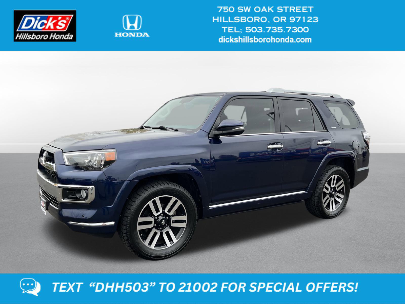 Third Row Seat!! 2019 Toyota 4Runner Limited Nautical Blue Metallic 4WD 5-Speed Automatic with Overdrive 4.0L V6 SMPI DOHC**NEW TIRES**, **NEW BRAKES**, LEATHER INTERIOR, 4WD, Black Graphite w/Leather Seat Trim, All-Weather Floor Liners/Cargo Tray Package, Auto-Dimming Rear-View Mirror, Body Color Heated Mirrors, Garage Door Opener, Limited Package, Moonroof w/Tilt Up & Slide, Right & Left Individual Air Conditioner, Silver Roof Rails, 15 Speakers, 20 x 7.5 Unique Dual 6-Spoke Alloy Wheels, 3.727 Axle Ratio, 4-Wheel Disc Brakes, ABS brakes, Air Conditioning, Alloy wheels, AM/FM radio: SiriusXM, Anti-whiplash front head restraints, Auto-dimming Rear-View mirror, Automatic temperature control, Brake assist, Bumpers: body-color, CD player, Compass, Delay-off headlights, Driver door bin, Driver vanity mirror, Dual front impact airbags, Dual front side impact airbags, Electronic Stability Control, Emergency communication system: Safety Connect, Exterior Parking Camera Rear, Front anti-roll bar, Front Bucket Seats, Front Center Armrest, Front dual zone A/C, Front fog lights, Front reading lights, Front wheel independent suspension, Fully automatic headlights, Garage door transmitter: HomeLink, Heated door mirrors, Heated front seats, Heated/Ventilated Front Bucket Seats, Illuminated entry, Knee airbag, Leather Seat Trim, Low tire pressure warning, Memory seat, Navigation System, Occupant sensing airbag, Outside temperature display, Overhead airbag, Overhead console, Panic alarm, Passenger door bin, Passenger vanity mirror, Power door mirrors, Power driver seat, Power moonroof, Power passenger seat, Power steering, Power windows, Radio: Entune Premium JBL Audio w/Navigation, Rear anti-roll bar, Rear seat center armrest, Rear window defroster, Rear window wiper, Remote keyless entry, Roof rack: rails only, Security system, Speed control, Speed-sensing steering, Split folding rear seat, Spoiler, Steering wheel mounted audio controls, Tachometer, Telescoping steering wheel, Tilt steering wheel, Traction control, Trip computer, Turn signal indicator mirrors, Variably intermittent wipers, Ventilated front seats, **APPLE CARPLAY/ ANDROID**, **AUTOMATIC HEADLIGHTS**, **BACKUP CAMERA**, **BLINDSPOT MONITOR**, **BLUETOOTH**, **COLLISION AVOIDANCE **, **HEATED/COOLED SEATS**, **KEYLESS ACCESS W/ PUSHBUTTON START**, **LANE KEEPING ASSIST**, **NAVIGATION**, **TOUCHSCREEN CONTROLS**, THIRD ROW SEAT, 4WD, Black Graphite w/Leather Seat Trim, All-Weather Floor Liners/Cargo Tray Package, Auto-Dimming Rear-View Mirror, Body Color Heated Mirrors, Garage Door Opener, Limited Package, Moonroof w/Tilt Up & Slide, Right & Left Individual Air Conditioner, Silver Roof Rails.Recent Arrival!Come to www.dickshillsborohonda.com To See Our Specials!! Call us at (503) 735-7310 For help with any of our departments!! We gave it a full lube-oil-filter service, pressure tested the coolant/antifreeze system for leaks & protection, checked the brakes & tires, checked all parts/systems for excessive wear & tear, topped off needed fluids, detailed the vehicle and gave it a thorough diagnostic/frame/safey inspection!Awards:* 2019 KBB.com Best Resale Value Awards * 2019 KBB.com Brand Image Awards