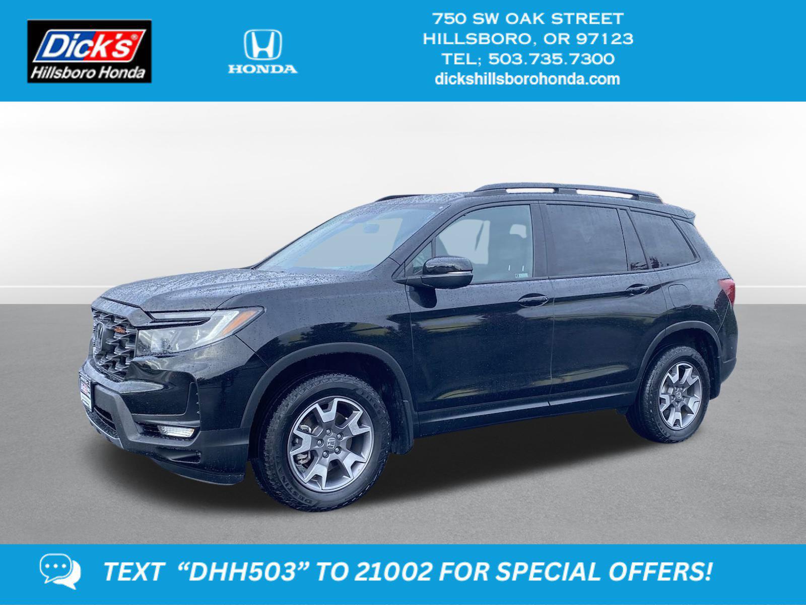 2022 Honda Passport TrailSport Crystal Black Pearl AWD 9-Speed Automatic 3.5L V6 24V SOHC i-VTEC1-OWNER!, CLEAN CARFAX: NO ACCIDENTS, LEATHER INTERIOR, **LOCAL TRADE-IN**, FULLY SERVICED/MAINTAINED, 4.334 Axle Ratio, 4-Wheel Disc Brakes, 7 Speakers, A/V remote: CabinControl, ABS brakes, Air Conditioning, Alloy wheels, AM/FM radio: SiriusXM, Apple CarPlay/Android Auto, Auto High-beam Headlights, Auto-dimming Rear-View mirror, Automatic temperature control, Blind Spot Information (BSI) System warning, Brake assist, Bumpers: body-color, Compass, Delay-off headlights, Driver door bin, Driver vanity mirror, Driver's Seat Mounted Armrest, Dual front impact airbags, Dual front side impact airbags, Electronic Stability Control, Emergency communication system: HondaLink Assist, Exterior Parking Camera Rear, Forward collision: Collision Mitigation Braking System (CMBS) + FCW mitigation, Four wheel independent suspension, Front anti-roll bar, Front Bucket Seats, Front Center Armrest, Front dual zone A/C, Front fog lights, Front reading lights, Fully automatic headlights, Garage door transmitter: HomeLink, Heated door mirrors, Heated Front Bucket Seats, Heated front seats, Illuminated entry, Lane departure: Lane Keeping Assist System (LKAS) active, Leather-Trimmed Seats w/Orange Stitching, Low tire pressure warning, Memory seat, Navigation system: Honda Satellite-Linked Navigation System, Occupant sensing airbag, Outside temperature display, Overhead airbag, Overhead console, Panic alarm, Passenger door bin, Passenger seat mounted armrest, Passenger vanity mirror, Power door mirrors, Power driver seat, Power Liftgate, Power moonroof, Power passenger seat, Power steering, Power windows, Radio data system, Radio: 215-Watt Audio System w/7 Speakers, Rear air conditioning, Rear anti-roll bar, Rear reading lights, Rear seat center armrest, Rear window defroster, Rear window wiper, Remote keyless entry, Roof rack: rails only, Security system, Speed control, Speed-sensing steering, Split folding rear seat, Spoiler, Steering wheel mounted audio controls, Tachometer, Telescoping steering wheel, Tilt steering wheel, Traction control, Trip computer, Turn signal indicator mirrors, Variably intermittent wipers, Wheels: 18 Machine-Finish Alloy.Recent Arrival!Come to www.dickshillsborohonda.com To See Our Specials!! Call us at (866) 973-3693 For help with any of our departments!! We gave it a full lube-oil-filter service, pressure tested the coolant/antifreeze system for leaks & protection, checked the brakes & tires, checked all parts/systems for excessive wear & tear, topped off needed fluids, detailed the vehicle and gave it a thorough diagnostic/frame/safey inspection!Awards:* ALG Residual Value Awards, Residual Value Awards This awd 2022 Honda Passport TrailSport is one of those used cars Portland, Hillsboro & Beaverton, OR shoppers seek out. This Honda Passport features a Crystal Black Pearl exterior with a Black Interior. With 37,349 miles this 2022 Passport with a 3.5 l engine and 9-speed automatic w/od transmission is your best buy near Portland, Hillsboro & Beaverton, Oregon.*TECHNOLOGY FEATURES:* GPS System, Remote Engine Start, Navigation System, Keyless Start, Bluetooth Connection, Garage Door Opener, SiriusXM Satellite Radio, Smart Device Integration, HD Radio, Keyless Entry. Your Crystal Black Pearl 2022 Honda Passport TrailSport near Beaverton is available for immediate test drives in Hillsboro, OR.*Our Car Dealership near Portland:* Call Dicks Hillsboro Honda today at *(503) 616-4532 TO SCHEDULE YOUR TEST DRIVE* of this 2022 Honda Passport TrailSport! Dicks Hillsboro Honda serves Portland, Hillsboro & Beaverton, OR. You can also visit us at, 750 SW Oak St. Hillsboro OR, 97123 to check it out in person! Dicks Hillsboro Honda Used car dealership only sells used cars Beaverton, OR buyers can trust for safety and worry free driving.*MECHANICAL FEATURES:* This Honda Passport comes factory equipped with an impressive 3.5 l engine, an 9-speed automatic w/od transmission. Other installed mechanical features include Power One-touch Down windows, All Wheel Drive, Heated Mirrors, Push Button Start, Power Mirrors, Power Locks, Traction Control, Locking Rear Differential, Power Passenger Seat, Cruise Control, Ventilated Disc Brakes, Intermittent Wipers, Trip Computer, Remote Trunk Release, Tires - Rear All-Season, Variable Speed Intermittent Wipers, Power Steering, Tires - Front All-Season. Dicks Hillsboro Honda is Northwest Oregon's only location where you can test drive a new, used, or Certified car. That's why more Oregon used car shoppers and owners drive to Dicks Hillsboro Honda in Hillsboro for used cars, trucks & SUVs sales, service, parts, and accessories.*INTERIOR OPTIONS:* Dual Power Seats, Automatic Climate Control, Moon Roof, Leather Seats, Heated Front Seats, Power Drivers Seat, Leather Wrapped Steering Wheel, Adjustable Lumbar Seats, Memory Seats, Pass-Through Rear Seat, Air Conditioning, Driver Illuminated Vanity Mirror, Steering Wheel Audio Controls, Memory Mirrors, Bucket Front Seats, Multi-zone Climate Control, Passenger Illuminated Visor Mirror, Auto Dimming R/V Mirror, Rear Window Defroster, Tilt Steering Wheel, Vanity Mirrors, Bench Seats, AM/FM Stereo, Auxiliary Audio Input, Floor Mats, Trip Odometer*EXTERIOR OPTIONS:* Fog Lights, Aluminum Wheels, Power Hands-Free Liftgate, Power Folding Mirrors, Privacy Glass, Auto Headlamp, Spoiler, Spare Tire *Small Size**SAFETY OPTIONS:* Lane Departure Warning, Electronic Stability Control, Rear Parking Aid, Blind Spot Monitoring, Back-Up Camera, Cross Traffic Alerts, Lane Keeping Assist System, Integrated Turn Signal Mirrors, Brake Assist, Daytime Running Lights, Security System, LED Headlights, Front Collision Mitigation, Adaptive Cruise Control, Tire Pressure Monitoring System, ABS Brakes, Rear Air Bag, Drivers Air Bag, Passenger Air Bag Sensor, Driver Front Side Impact Air Bag, Child Proof Locks, Front Head Air Bag. This 2022 Honda Passport TrailS