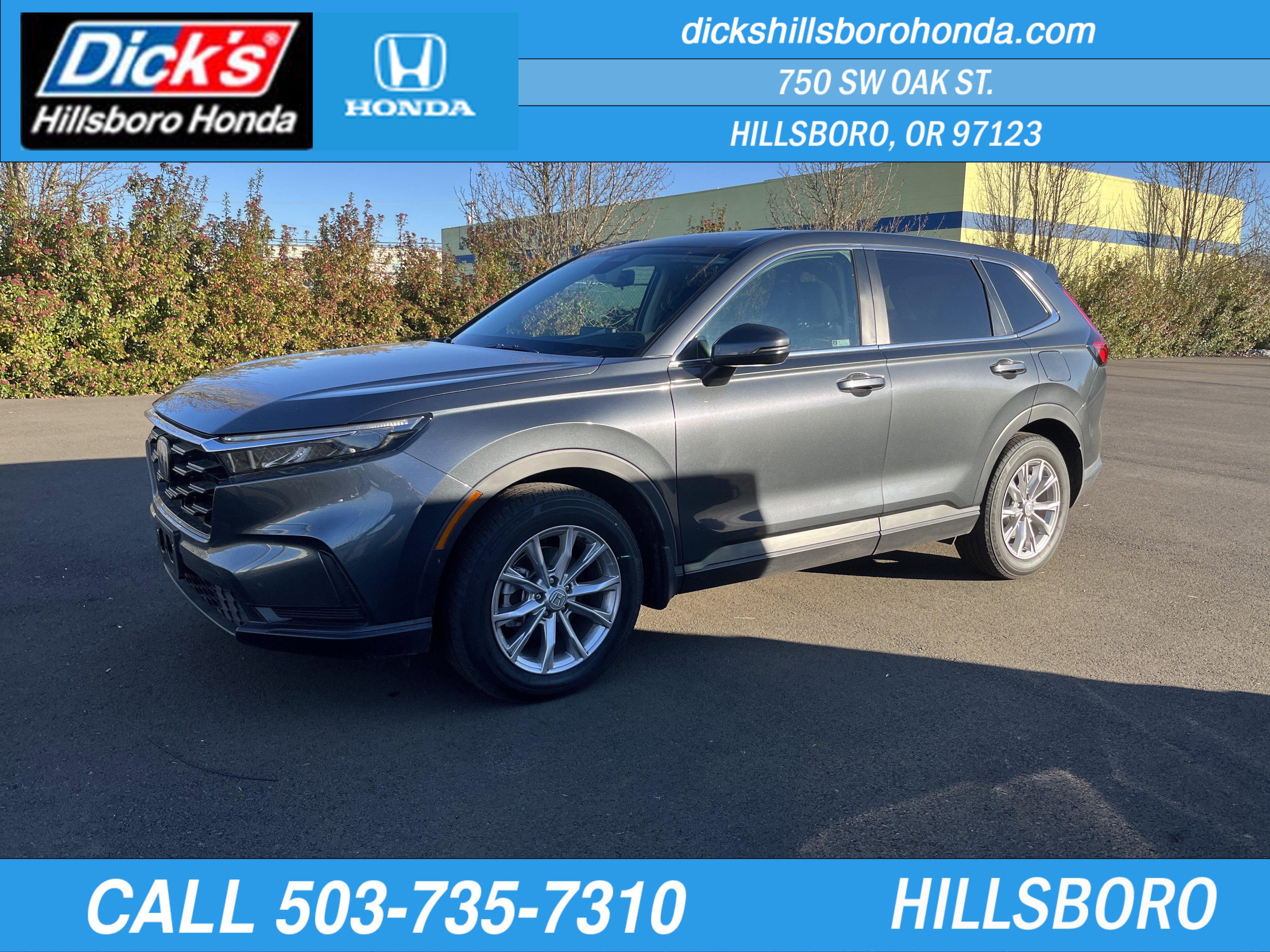 They upgraded & you save on this local, one owner gem with fantastic service history. 18k miles of full factory warranty left! 2023 Honda CR-V EX Meteorite Gray Metallic AWD CVT 1.5L I4 DOHC 16V1-OWNER!, CLEAN CARFAX: NO ACCIDENTS, **LOCAL TRADE**, FULLY SERVICED/MAINTAINED, AWD, 4-Wheel Disc Brakes, 5.64 Axle Ratio, 6 Speakers, ABS brakes, Adaptive Cruise Control: Adaptive Cruise Control (ACC) with Low-Speed Follow, Air Conditioning, Alloy wheels, Apple CarPlay/Android Auto, Auto High-beam Headlights, Automatic temperature control, Brake assist, Bumpers: body-color, Cloth Seat Trim, Compass, Delay-off headlights, Driver door bin, Driver vanity mirror, Dual front impact airbags, Dual front side impact airbags, Electronic Stability Control, Exterior Parking Camera Rear, Four wheel independent suspension, Front anti-roll bar, Front Bucket Seats, Front Center Armrest, Front dual zone A/C, Front reading lights, Fully automatic headlights, Heated door mirrors, Heated Front Bucket Seats, Heated front seats, Illuminated entry, Knee airbag, Low tire pressure warning, Occupant sensing airbag, Outside temperature display, Overhead airbag, Overhead console, Panic alarm, Passenger door bin, Passenger vanity mirror, Power door mirrors, Power driver seat, Power moonroof, Power steering, Power windows, Radio data system, Radio: 240-Watt AM/FM Audio System, Rear anti-roll bar, Rear reading lights, Rear seat center armrest, Rear side impact airbag, Rear window defroster, Rear window wiper, Remote keyless entry, Security system, Speed control, Speed-sensing steering, Speed-Sensitive Wipers, Split folding rear seat, Spoiler, Steering wheel mounted audio controls, Tachometer, Telescoping steering wheel, Tilt steering wheel, Traction control, Trip computer, Turn signal indicator mirrors, Variably intermittent wipers, Wheels: 18 Sparkle Silver Metallic, AWD.Recent Arrival!27/32 City/Highway MPGCome to www.dickshillsborohonda.com To See Our Specials!! Call us at (503) 735-7310 For help with any of our departments!! We gave it a full lube-oil-filter service, pressure tested the coolant/antifreeze system for leaks & protection, checked the brakes & tires, checked all parts/systems for excessive wear & tear, topped off needed fluids, detailed the vehicle and gave it a thorough diagnostic/frame/safey inspection!