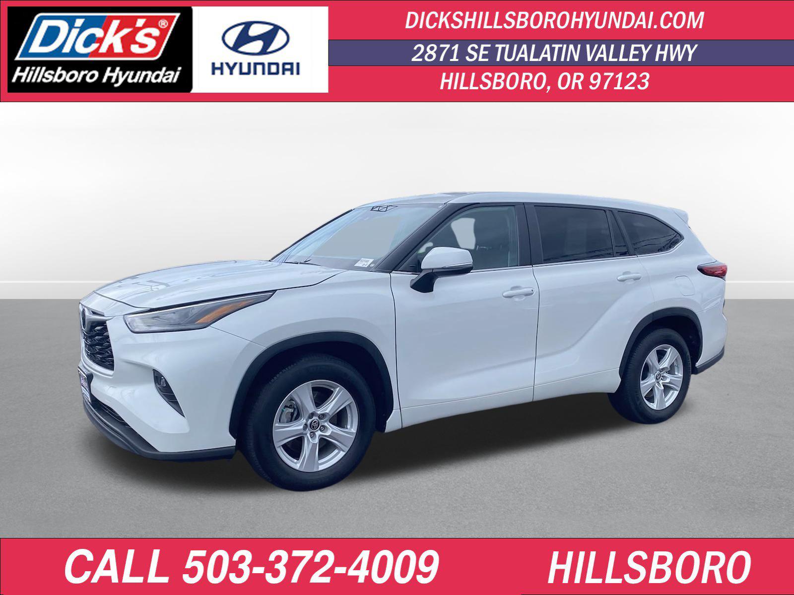 2023 Toyota Highlander L FWD 2.4L I4 PDI Turbocharged DOHC 16V LEV3-SULEV30 265hp 8-Speed Automatic18 Painted Alloy Wheels, 3.329 Axle Ratio, 3rd row seats: split-bench, 4-Wheel Disc Brakes, 6 Speakers, ABS brakes, Air Conditioning, Alloy wheels, AM/FM radio: SiriusXM, Auto High-beam Headlights, Automatic temperature control, Brake assist, Bumpers: body-color, Delay-off headlights, Driver door bin, Driver vanity mirror, Dual front impact airbags, Dual front side impact airbags, Electronic Stability Control, Emergency communication system: Safety Connect (up to 10-year trial subscription), Engine Immobilizer, Exterior Parking Camera Rear, Fabric Seat Trim, Four wheel independent suspension, Front anti-roll bar, Front Bucket Seats, Front Center Armrest, Front dual zone A/C, Front reading lights, Fully automatic headlights, Heated door mirrors, Illuminated entry, Knee airbag, Low tire pressure warning, Occupant sensing airbag, Outside temperature display, Overhead airbag, Overhead console, Panic alarm, Passenger door bin, Passenger vanity mirror, Power door mirrors, Power driver seat, Power steering, Power windows, Radio: 8 Toyota Audio Multimedia, Rear air conditioning, Rear anti-roll bar, Rear reading lights, Rear seat center armrest, Rear window defroster, Rear window wiper, Reclining 3rd row seat, Remote keyless entry, Speed control, Speed-sensing steering, Split folding rear seat, Spoiler, Steering wheel mounted audio controls, Tachometer, Telescoping steering wheel, Tilt steering wheel, Traction control, Trip computer, Turn signal indicator mirrors, Variably intermittent wipers.Clean CARFAX.You make the drive, we'll make the deal! Come to www.dickshillsborohyundai.com To See Our Specials!! Call us at 503-608-7456 For help with any of our departments!!