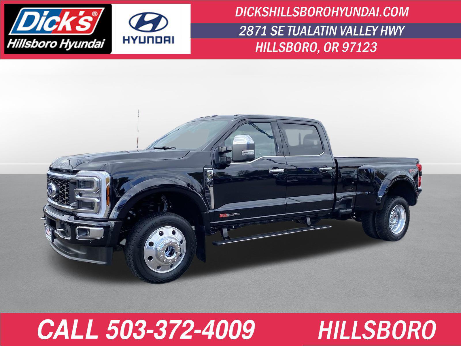 2024 Ford F-450SD Platinum Agate Black Metallic 4WD 6.7L High Output Power Stroke V8 Diesel 10-Speed AutomaticLIKE BRAND NEW, Built in Kentucky like the rest.1-OWNER!, CLEAN CARFAX: NO ACCIDENTS, LEATHER INTERIOR, GPS NAVIGATION, 4WD, Order Code 773A, Twin Panel Power Moonroof, 14 Speakers, 19.5 Forged Polished Aluminum Wheels, 4-Wheel Disc Brakes, ABS brakes, Adjustable pedals, Air Conditioning, Alloy wheels, AM/FM radio: SiriusXM with 360L, Auto High-beam Headlights, Auto tilt-away steering wheel, Auto-dimming Rear-View mirror, Automatic temperature control, Brake assist, Bumpers: body-color, Compass, Delay-off headlights, Driver door bin, Driver vanity mirror, Dual front impact airbags, Dual front side impact airbags, Dual rear wheels, Electronic Stability Control, Emergency communication system: SYNC 4 911 Assist, Exterior Parking Camera Rear, Flow-Through Console, Front anti-roll bar, Front Bucket Seats, Front Center Armrest, Front dual zone A/C, Front fog lights, Front reading lights, Fully automatic headlights, FX4 Off-Road Package, Garage door transmitter, GVWR: 14,000 lb Payload Package, Heads-Up Display, Heated door mirrors, Heated front seats, Heated rear seats, Heated steering wheel, Hill Descent Control, Illuminated entry, Leather steering wheel, Limited Slip w/4.30 Axle Ratio, Memory seat, Navigation system: Connected Navigation (includes complimentary 1-year trial), Off-Road Specifically Tuned Shock Absorbers, Outside temperature display, Overhead airbag, Overhead console, Panic alarm, Passenger door bin, Passenger vanity mirror, Pedal memory, Power door mirrors, Power driver seat, Power passenger seat, Power steering, Power windows, Radio: B&O Unleashed Sound System by Bang & Olufsen, Rain sensing wipers, Rear anti-roll bar, Rear reading lights, Rear seat center armrest, Rear step bumper, Rear window defroster, Remote keyless entry, Security system, SiriusXM Radio w/360L, Speed control, Split folding rear seat, Steering wheel memory, Steering wheel mounted A/C controls, Steering wheel mounted audio controls, SYNC 4 w/Enhanced Voice Recognition, Tachometer, Telescoping steering wheel, Tilt steering wheel, Traction control, Trip computer, Turn signal indicator mirrors, Unique FX4 Off-Road Box Decal, Unique Platinum Leather 40/Console/40 Seats, Variably intermittent wipers, Ventilated front seats, 4WD, Order Code 773A, Twin Panel Power Moonroof.CARFAX One-Owner. Clean CARFAX.You make the drive, we'll make the deal! Come to www.dickshillsborohyundai.com To See Our Specials!! Call us at 503-608-7456 For help with any of our departments!!