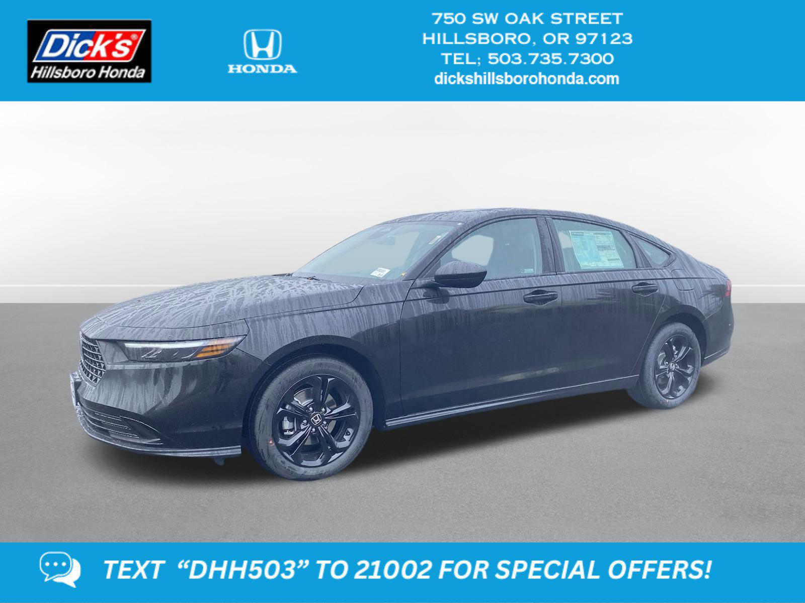 2025 Honda Accord SE Crystal Black Pearl FWD CVT 1.5T I4 DOHC 16V Turbocharged VTECBlack Cloth, 4-Wheel Disc Brakes, 8 Speakers, ABS brakes, Adaptive Cruise Control: Adaptive Cruise Control (ACC) with Low-Speed Follow, Air Conditioning, Alloy wheels, AM/FM radio, Apple CarPlay/Android Auto, Auto High-beam Headlights, Automatic temperature control, Blind Spot Information (BSI) System warning, Brake assist, Bumpers: body-color, Compass, Delay-off headlights, Driver door bin, Driver vanity mirror, Dual front impact airbags, Dual front side impact airbags, Electronic Stability Control, Emergency communication system: HondaLink, Exterior Parking Camera Rear, Fabric Seat Trim, Four wheel independent suspension, Front anti-roll bar, Front Bucket Seats, Front Center Armrest, Front dual zone A/C, Front reading lights, Fully automatic headlights, Heated door mirrors, Heated Front Bucket Seats, Heated front seats, Illuminated entry, Knee airbag, Lane departure: Lane Keeping Assist System (LKAS) active, Low tire pressure warning, Occupant sensing airbag, Outside temperature display, Overhead airbag, Overhead console, Panic alarm, Passenger door bin, Passenger vanity mirror, Power door mirrors, Power driver seat, Power moonroof, Power steering, Power windows, Radio data system, Radio: 180-Watt Audio System, Rear anti-roll bar, Rear reading lights, Rear seat center armrest, Rear side impact airbag, Rear window defroster, Remote keyless entry, Security system, Speed control, Speed-sensing steering, Speed-Sensitive Wipers, Split folding rear seat, Steering wheel mounted audio controls, Tachometer, Telescoping steering wheel, Tilt steering wheel, Traction control, Trip computer, Variably intermittent wipers, Wheels: 17 x 7.5J Berlina Black, Black Cloth.Recent Arrival! 29/37 City/Highway MPGThis 2025 Honda Accord SE features a Crystal Black Pearl exterior with a Black interior. Factory equipped with an impressive 1.5 l, and a cvt w/od transmission with fwd.*DESIRABLE FEATURES:* Remote start, Turbocharged, Backup camera, Heated seating, Bluetooth, Moonroof, WiFi capability, Multi-zone AC. Your 2025 Honda Accord SE is one of 15 other models like this in stock Beaverton drivers will find available to test drive at our new vehicle showroom in Hillsboro, OR. This Honda Accord is perfect for any ones car needs in our neighboring communities of Portland, Hillsboro & Beaverton, OR.*TECHNOLOGY FEATURES:* This Honda Accord for sale near Portland includes GPS System, WiFi Mobile Hotspot, Remote Engine Start, Keyless Start, Smart Device Integration, Bluetooth Connection, Keyless Entry.*Our Honda Dealership:* Call Dicks Hillsboro Honda today at *(503) 616-4532 to schedule your test drive* of this 2025 Honda Accord SE! Dicks Hillsboro Honda features a wide selection of new Honda vehicles for sale near Portland, Hillsboro & Beaverton Oregon. You can also visit us at, 750 SW Oak St. Hillsboro OR, 97123 to check it out in person!*MECHANICAL FEATURES:* Installed mechanical features include Power One-touch Down windows, Turbocharged Engine, Push Button Start, Heated Mirrors, Power Mirrors, Front Wheel Drive, Power Locks, Traction Control, Ventilated Disc Brakes, Cruise Control, Intermittent Wipers, Trip Computer, Power Steering, Tires - Rear Performance, Tires - Front Performance, Variable Speed Intermittent Wipers*INTERIOR OPTIONS:* Automatic Climate Control, Heated Front Seats, Moon Roof, Adjustable Lumbar Seats, Cloth Seats, Power Drivers Seat, Bucket Front Seats, Driver Illuminated Vanity Mirror, Steering Wheel Audio Controls, Air Conditioning, Pass-Through Rear Seat, Multi-zone Climate Control, Passenger Illuminated Visor Mirror, Bench Seats, Auxiliary Audio Input, Rear Window Defroster, Vanity Mirrors, Tilt Steering Wheel, AM/FM Stereo, Trip Odometer, Floor Mats. Beaverton new Honda dealers simply cannot compete with Dicks Hillsboro Honda attention to stocking Honda cars, trucks & SUVs with the most popular interior options.*EXTERIOR OPTIONS:* Aluminum Wheels, Auto Headlamp, Spare Tire *Small Size**SAFETY OPTIONS:* Electronic Stability Control, Cross Traffic Alerts, Lane Keeping Assist System, Blind Spot Monitoring, Lane Departure Warning, Back-Up Camera, Brake Assist, Cruise Control Steering Assist, Driver Restriction Features, Front Collision Mitigation, LED Headlights, Daytime Running Lights, Security System, Adaptive Cruise Control, Drivers Air Bag, Tire Pressure Monitoring System, Rear Air Bag, Knee AirBag, ABS Brakes, Driver Alert System, Front Head Air Bag, Passenger Air Bag Sensor, Driver Front Side Impact Air Bag, Child Proof LocksOREGON'S BEST HONDA FINANCIAL CREDIT FINANCE RATES: are right here at Dicks Hillsboro Honda Hillsboro Dealership where we offer the most competitive Honda Financial finance rates near Portland for new & Certified Honda Financial Financing. Our brand Finance experts have solutions for everyone including bad credit car loans or first time buyer financing programs.Dicks Hillsboro Honda New Honda dealership in Northwest Oregon is an easy drive or fly in from anywhere in the United States. Our Honda dealership sits just west of Beaverton.When choosing Honda dealers Portland shoppers prefer the short drive to Hillsboro where Dick's Hillsboro Honda has a new Honda Superstore and has the best customer service. We're glad you found this new Honda Accord for sale at our Honda dealership near you in Beaverton in Hillsboro, OR. Looking for Honda financing? Our Dicks Hillsboro Honda finance specialist will find the best rates available for this new Honda Accord for sale. Dicks Hillsboro Honda has new cars for sale and used cars for sale in Hillsboro just west of Portland.