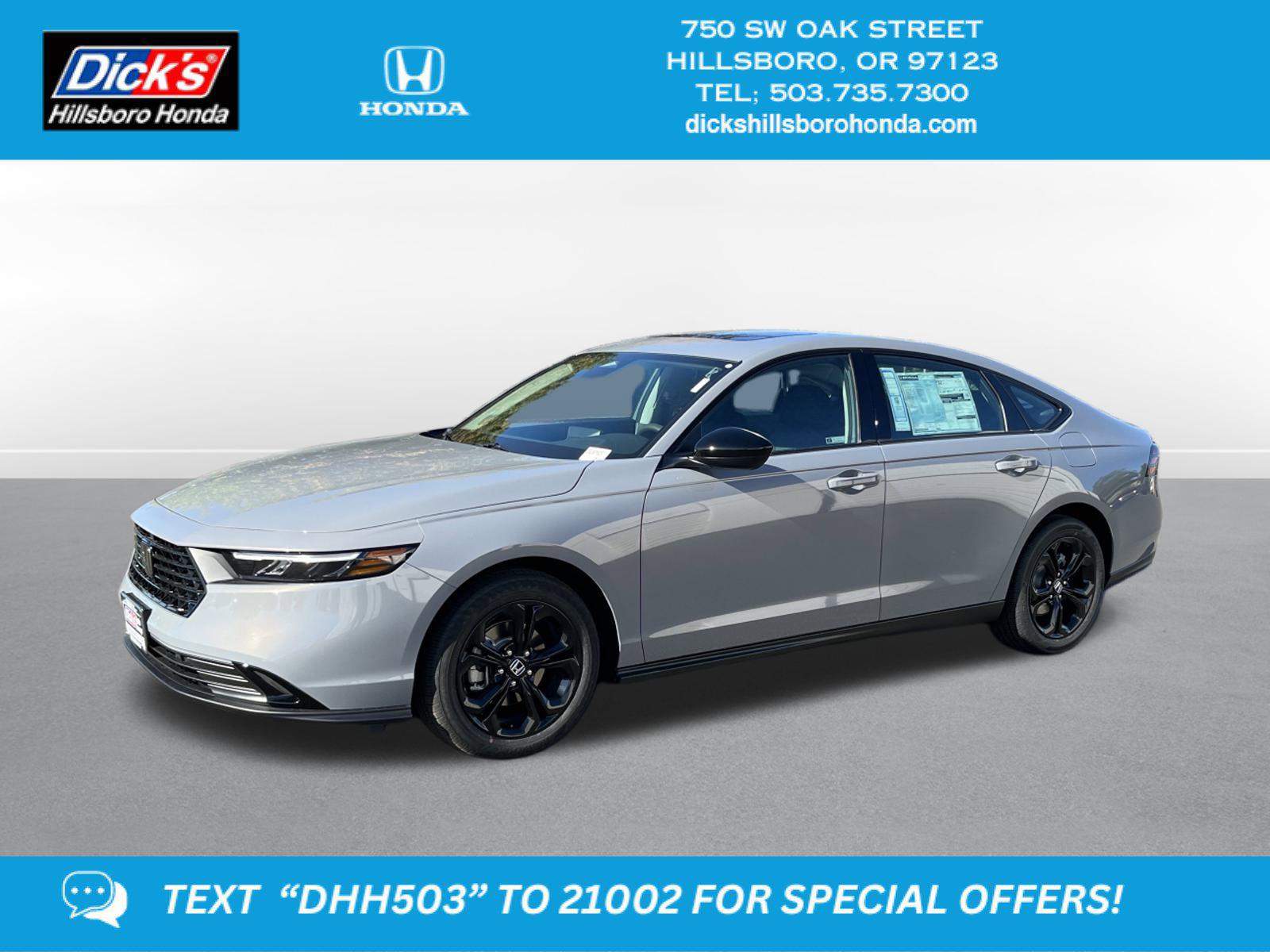 2025 Honda Accord SE Urban Gray Pearl FWD CVT 1.5T I4 DOHC 16V Turbocharged VTECBlack Cloth, 4-Wheel Disc Brakes, 8 Speakers, ABS brakes, Adaptive Cruise Control: Adaptive Cruise Control (ACC) with Low-Speed Follow, Air Conditioning, Alloy wheels, AM/FM radio, Apple CarPlay/Android Auto, Auto High-beam Headlights, Automatic temperature control, Blind Spot Information (BSI) System warning, Brake assist, Bumpers: body-color, Compass, Delay-off headlights, Driver door bin, Driver vanity mirror, Dual front impact airbags, Dual front side impact airbags, Electronic Stability Control, Emergency communication system: HondaLink Assist, Exterior Parking Camera Rear, Fabric Seat Trim, Four wheel independent suspension, Front anti-roll bar, Front Bucket Seats, Front Center Armrest, Front dual zone A/C, Front reading lights, Fully automatic headlights, Heated door mirrors, Heated Front Bucket Seats, Heated front seats, Illuminated entry, Knee airbag, Lane departure: Lane Keeping Assist System (LKAS) active, Low tire pressure warning, Occupant sensing airbag, Outside temperature display, Overhead airbag, Overhead console, Panic alarm, Passenger door bin, Passenger vanity mirror, Power door mirrors, Power driver seat, Power moonroof, Power steering, Power windows, Radio data system, Radio: 180-Watt Audio System, Rear anti-roll bar, Rear reading lights, Rear seat center armrest, Rear side impact airbag, Rear window defroster, Remote keyless entry, Security system, Speed control, Speed-sensing steering, Speed-Sensitive Wipers, Split folding rear seat, Steering wheel mounted audio controls, Tachometer, Telescoping steering wheel, Tilt steering wheel, Traction control, Trip computer, Variably intermittent wipers, Wheels: 17 x 7.5J Berlina Black, Black Cloth.29/37 City/Highway MPGThis 2025 Honda Accord Sedan SE features a Urban Gray Pearl exterior with a Black interior. Factory equipped with an impressive 1.5 l, and an cvt w/od transmission with fwd.*DESIRABLE FEATURES:* Backup camera, Turbocharged, Heated seating, Bluetooth, WiFi capability, Moonroof, Multi-zone AC. Your 2025 Honda Accord Sedan SE is one of 3 other models like this in stock Beaverton drivers will find available to test drive at our new vehicle showroom in Hillsboro, OR. This Honda Accord Sedan is perfect for any ones car needs in our neighboring communities of Portland, Hillsboro & Beaverton, OR.*TECHNOLOGY FEATURES:* This Honda Accord Sedan for sale near Portland includes WiFi Mobile Hotspot, GPS System, Keyless Start, Smart Device Integration, Bluetooth Connection, Keyless Entry.*Our Honda Dealership in Hillsboro:* Call Dicks Hillsboro Honda today at *503-735-7310 to schedule your test drive* of this 2025 Honda Accord Sedan SE! Dicks Hillsboro Honda features a wide selection of new Honda vehicles for sale near Portland, Hillsboro & Beaverton Oregon. You can also visit us at, 750 SW Oak St. Hillsboro OR, 97123 to check it out in person!*MECHANICAL FEATURES:* Installed mechanical features include Power One-touch down windows, Heated Mirrors, Push Button Start, Turbocharged Engine, Front Wheel Drive, Power Locks, Traction Control, Power Mirrors, Ventilated Disc Brakes, Cruise Control, Intermittent Wipers, Tires - Rear Performance, Tires - Front Performance, Trip Computer, Power Steering, Variable Speed Intermittent Wipers*INTERIOR OPTIONS:* Heated Front Seats, Automatic Climate Control, Moon Roof, Cloth Seats, Power Drivers Seat, Adjustable Lumbar Seats, Steering Wheel Audio Controls, Bucket Front Seats, Driver Illuminated Vanity Mirror, Pass-Through Rear Seat, Air Conditioning, Passenger Illuminated Visor Mirror, Multi-zone Climate Control, Rear Window Defroster, Auxiliary Audio Input, Bench Seats, Vanity Mirrors, Trip Odometer, Tilt Steering Wheel, AM/FM Stereo, Floor Mats. Beaverton new Honda dealers simply cannot compete with Dicks Hillsboro Honda attention to stocking Honda cars, trucks & SUVs with the most popular interior options.*EXTERIOR OPTIONS:* Aluminum Wheels, Auto Headlamp, Spare Tire *Small Size**SAFETY OPTIONS:* Lane Keeping Assist System, Blind Spot Monitoring, Back-Up Camera, Lane Departure Warning, Electronic Stability Control, Cross Traffic Alerts, Adaptive Cruise Control, Restricted driving mode, LED Headlights, Daytime Running Lights, Cruise Control Steering Assist, Brake Assist, Security System, Front Collision Mitigation, Driver Alert System, Knee AirBag, Drivers Air Bag, Tire Pressure Monitoring System, ABS Brakes, Rear Air Bag, Child Proof Locks, Passenger Air Bag Sensor, Front Head Air Bag, Driver Front Side Impact Air BagOREGON'S BEST HONDA FINANCIAL CREDIT FINANCE RATES: are right here at Dicks Hillsboro Honda Hillsboro Dealership where we offer the most competitive Honda Financial finance rates near Portland for new & Certified Honda Financial Financing. Our brand Finance experts have solutions for everyone including bad credit car loans or first time buyer financing programs.Dicks Hillsboro Honda New Honda dealership in Northwest Oregon is an easy drive or fly in from anywhere in the United States. Our Honda dealership sits just west of Beaverton.When choosing Honda dealers Portland shoppers prefer the short drive to Hillsboro where Dick's Hillsboro Honda has a new Honda Superstore and has the best customer service. We're glad you found this new Honda Accord Sedan for sale at our Honda dealership near you in Beaverton in Hillsboro, OR. Looking for Honda financing? Our Dicks Hillsboro Honda finance specialist will find the best rates available for this new Honda Accord Sedan for sale. Dicks Hillsboro Honda has new cars for sale and used cars for sale in Hillsboro just west of Portland.