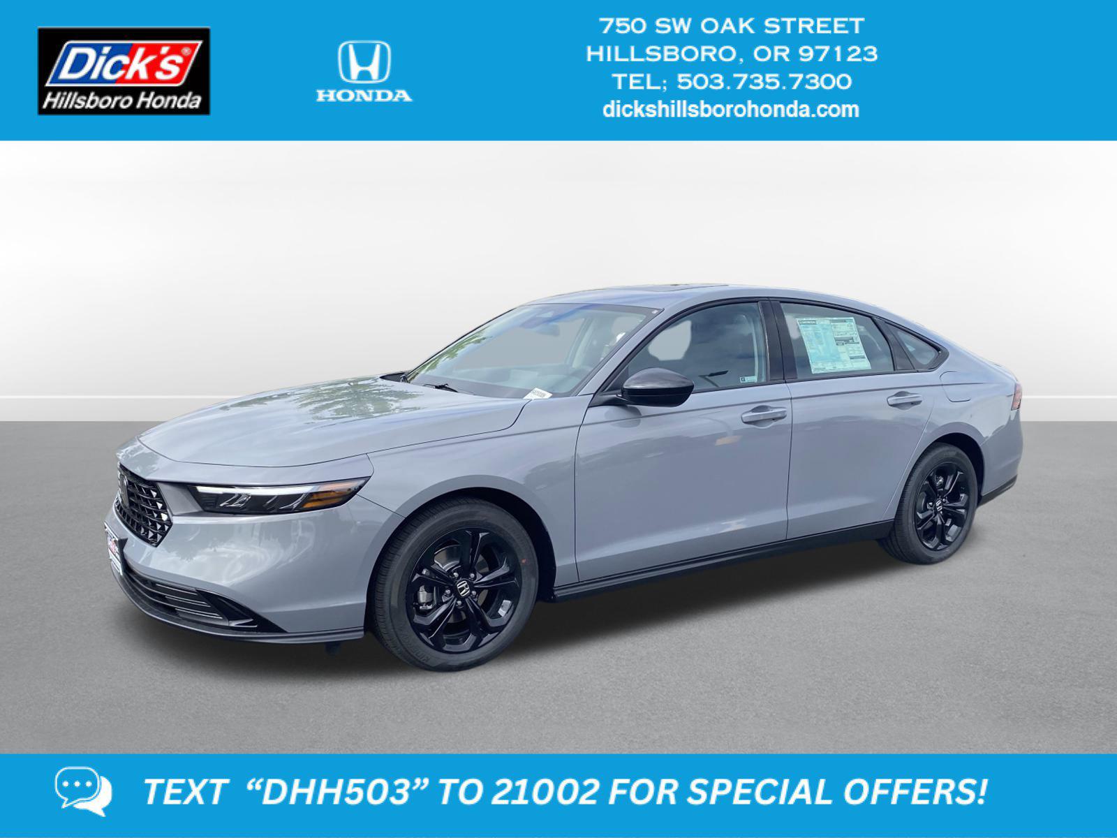 2025 Honda Accord SE Urban Gray Pearl FWD CVT 1.5T I4 DOHC 16V Turbocharged VTECBlack Cloth, 4-Wheel Disc Brakes, 8 Speakers, ABS brakes, Adaptive Cruise Control: Adaptive Cruise Control (ACC) with Low-Speed Follow, Air Conditioning, Alloy wheels, AM/FM radio, Apple CarPlay/Android Auto, Auto High-beam Headlights, Automatic temperature control, Blind Spot Information (BSI) System warning, Brake assist, Bumpers: body-color, Compass, Delay-off headlights, Driver door bin, Driver vanity mirror, Dual front impact airbags, Dual front side impact airbags, Electronic Stability Control, Emergency communication system: HondaLink Assist, Exterior Parking Camera Rear, Fabric Seat Trim, Four wheel independent suspension, Front anti-roll bar, Front Bucket Seats, Front Center Armrest, Front dual zone A/C, Front reading lights, Fully automatic headlights, Heated door mirrors, Heated Front Bucket Seats, Heated front seats, Illuminated entry, Knee airbag, Lane departure: Lane Keeping Assist System (LKAS) active, Low tire pressure warning, Occupant sensing airbag, Outside temperature display, Overhead airbag, Overhead console, Panic alarm, Passenger door bin, Passenger vanity mirror, Power door mirrors, Power driver seat, Power moonroof, Power steering, Power windows, Radio data system, Radio: 180-Watt Audio System, Rear anti-roll bar, Rear reading lights, Rear seat center armrest, Rear side impact airbag, Rear window defroster, Remote keyless entry, Security system, Speed control, Speed-sensing steering, Speed-Sensitive Wipers, Split folding rear seat, Steering wheel mounted audio controls, Tachometer, Telescoping steering wheel, Tilt steering wheel, Traction control, Trip computer, Variably intermittent wipers, Wheels: 17 x 7.5J Berlina Black, Black Cloth.29/37 City/Highway MPGThis 2025 Honda Accord SE features a Urban Gray Pearl exterior with a Black interior. Factory equipped with an impressive 1.5 l, and an cvt w/od transmission with fwd.*DESIRABLE FEATURES:* Backup camera, Turbocharged, Bluetooth, Heated seating, WiFi capability, Moonroof, Multi-zone AC. Your 2025 Honda Accord SE is one of 17 other models like this in stock Beaverton drivers will find available to test drive at our new vehicle showroom in Hillsboro, OR. This Honda Accord is perfect for any ones car needs in our neighboring communities of Portland, Hillsboro & Beaverton, OR.*TECHNOLOGY FEATURES:* This Honda Accord for sale near Portland includes WiFi Mobile Hotspot, GPS System, Keyless Start, Smart Device Integration, Bluetooth Connection, Keyless Entry.*Our Honda Dealership in Hillsboro:* Call Dicks Hillsboro Honda today at *503-735-7310 to schedule your test drive* of this 2025 Honda Accord SE! Dicks Hillsboro Honda features a wide selection of new Honda vehicles for sale near Portland, Hillsboro & Beaverton Oregon. You can also visit us at, 750 SW Oak St. Hillsboro OR, 97123 to check it out in person!*MECHANICAL FEATURES:* Installed mechanical features include Push Button Start, Heated Mirrors, Turbocharged Engine, Power One-touch down windows, Power Mirrors, Front Wheel Drive, Traction Control, Power Locks, Ventilated Disc Brakes, Cruise Control, Intermittent Wipers, Tires - Front Performance, Trip Computer, Variable Speed Intermittent Wipers, Power Steering, Tires - Rear Performance*INTERIOR OPTIONS:* Heated Front Seats, Automatic Climate Control, Moon Roof, Power Drivers Seat, Adjustable Lumbar Seats, Cloth Seats, Steering Wheel Audio Controls, Bucket Front Seats, Air Conditioning, Pass-Through Rear Seat, Driver Illuminated Vanity Mirror, Multi-zone Climate Control, Passenger Illuminated Visor Mirror, Auxiliary Audio Input, Rear Window Defroster, Tilt Steering Wheel, Trip Odometer, Vanity Mirrors, AM/FM Stereo, Floor Mats, Bench Seats. Beaverton new Honda dealers simply cannot compete with Dicks Hillsboro Honda attention to stocking Honda cars, trucks & SUVs with the most popular interior options.*EXTERIOR OPTIONS:* Aluminum Wheels, Auto Headlamp, Spare Tire *Small Size**SAFETY OPTIONS:* Electronic Stability Control, Blind Spot Monitoring, Lane Keeping Assist System, Lane Departure Warning, Back-Up Camera, Cross Traffic Alerts, Daytime Running Lights, Brake Assist, Front Collision Mitigation, Cruise Control Steering Assist, Restricted driving mode, Adaptive Cruise Control, Security System, LED Headlights, Knee AirBag, Tire Pressure Monitoring System, Rear Air Bag, Drivers Air Bag, Driver Alert System, ABS Brakes, Front Head Air Bag, Driver Front Side Impact Air Bag, Passenger Air Bag Sensor, Child Proof LocksOREGON'S BEST HONDA FINANCIAL CREDIT FINANCE RATES: are right here at Dicks Hillsboro Honda Hillsboro Dealership where we offer the most competitive Honda Financial finance rates near Portland for new & Certified Honda Financial Financing. Our brand Finance experts have solutions for everyone including bad credit car loans or first time buyer financing programs.Dicks Hillsboro Honda New Honda dealership in Northwest Oregon is an easy drive or fly in from anywhere in the United States. Our Honda dealership sits just west of Beaverton.When choosing Honda dealers Portland shoppers prefer the short drive to Hillsboro where Dick's Hillsboro Honda has a new Honda Superstore and has the best customer service. We're glad you found this new Honda Accord for sale at our Honda dealership near you in Beaverton in Hillsboro, OR. Looking for Honda financing? Our Dicks Hillsboro Honda finance specialist will find the best rates available for this new Honda Accord for sale. Dicks Hillsboro Honda has new cars for sale and used cars for sale in Hillsboro just west of Portland.