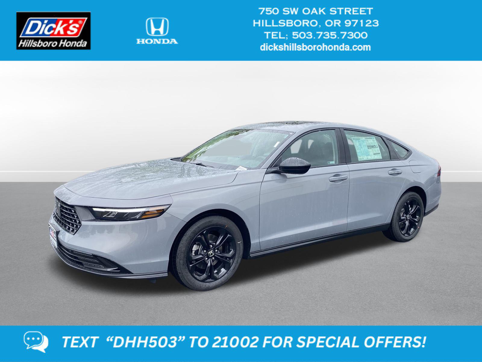2025 Honda Accord SE Urban Gray Pearl FWD CVT 1.5T I4 DOHC 16V Turbocharged VTECBlack Cloth, 4-Wheel Disc Brakes, 8 Speakers, ABS brakes, Adaptive Cruise Control: Adaptive Cruise Control (ACC) with Low-Speed Follow, Air Conditioning, Alloy wheels, AM/FM radio, Apple CarPlay/Android Auto, Auto High-beam Headlights, Automatic temperature control, Blind Spot Information (BSI) System warning, Brake assist, Bumpers: body-color, Compass, Delay-off headlights, Driver door bin, Driver vanity mirror, Dual front impact airbags, Dual front side impact airbags, Electronic Stability Control, Emergency communication system: HondaLink Assist, Exterior Parking Camera Rear, Fabric Seat Trim, Four wheel independent suspension, Front anti-roll bar, Front Bucket Seats, Front Center Armrest, Front dual zone A/C, Front reading lights, Fully automatic headlights, Heated door mirrors, Heated Front Bucket Seats, Heated front seats, Illuminated entry, Knee airbag, Lane departure: Lane Keeping Assist System (LKAS) active, Low tire pressure warning, Occupant sensing airbag, Outside temperature display, Overhead airbag, Overhead console, Panic alarm, Passenger door bin, Passenger vanity mirror, Power door mirrors, Power driver seat, Power moonroof, Power steering, Power windows, Radio data system, Radio: 180-Watt Audio System, Rear anti-roll bar, Rear reading lights, Rear seat center armrest, Rear side impact airbag, Rear window defroster, Remote keyless entry, Security system, Speed control, Speed-sensing steering, Speed-Sensitive Wipers, Split folding rear seat, Steering wheel mounted audio controls, Tachometer, Telescoping steering wheel, Tilt steering wheel, Traction control, Trip computer, Variably intermittent wipers, Wheels: 17 x 7.5J Berlina Black, Black Cloth.29/37 City/Highway MPGThis 2025 Honda Accord SE features a Urban Gray Pearl exterior with a Black interior. Factory equipped with an impressive 1.5 l, and an cvt w/od transmission with fwd.*DESIRABLE FEATURES:* Turbocharged, Backup camera, Bluetooth, WiFi capability, Heated seating, Moonroof, Multi-zone AC. Your 2025 Honda Accord SE is one of 19 other models like this in stock Beaverton drivers will find available to test drive at our new vehicle showroom in Hillsboro, OR. This Honda Accord is perfect for any ones car needs in our neighboring communities of Portland, Hillsboro & Beaverton, OR.*TECHNOLOGY FEATURES:* This Honda Accord for sale near Portland includes WiFi Mobile Hotspot, GPS System, Keyless Start, Bluetooth Connection, Smart Device Integration, Keyless Entry.*Our Honda Dealership in Hillsboro:* Call Dicks Hillsboro Honda today at *503-735-7310 to schedule your test drive* of this 2025 Honda Accord SE! Dicks Hillsboro Honda features a wide selection of new Honda vehicles for sale near Portland, Hillsboro & Beaverton Oregon. You can also visit us at, 750 SW Oak St. Hillsboro OR, 97123 to check it out in person!*MECHANICAL FEATURES:* Installed mechanical features include Heated Mirrors, Power One-touch down windows, Push Button Start, Turbocharged Engine, Front Wheel Drive, Power Locks, Traction Control, Power Mirrors, Ventilated Disc Brakes, Cruise Control, Intermittent Wipers, Power Steering, Variable Speed Intermittent Wipers, Trip Computer, Tires - Front Performance, Tires - Rear Performance*INTERIOR OPTIONS:* Heated Front Seats, Automatic Climate Control, Moon Roof, Power Drivers Seat, Adjustable Lumbar Seats, Cloth Seats, Bucket Front Seats, Driver Illuminated Vanity Mirror, Air Conditioning, Steering Wheel Audio Controls, Pass-Through Rear Seat, Passenger Illuminated Visor Mirror, Multi-zone Climate Control, Trip Odometer, Tilt Steering Wheel, Rear Window Defroster, Vanity Mirrors, Auxiliary Audio Input, Bench Seats, Floor Mats, AM/FM Stereo. Beaverton new Honda dealers simply cannot compete with Dicks Hillsboro Honda attention to stocking Honda cars, trucks & SUVs with the most popular interior options.*EXTERIOR OPTIONS:* Aluminum Wheels, Auto Headlamp, Spare Tire *Small Size**SAFETY OPTIONS:* Lane Keeping Assist System, Cross Traffic Alerts, Back-Up Camera, Blind Spot Monitoring, Electronic Stability Control, Lane Departure Warning, Security System, Restricted driving mode, LED Headlights, Adaptive Cruise Control, Cruise Control Steering Assist, Brake Assist, Front Collision Mitigation, Daytime Running Lights, Driver Alert System, Drivers Air Bag, Knee AirBag, Tire Pressure Monitoring System, ABS Brakes, Rear Air Bag, Passenger Air Bag Sensor, Child Proof Locks, Front Head Air Bag, Driver Front Side Impact Air BagOREGON'S BEST HONDA FINANCIAL CREDIT FINANCE RATES: are right here at Dicks Hillsboro Honda Hillsboro Dealership where we offer the most competitive Honda Financial finance rates near Portland for new & Certified Honda Financial Financing. Our brand Finance experts have solutions for everyone including bad credit car loans or first time buyer financing programs.Dicks Hillsboro Honda New Honda dealership in Northwest Oregon is an easy drive or fly in from anywhere in the United States. Our Honda dealership sits just west of Beaverton.When choosing Honda dealers Portland shoppers prefer the short drive to Hillsboro where Dick's Hillsboro Honda has a new Honda Superstore and has the best customer service. We're glad you found this new Honda Accord for sale at our Honda dealership near you in Beaverton in Hillsboro, OR. Looking for Honda financing? Our Dicks Hillsboro Honda finance specialist will find the best rates available for this new Honda Accord for sale. Dicks Hillsboro Honda has new cars for sale and used cars for sale in Hillsboro just west of Portland.