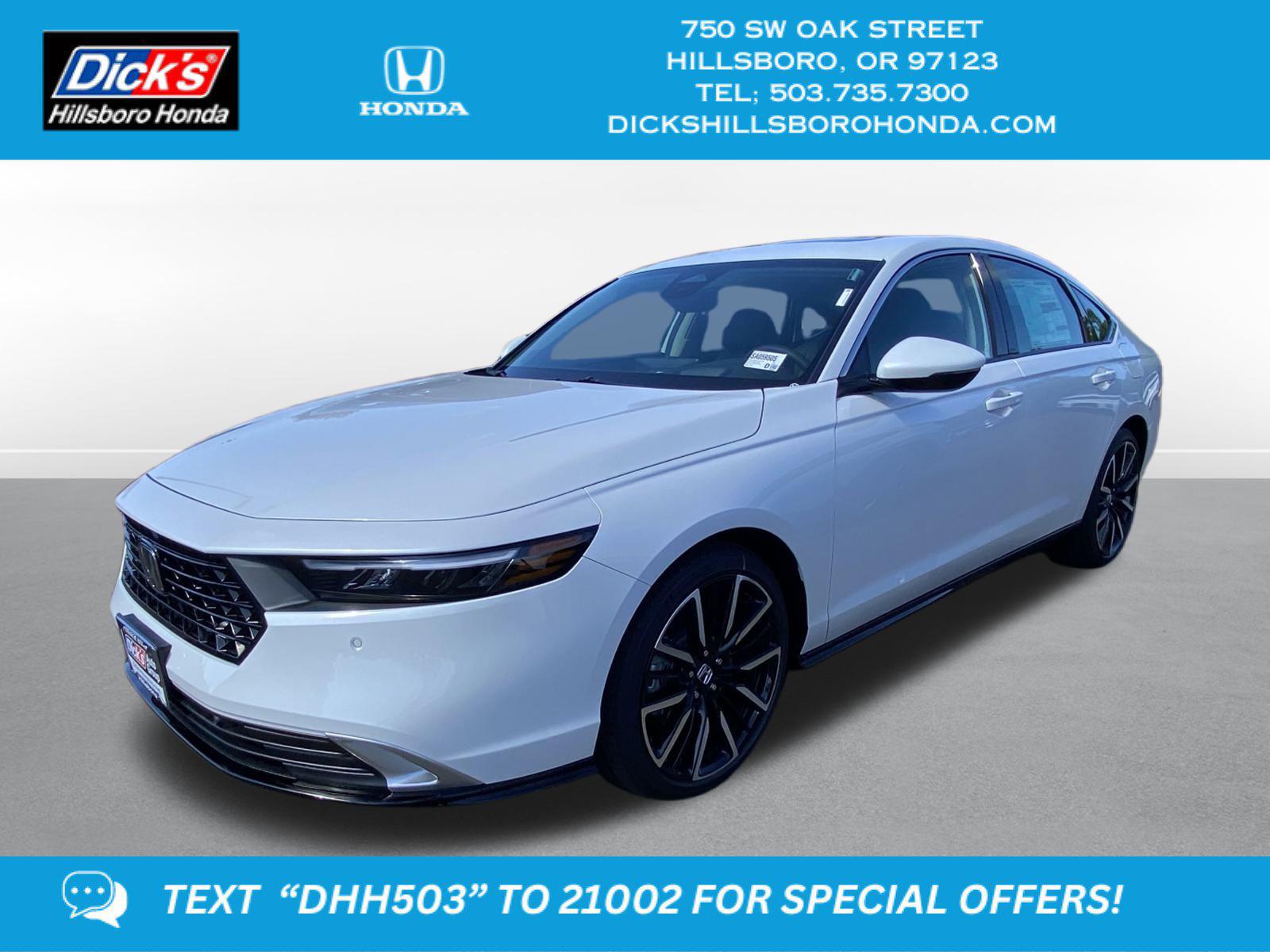 2025 Honda Accord Hybrid Touring Platinum White Pearl FWD eCVT 2.0L I4 DOHC 16V2.0L I4 DOHC 16V, 12 Speakers, 4-Wheel Disc Brakes, ABS brakes, Adaptive Cruise Control: Adaptive Cruise Control (ACC) with Low-Speed Follow, Air Conditioning, Alloy wheels, AM/FM radio, Apple CarPlay/Android Auto, Auto High-beam Headlights, Auto-dimming Rear-View mirror, Automatic temperature control, Blind Spot Information (BSI) System warning, Bose Premium Sound System, Brake assist, Bumpers: body-color, Compass, Delay-off headlights, Driver door bin, Driver vanity mirror, Dual front impact airbags, Dual front side impact airbags, Electronic Stability Control, Emergency communication system: HondaLink, Exterior Parking Camera Rear, Four wheel independent suspension, Front anti-roll bar, Front Bucket Seats, Front Center Armrest, Front dual zone A/C, Front reading lights, Fully automatic headlights, Heads-Up Display, Heated & Ventilated Front Bucket Seats, Heated door mirrors, Heated front seats, Heated rear seats, Heated steering wheel, Illuminated entry, Knee airbag, Lane departure: Lane Keeping Assist System (LKAS) active, Leather Shift Knob, Leather steering wheel, Leather-Trimmed Seat Trim, Low tire pressure warning, Memory seat, Navigation System, Occupant sensing airbag, Outside temperature display, Overhead airbag, Overhead console, Panic alarm, Passenger door bin, Passenger vanity mirror, Power door mirrors, Power driver seat, Power moonroof, Power passenger seat, Power steering, Power windows, Radio data system, Rain sensing wipers, Rear anti-roll bar, Rear reading lights, Rear seat center armrest, Rear side impact airbag, Rear window defroster, Remote keyless entry, Security system, Speed control, Speed-sensing steering, Speed-Sensitive Wipers, Split folding rear seat, Steering wheel mounted audio controls, Telescoping steering wheel, Tilt steering wheel, Traction control, Trip computer, Turn signal indicator mirrors, Variably intermittent wipers, Ventilated front seats, Wheels: 19 x 8.5J Berlina Black, 2.0L I4 DOHC 16V.46/41 City/Highway MPGThis 2025 Honda Accord Touring features a Platinum White Pearl exterior with a Black interior. Factory equipped with an impressive 2.0 l, and an cvt w/od transmission with fwd.*DESIRABLE FEATURES:* Navigation, Backup camera, WiFi capability, Leather, Heated steering, Bluetooth, Moonroof, Heated seating, Premium audio, Multi-zone AC. Your 2025 Honda Accord Touring is one of 5 other models like this in stock Beaverton drivers will find available to test drive at our new vehicle showroom in Hillsboro, OR. This Honda Accord is perfect for any ones car needs in our neighboring communities of Portland, Hillsboro & Beaverton, OR.*TECHNOLOGY FEATURES:* This Honda Accord for sale near Portland includes WiFi Mobile Hotspot, GPS System, Premium Sound System, Heads Up Display, Navigation System, Keyless Start, Bluetooth Connection, Smart Device Integration, HD Radio, Keyless Entry.*Our Honda Dealership in Hillsboro:* Call Dicks Hillsboro Honda today at *503-735-7310 to schedule your test drive* of this 2025 Honda Accord Touring! Dicks Hillsboro Honda features a wide selection of new Honda vehicles for sale near Portland, Hillsboro & Beaverton Oregon. You can also visit us at, 750 SW Oak St. Hillsboro OR, 97123 to check it out in person!*MECHANICAL FEATURES:* Installed mechanical features include Power One-touch down windows, Heated Mirrors, Push Button Start, Front Wheel Drive, Power Mirrors, Traction Control, Power Locks, Ventilated Disc Brakes, Cruise Control, Power Passenger Seat, Intermittent Wipers, Tires - Rear Performance, Tires - Front Performance, Variable Speed Intermittent Wipers, Power Steering, Trip Computer*INTERIOR OPTIONS:* Dual Power Seats, Heated Front Seats, Moon Roof, Leather Seats, Automatic Climate Control, Heated Steering Wheel, Heated Rear Seats, Air Conditioned Front Seats, Power Drivers Seat, Leather Wrapped Steering Wheel, Memory Seats, Adjustable Lumbar Seats, Air Conditioning, Pass-Through Rear Seat, Driver Illuminated Vanity Mirror, Bucket Front Seats, Steering Wheel Audio Controls, Multi-zone Climate Control, Auto Dimming R/V Mirror, Passenger Illuminated Visor Mirror, Floor Mats, Rear Window Defroster, Vanity Mirrors, Auxiliary Audio Input, Tilt Steering Wheel, Bench Seats, AM/FM Stereo, Trip Odometer. Beaverton new Honda dealers simply cannot compete with Dicks Hillsboro Honda attention to stocking Honda cars, trucks & SUVs with the most popular interior options.*SAFETY OPTIONS:* Rear Parking Aid, Cross Traffic Alerts, Blind Spot Monitoring, Electronic Stability Control, Lane Departure Warning, Back-Up Camera, Rain Sensing Wipers, Lane Keeping Assist System, Daytime Running Lights, Front Collision Mitigation, Restricted driving mode, LED Headlights, Brake Assist, Cruise Control Steering Assist, Adaptive Cruise Control, Security System, Integrated Turn Signal Mirrors, Rear Air Bag, Drivers Air Bag, Driver Alert System, Knee AirBag, ABS Brakes, Tire Pressure Monitoring System, Child Proof Locks, Driver Front Side Impact Air Bag, Passenger Air Bag Sensor, Front Head Air BagOREGON'S BEST HONDA FINANCIAL CREDIT FINANCE RATES: are right here at Dicks Hillsboro Honda Hillsboro Dealership where we offer the most competitive Honda Financial finance rates near Portland for new & Certified Honda Financial Financing. Our brand Finance experts have solutions for everyone including bad credit car loans or first time buyer financing programs.Dicks Hillsboro Honda New Honda dealership in Northwest Oregon is an easy drive or fly in from anywhere in the United States. Our Honda dealership sits just west of Beaverton.When choosing Honda dealers Portland shoppers prefer the short drive to Hillsboro where Dick's Hillsboro Honda has a new Honda Superstore and has the best customer service. We're glad you found this new Honda Accord for sale at our Honda dealership near you in Beaverton in Hillsboro, OR. Looking for Honda financing? Our Dicks Hillsboro Honda fina