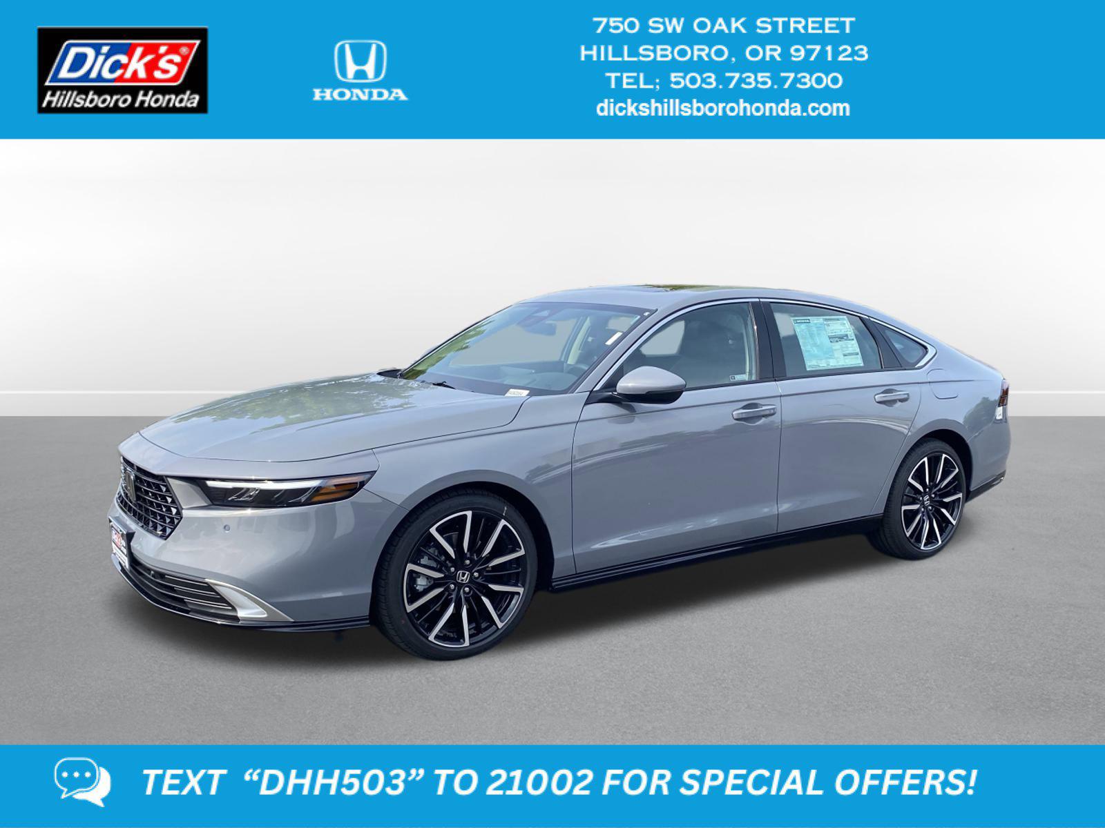 2025 Honda Accord Hybrid Touring Urban Gray Pearl FWD eCVT 2.0L I4 DOHC 16V2.0L I4 DOHC 16V, 12 Speakers, 4-Wheel Disc Brakes, ABS brakes, Adaptive Cruise Control: Adaptive Cruise Control (ACC) with Low-Speed Follow, Air Conditioning, Alloy wheels, AM/FM radio, Apple CarPlay/Android Auto, Auto High-beam Headlights, Auto-dimming Rear-View mirror, Automatic temperature control, Blind Spot Information (BSI) System warning, Bose Premium Sound System, Brake assist, Bumpers: body-color, Compass, Delay-off headlights, Driver door bin, Driver vanity mirror, Dual front impact airbags, Dual front side impact airbags, Electronic Stability Control, Emergency communication system: HondaLink, Exterior Parking Camera Rear, Four wheel independent suspension, Front anti-roll bar, Front Bucket Seats, Front Center Armrest, Front dual zone A/C, Front reading lights, Fully automatic headlights, Heads-Up Display, Heated & Ventilated Front Bucket Seats, Heated door mirrors, Heated front seats, Heated rear seats, Heated steering wheel, Illuminated entry, Knee airbag, Lane departure: Lane Keeping Assist System (LKAS) active, Leather Shift Knob, Leather steering wheel, Leather-Trimmed Seat Trim, Low tire pressure warning, Memory seat, Navigation System, Occupant sensing airbag, Outside temperature display, Overhead airbag, Overhead console, Panic alarm, Passenger door bin, Passenger vanity mirror, Power door mirrors, Power driver seat, Power moonroof, Power passenger seat, Power steering, Power windows, Radio data system, Rain sensing wipers, Rear anti-roll bar, Rear reading lights, Rear seat center armrest, Rear side impact airbag, Rear window defroster, Remote keyless entry, Security system, Speed control, Speed-sensing steering, Speed-Sensitive Wipers, Split folding rear seat, Steering wheel mounted audio controls, Telescoping steering wheel, Tilt steering wheel, Traction control, Trip computer, Turn signal indicator mirrors, Variably intermittent wipers, Ventilated front seats, Wheels: 19 x 8.5J Berlina Black, 2.0L I4 DOHC 16V.46/41 City/Highway MPGThis 2025 Honda Accord Touring features a Urban Gray Pearl exterior with a Black interior. Factory equipped with an impressive 2.0 l, and a cvt w/od transmission with fwd.*DESIRABLE FEATURES:* Navigation, Backup camera, Moonroof, WiFi capability, Heated seating, Heated steering, Bluetooth, Leather, Multi-zone AC, Premium audio. Your 2025 Honda Accord Touring is one of 18 other models like this in stock Beaverton drivers will find available to test drive at our new vehicle showroom in Hillsboro, OR. This Honda Accord is perfect for any ones car needs in our neighboring communities of Portland, Hillsboro & Beaverton, OR.*TECHNOLOGY FEATURES:* This Honda Accord for sale near Portland includes Navigation System, Heads Up Display, Premium Sound System, GPS System, WiFi Mobile Hotspot, Keyless Start, Bluetooth Connection, Smart Device Integration, HD Radio, Keyless Entry.*Our Honda Dealership:* Call Dicks Hillsboro Honda today at *503-735-7310 to schedule your test drive* of this 2025 Honda Accord Touring! Dicks Hillsboro Honda features a wide selection of new Honda vehicles for sale near Portland, Hillsboro & Beaverton Oregon. You can also visit us at, 750 SW Oak St. Hillsboro OR, 97123 to check it out in person!*MECHANICAL FEATURES:* Installed mechanical features include Push Button Start, Power One-touch down windows, Heated Mirrors, Front Wheel Drive, Power Mirrors, Traction Control, Power Locks, Ventilated Disc Brakes, Cruise Control, Power Passenger Seat, Intermittent Wipers, Trip Computer, Tires - Front Performance, Power Steering, Variable Speed Intermittent Wipers, Tires - Rear Performance*INTERIOR OPTIONS:* Heated Front Seats, Heated Rear Seats, Dual Power Seats, Heated Steering Wheel, Automatic Climate Control, Leather Seats, Moon Roof, Air Conditioned Front Seats, Power Drivers Seat, Adjustable Lumbar Seats, Leather Wrapped Steering Wheel, Memory Seats, Bucket Front Seats, Driver Illuminated Vanity Mirror, Steering Wheel Audio Controls, Air Conditioning, Pass-Through Rear Seat, Auto Dimming R/V Mirror, Multi-zone Climate Control, Passenger Illuminated Visor Mirror, Floor Mats, Auxiliary Audio Input, Rear Window Defroster, Vanity Mirrors, Bench Seats, Trip Odometer, Tilt Steering Wheel, AM/FM Stereo. Beaverton new Honda dealers simply cannot compete with Dicks Hillsboro Honda attention to stocking Honda cars, trucks & SUVs with the most popular interior options.*SAFETY OPTIONS:* Cross Traffic Alerts, Back-Up Camera, Lane Departure Warning, Blind Spot Monitoring, Rear Parking Aid, Rain Sensing Wipers, Electronic Stability Control, Lane Keeping Assist System, Integrated Turn Signal Mirrors, Brake Assist, Restricted driving mode, Front Collision Mitigation, Security System, Cruise Control Steering Assist, LED Headlights, Daytime Running Lights, Adaptive Cruise Control, Knee AirBag, ABS Brakes, Rear Air Bag, Tire Pressure Monitoring System, Driver Alert System, Drivers Air Bag, Passenger Air Bag Sensor, Child Proof Locks, Driver Front Side Impact Air Bag, Front Head Air BagOREGON'S BEST HONDA FINANCIAL CREDIT FINANCE RATES: are right here at Dicks Hillsboro Honda Hillsboro Dealership where we offer the most competitive Honda Financial finance rates near Portland for new & Certified Honda Financial Financing. Our brand Finance experts have solutions for everyone including bad credit car loans or first time buyer financing programs.Dicks Hillsboro Honda New Honda dealership in Northwest Oregon is an easy drive or fly in from anywhere in the United States. Our Honda dealership sits just west of Beaverton.When choosing Honda dealers Portland shoppers prefer the short drive to Hillsboro where Dick's Hillsboro Honda has a new Honda Superstore and has the best customer service. We're glad you found this new Honda Accord for sale at our Honda dealership near you in Beaverton in Hillsboro, OR. Looking for Honda financing? Our Dicks Hillsboro Honda finance specialist will f