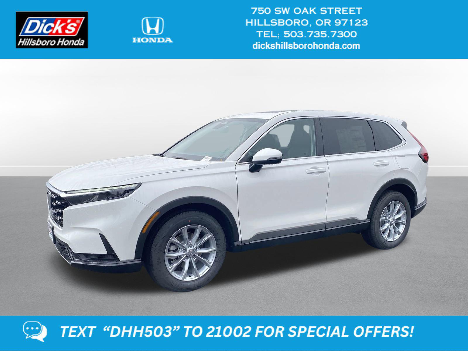 2025 Honda CR-V EX Platinum White Pearl AWD CVT 1.5L I4 DOHC 16VAWD, 4-Wheel Disc Brakes, 6 Speakers, ABS brakes, Adaptive Cruise Control: Adaptive Cruise Control (ACC) with Low-Speed Follow, Air Conditioning, Alloy wheels, Apple CarPlay/Android Auto, Auto High-beam Headlights, Automatic temperature control, Blind Spot Information (BSI) System warning, Brake assist, Bumpers: body-color, Cloth Seat Trim, Compass, Delay-off headlights, Driver door bin, Driver vanity mirror, Dual front impact airbags, Dual front side impact airbags, Electronic Stability Control, Exterior Parking Camera Rear, Four wheel independent suspension, Front anti-roll bar, Front Bucket Seats, Front Center Armrest, Front dual zone A/C, Front reading lights, Fully automatic headlights, Heated door mirrors, Heated Front Bucket Seats, Heated front seats, Illuminated entry, Knee airbag, Low tire pressure warning, Occupant sensing airbag, Outside temperature display, Overhead airbag, Overhead console, Panic alarm, Passenger door bin, Passenger vanity mirror, Power door mirrors, Power driver seat, Power moonroof, Power steering, Power windows, Radio data system, Radio: 240-Watt AM/FM Audio System, Rear anti-roll bar, Rear reading lights, Rear seat center armrest, Rear side impact airbag, Rear window defroster, Rear window wiper, Remote keyless entry, Security system, Speed control, Speed-sensing steering, Speed-Sensitive Wipers, Split folding rear seat, Spoiler, Steering wheel mounted audio controls, Tachometer, Telescoping steering wheel, Tilt steering wheel, Traction control, Trip computer, Turn signal indicator mirrors, Variably intermittent wipers, Wheels: 18 Sparkle Silver Metallic, AWD.Recent Arrival! 26/31 City/Highway MPG This 2025 Honda CR-V EX features a Platinum White Pearl exterior with a Black interior. Factory equipped with an impressive 1.5 l, and an cvt w/od with awd.*DESIRABLE FEATURES:* Remote start, Backup camera, Turbocharged, Moonroof, Heated seating, Bluetooth, Multi-zone AC. Your 2025 Honda CR-V EX is one of 37 other SUVs like this in stock Beaverton drivers will find available to test drive at our new SUV showroom in Hillsboro, OR. This Honda CR-V is perfect for any ones SUV needs in our neighboring communities of Portland, Hillsboro & Beaverton, OR.*TECHNOLOGY FEATURES:* This Honda CR-V for sale near Portland includes Remote Engine Start, Keyless Start, Smart Device Integration, Bluetooth Connection, Keyless Entry.*Our Honda Dealership in Hillsboro:* Call Dicks Hillsboro Honda today at *(503) 616-4532 to schedule your test drive* of this 2025 Honda CR-V EX! Dicks Hillsboro Honda features a wide selection of new Honda SUVs for sale near Portland, Hillsboro & Beaverton Oregon. You can also visit us at, 750 SW Oak St. Hillsboro OR, 97123 to check it out in person!*MECHANICAL FEATURES:* Installed mechanical features include Power One-touch Down windows, All Wheel Drive, Push Button Start, Heated Mirrors, Turbocharged Engine, Power Mirrors, Power Locks, Traction Control, Cruise Control, Ventilated Disc Brakes, Intermittent Wipers, Tires - Front All-Season, Power Steering, Tires - Rear All-Season, Trip Computer, Variable Speed Intermittent Wipers*INTERIOR OPTIONS:* Automatic Climate Control, Moon Roof, Heated Front Seats, Cloth Seats, Power Drivers Seat, Adjustable Lumbar Seats, Pass-Through Rear Seat, Bucket Front Seats, Steering Wheel Audio Controls, Driver Illuminated Vanity Mirror, Air Conditioning, Passenger Illuminated Visor Mirror, Multi-zone Climate Control, Vanity Mirrors, Bench Seats, Auxiliary Audio Input, Floor Mats, Rear Window Defroster, AM/FM Stereo, Trip Odometer, Tilt Steering Wheel. Beaverton new Honda SUV dealers simply cannot compete with Dicks Hillsboro Honda attention to stocking Honda SUVs with the most popular interior options.*EXTERIOR OPTIONS:* Aluminum Wheels, Privacy Glass, Auto Headlamp, Spoiler, Spare Tire *Small Size**SAFETY OPTIONS:* Back-Up Camera, Blind Spot Monitoring, Lane Keeping Assist System, Electronic Stability Control, Lane Departure Warning, Rear Collision Warning, Daytime Running Lights, Security System, Cruise Control Steering Assist, Front Collision Mitigation, Integrated Turn Signal Mirrors, Brake Assist, LED Headlights, Adaptive Cruise Control, Tire Pressure Monitoring System, Rear Air Bag, Drivers Air Bag, ABS Brakes, Knee AirBag, Driver Alert System, Child Proof Locks, Front Head Air Bag, Driver Front Side Impact Air Bag, Passenger Air Bag SensorOREGON'S BEST HONDA FINANCIAL CREDIT FINANCE RATES: are right here at Dicks Hillsboro Honda Hillsboro Dealership where we offer the most competitive Honda Financial finance rates near Portland for new & Certified Honda Financial Financing. Our brand Finance experts have solutions for everyone including bad credit car loans or first time buyer financing programs.Dicks Hillsboro Honda New Honda SUV dealership in Northwest Oregon is an easy drive or fly in from anywhere in the United States. Our Honda dealership sits just west of Beaverton.When choosing Honda dealers Portland shoppers prefer the short drive to Hillsboro where Dick's Hillsboro Honda has a new Honda Superstore and has the best customer service. We're glad you found this new Honda CR-V for sale at our Honda dealership near you in Beaverton in Hillsboro, OR. Looking for Honda financing? Our Dicks Hillsboro Honda finance specialist will find the best rates available for this new Honda CR-V for sale. Dicks Hillsboro Honda has new cars for sale and used cars for sale in Hillsboro just west of Portland.Dicks Hillsboro Honda New Honda SUV Super center sits just west of Beaverton. We stock and special order the new Honda SUV models Portland, Hillsboro & Beaverton OR SUV shoppers prefer, like this 2025 Honda CR-V EX Stock# SH433361.
