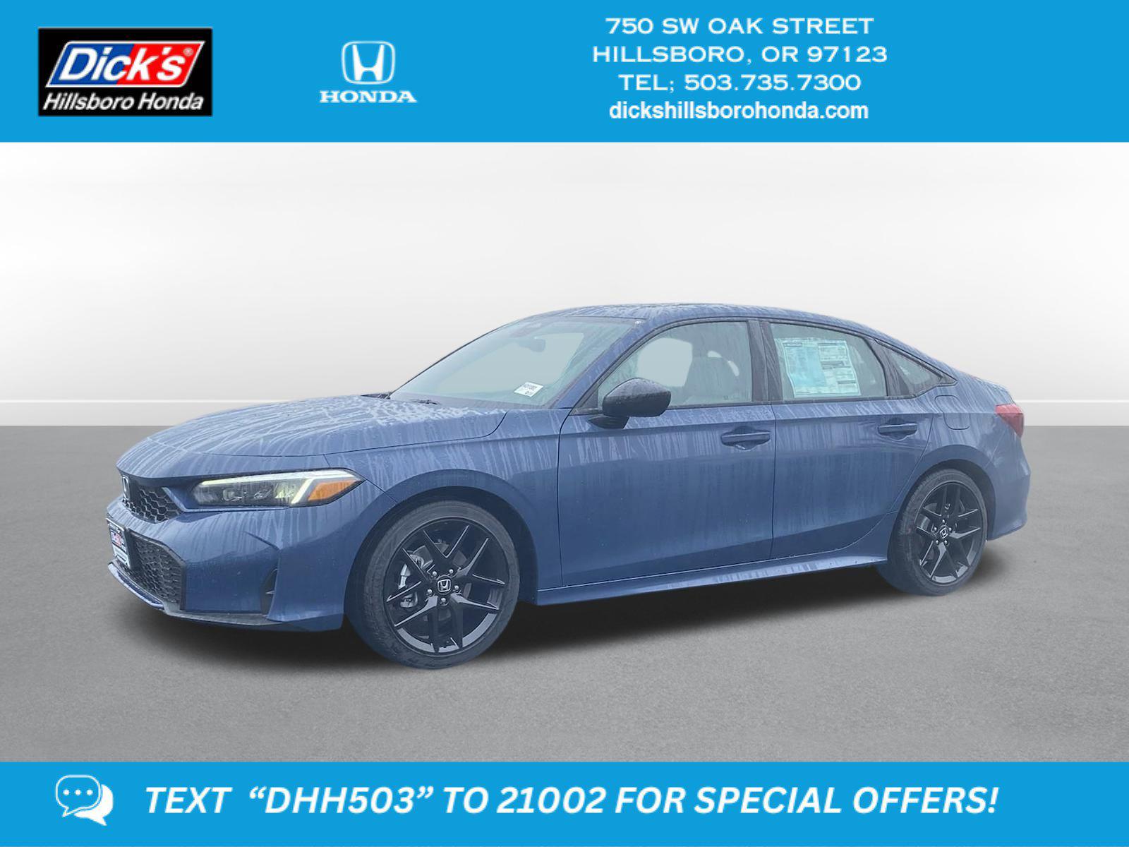 2025 Honda Civic Hybrid Bm FWD eCVT 2.0L 16V DOHCGray Artificial Leather, 4-Wheel Disc Brakes, 8 Speakers, ABS brakes, Adaptive Cruise Control: Adaptive Cruise Control (ACC) with Low-Speed Follow, Air Conditioning, Alloy wheels, AM/FM radio, Apple CarPlay/Android Auto, Auto High-beam Headlights, Automatic temperature control, Blind Spot Information (BSI) System warning, Brake assist, Bumpers: body-color, Cloth/Leatherette Seat Trim, Delay-off headlights, Driver door bin, Driver vanity mirror, Dual front impact airbags, Dual front side impact airbags, Electronic Stability Control, Emergency communication system: HondaLink, Exterior Parking Camera Rear, Four wheel independent suspension, Front anti-roll bar, Front Bucket Seats, Front Center Armrest, Front dual zone A/C, Front reading lights, Fully automatic headlights, Heated door mirrors, Heated Front Bucket Seats, Heated front seats, Illuminated entry, Knee airbag, Leather Shift Knob, Leather steering wheel, Low tire pressure warning, Occupant sensing airbag, Outside temperature display, Overhead airbag, Panic alarm, Passenger door bin, Passenger vanity mirror, Power door mirrors, Power moonroof, Power steering, Power windows, Radio data system, Radio: 180-Watt Audio System, Rear anti-roll bar, Rear seat center armrest, Rear side impact airbag, Rear window defroster, Remote keyless entry, Security system, Speed control, Speed-sensing steering, Split folding rear seat, Steering wheel mounted audio controls, Tachometer, Telescoping steering wheel, Tilt steering wheel, Traction control, Trip computer, Variably intermittent wipers, Wheels: 18 Gloss Black Alloy, Gray Artificial Leather.Recent Arrival! 50/47 City/Highway MPGThis 2025 Honda Civic Sedan Hybrid Sport features a Blue Lagoon Pearl exterior with a Gray interior. Factory equipped with an impressive 2.0 l, and an cvt w/od transmission with fwd.*DESIRABLE FEATURES:* Remote start, Backup camera, Bluetooth, Moonroof, Heated seating, Multi-zone AC. This Honda Civic Sedan Hybrid is perfect for any ones car needs in our neighboring communities of Portland, Hillsboro & Beaverton, OR.*TECHNOLOGY FEATURES:* This Honda Civic Sedan Hybrid for sale near Portland includes Remote Engine Start, GPS System, Keyless Start, Bluetooth Connection, Smart Device Integration, Keyless Entry.*Our Honda Dealership in Hillsboro:* Call Dicks Hillsboro Honda today at *(503) 616-4532 to schedule your test drive* of this 2025 Honda Civic Sedan Hybrid Sport! Dicks Hillsboro Honda features a wide selection of new Honda vehicles for sale near Portland, Hillsboro & Beaverton Oregon. You can also visit us at, 750 SW Oak St. Hillsboro OR, 97123 to check it out in person!*MECHANICAL FEATURES:* Installed mechanical features include Push Button Start, Heated Mirrors, Power One-touch Down windows, Front Wheel Drive, Power Locks, Power Mirrors, Traction Control, Cruise Control, Ventilated Disc Brakes, Intermittent Wipers, Variable Speed Intermittent Wipers, Tires - Rear Performance, Trip Computer, Power Steering, Tires - Front Performance*INTERIOR OPTIONS:* Premium Synthetic Seats, Heated Front Seats, Automatic Climate Control, Moon Roof, Leather Wrapped Steering Wheel, Cloth Seats, Pass-Through Rear Seat, Steering Wheel Audio Controls, Air Conditioning, Bucket Front Seats, Multi-zone Climate Control, Trip Odometer, Tilt Steering Wheel, Rear Window Defroster, Floor Mats, Vanity Mirrors, Auxiliary Audio Input, AM/FM Stereo, Bench Seats. Beaverton new Honda dealers simply cannot compete with Dicks Hillsboro Honda attention to stocking Honda cars, trucks & SUVs with the most popular interior options.*SAFETY OPTIONS:* Lane Departure Warning, Cross Traffic Alerts, Back-Up Camera, Lane Keeping Assist System, Electronic Stability Control, Blind Spot Monitoring, Brake Assist, Cruise Control Steering Assist, Daytime Running Lights, Security System, Front Collision Mitigation, LED Headlights, Adaptive Cruise Control, Knee AirBag, ABS Brakes, Drivers Air Bag, Rear Air Bag, Tire Pressure Monitoring System, Driver Alert System, Front Head Air Bag, Passenger Air Bag Sensor, Child Proof Locks, Driver Front Side Impact Air BagOREGON'S BEST HONDA FINANCIAL CREDIT FINANCE RATES: are right here at Dicks Hillsboro Honda Hillsboro Dealership where we offer the most competitive Honda Financial finance rates near Portland for new & Certified Honda Financial Financing. Our brand Finance experts have solutions for everyone including bad credit car loans or first time buyer financing programs.Dicks Hillsboro Honda New Honda dealership in Northwest Oregon is an easy drive or fly in from anywhere in the United States. Our Honda dealership sits just west of Beaverton.When choosing Honda dealers Portland shoppers prefer the short drive to Hillsboro where Dick's Hillsboro Honda has a new Honda Superstore and has the best customer service. We're glad you found this new Honda Civic Sedan Hybrid for sale at our Honda dealership near you in Beaverton in Hillsboro, OR. Looking for Honda financing? Our Dicks Hillsboro Honda finance specialist will find the best rates available for this new Honda Civic Sedan Hybrid for sale. Dicks Hillsboro Honda has new cars for sale and used cars for sale in Hillsboro just west of Portland.