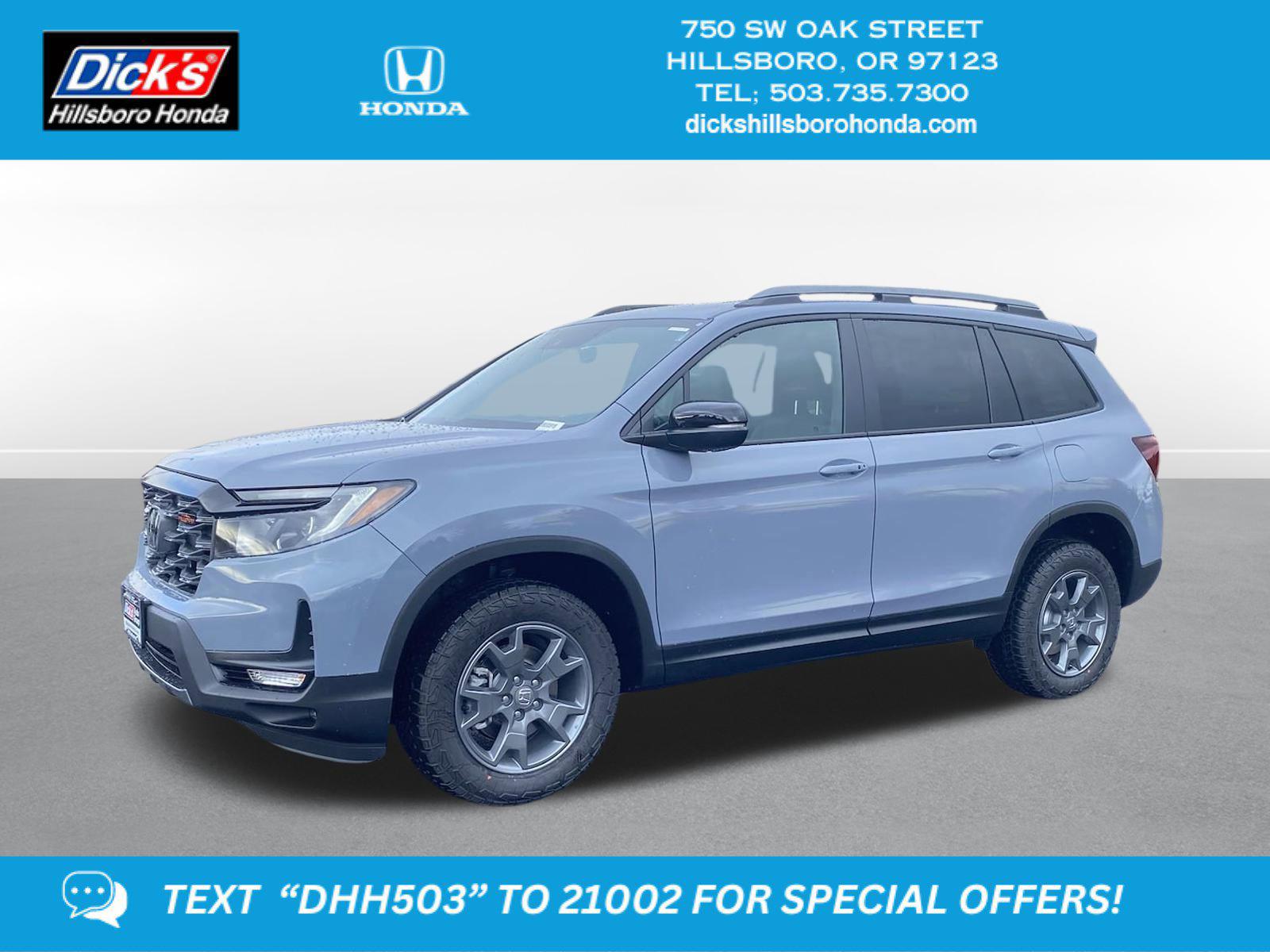 2025 Honda Passport TrailSport Sonic Gray Pearl AWD 9-Speed Automatic 3.5L V6 24V SOHC i-VTEC4-Wheel Disc Brakes, 7 Speakers, A/V remote: CabinControl, ABS brakes, Air Conditioning, Alloy wheels, AM/FM radio: SiriusXM, Apple CarPlay/Android Auto, Auto High-beam Headlights, Auto-dimming Rear-View mirror, Automatic temperature control, Blind Spot Information (BSI) System warning, Brake assist, Bumpers: body-color, Compass, Delay-off headlights, Driver door bin, Driver vanity mirror, Driver's Seat Mounted Armrest, Dual front impact airbags, Dual front side impact airbags, Electronic Stability Control, Emergency communication system: HondaLink Assist, Exterior Parking Camera Rear, Four wheel independent suspension, Front anti-roll bar, Front Bucket Seats, Front Center Armrest, Front dual zone A/C, Front fog lights, Front reading lights, Fully automatic headlights, Garage door transmitter: HomeLink, Heated door mirrors, Heated Front Bucket Seats, Heated front seats, Illuminated entry, Lane departure: Lane Keeping Assist System (LKAS) active, Leather-Trimmed Seats, Low tire pressure warning, Navigation system: Honda Satellite-Linked Navigation System, Occupant sensing airbag, Outside temperature display, Overhead airbag, Overhead console, Panic alarm, Passenger door bin, Passenger seat mounted armrest, Passenger vanity mirror, Power door mirrors, Power driver seat, Power Liftgate, Power moonroof, Power passenger seat, Power steering, Power windows, Radio data system, Radio: 215-Watt Audio System w/7 Speakers, Rear air conditioning, Rear anti-roll bar, Rear reading lights, Rear seat center armrest, Rear window defroster, Rear window wiper, Remote keyless entry, Roof rack: rails only, Security system, Speed control, Speed-sensing steering, Split folding rear seat, Spoiler, Steering wheel mounted audio controls, Tachometer, Telescoping steering wheel, Tilt steering wheel, Traction control, Trip computer, Turn signal indicator mirrors, Variably intermittent wipers, Wheels: 18 Pewter Gray Alloy.Recent Arrival! This 2025 Honda Passport TrailSport features a Sonic Gray Pearl exterior with a Black interior. Factory equipped with an impressive 3.5 l, and an 9-speed automatic w/od with awd.*DESIRABLE FEATURES:* Remote start, Navigation, Backup camera, Bluetooth, Moonroof, Leather, Heated seating, Power liftgate, Multi-zone AC. Your 2025 Honda Passport TrailSport is one of 5 other SUVs like this in stock Beaverton drivers will find available to test drive at our new SUV showroom in Hillsboro, OR. This Honda Passport is perfect for any ones SUV needs in our neighboring communities of Portland, Hillsboro & Beaverton, OR.*TECHNOLOGY FEATURES:* This Honda Passport for sale near Portland includes GPS System, Navigation System, Remote Engine Start, Keyless Start, Bluetooth Connection, SiriusXM Satellite Radio, Smart Device Integration, Garage Door Opener, HD Radio, Keyless Entry.*Our Honda Dealership in Hillsboro:* Call Dicks Hillsboro Honda today at *(503) 616-4532 to schedule your test drive* of this 2025 Honda Passport TrailSport! Dicks Hillsboro Honda features a wide selection of new Honda SUVs for sale near Portland, Hillsboro & Beaverton Oregon. You can also visit us at, 750 SW Oak St. Hillsboro OR, 97123 to check it out in person!*MECHANICAL FEATURES:* Installed mechanical features include Power One-touch Down windows, Heated Mirrors, All Wheel Drive, Push Button Start, Power Mirrors, Traction Control, Power Locks, Locking Rear Differential, Cruise Control, Power Passenger Seat, Ventilated Disc Brakes, Intermittent Wipers, Variable Speed Intermittent Wipers, Tires- All-Terrain, Power Steering, Trip Computer, Remote Trunk Release*INTERIOR OPTIONS:* Automatic Climate Control, Heated Front Seats, Leather Seats, Moon Roof, Dual Power Seats, Leather Wrapped Steering Wheel, Power Drivers Seat, Adjustable Lumbar Seats, Driver Illuminated Vanity Mirror, Bucket Front Seats, Steering Wheel Audio Controls, Air Conditioning, Pass-Through Rear Seat, Passenger Illuminated Visor Mirror, Auto Dimming R/V Mirror, Multi-zone Climate Control, Floor Mats, Vanity Mirrors, AM/FM Stereo, Rear Window Defroster, Trip Odometer, Auxiliary Audio Input, Tilt Steering Wheel, Bench Seats. Beaverton new Honda SUV dealers simply cannot compete with Dicks Hillsboro Honda attention to stocking Honda SUVs with the most popular interior options.*EXTERIOR OPTIONS:* Aluminum Wheels, Fog Lights, Power Folding Mirrors, Power Hands-Free Liftgate, Privacy Glass, Auto Headlamp, Spare Tire *Small Size*, Spoiler*SAFETY OPTIONS:* Rear Parking Aid, Lane Keeping Assist System, Back-Up Camera, Blind Spot Monitoring, Lane Departure Warning, Electronic Stability Control, Cross Traffic Alerts, Brake Assist, Front Collision Mitigation, Adaptive Cruise Control, LED Headlights, Security System, Daytime Running Lights, Integrated Turn Signal Mirrors, Tire Pressure Monitoring System, Rear Air Bag, ABS Brakes, Drivers Air Bag, Driver Front Side Impact Air Bag, Child Proof Locks, Front Head Air Bag, Passenger Air Bag SensorOREGON'S BEST HONDA FINANCIAL CREDIT FINANCE RATES: are right here at Dicks Hillsboro Honda Hillsboro Dealership where we offer the most competitive Honda Financial finance rates near Portland for new & Certified Honda Financial Financing. Our brand Finance experts have solutions for everyone including bad credit car loans or first time buyer financing programs.Dicks Hillsboro Honda New Honda SUV dealership in Northwest Oregon is an easy drive or fly in from anywhere in the United States. Our Honda dealership sits just west of Beaverton.When choosing Honda dealers Portland shoppers prefer the short drive to Hillsboro where Dick's Hillsboro Honda has a new Honda Superstore and has the best customer service. We're glad you found this new Honda Passport for sale at our Honda dealership near you in Beaverton in Hillsboro, OR. Looking for Honda financing? Our Dicks Hillsboro Honda finance specialist will find the best rates available for this new H