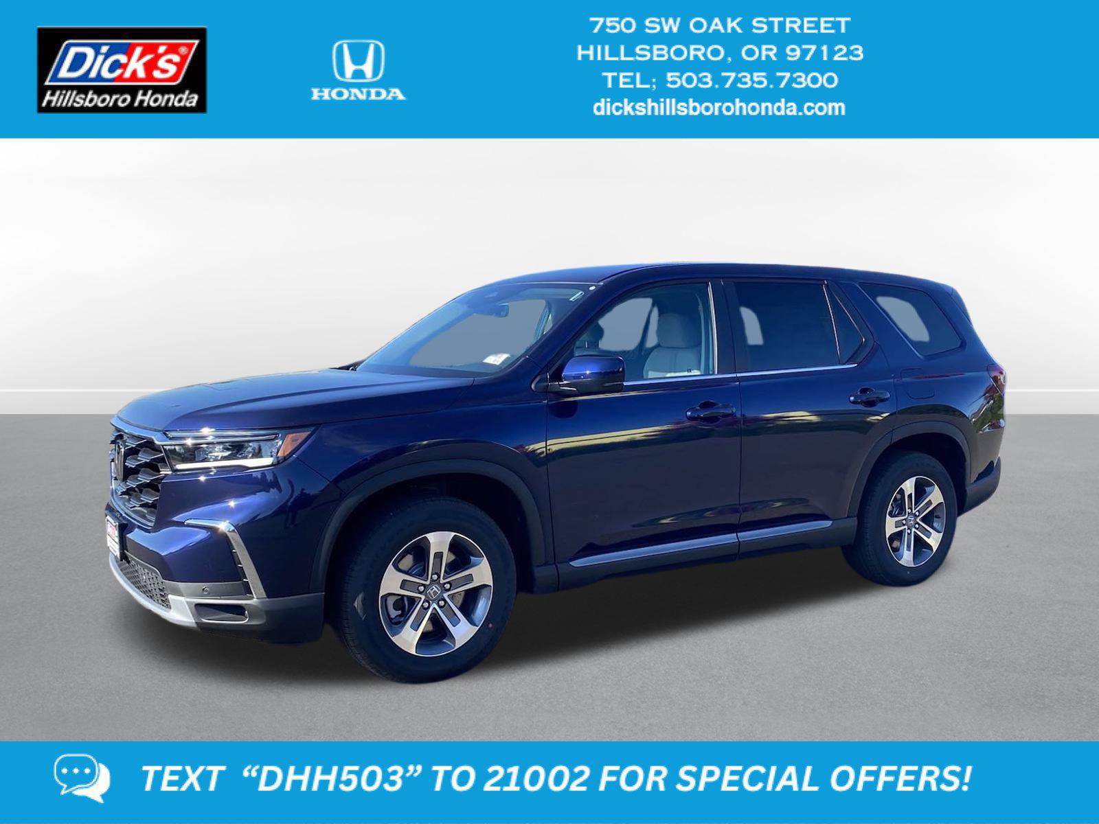 2025 Honda Pilot EX-L Obsidian Blue Pearl AWD 10-Speed Automatic 3.5L V6 DOHC 24VAWD, 3rd row seats: split-bench, 4-Wheel Disc Brakes, 4.167 Axle Ratio, 9 Speakers, ABS brakes, Adaptive Cruise Control: Adaptive Cruise Control (ACC) with Low-Speed Follow, Air Conditioning, Alloy wheels, AM/FM radio: SiriusXM, Apple CarPlay/Android Auto, Auto High-beam Headlights, Auto-dimming Rear-View mirror, Automatic temperature control, Blind Spot Information (BSI) System warning, Brake assist, Bumpers: body-color, Delay-off headlights, Driver door bin, Driver vanity mirror, Dual front impact airbags, Dual front side impact airbags, Electronic Stability Control, Emergency communication system: HondaLink Assist, Exterior Parking Camera Rear, Four wheel independent suspension, Front anti-roll bar, Front Bucket Seats, Front Center Armrest, Front dual zone A/C, Front fog lights, Front reading lights, Fully automatic headlights, Garage door transmitter: HomeLink, Heated door mirrors, Heated Front Bucket Seats, Heated front seats, Illuminated entry, Knee airbag, Lane departure: Lane Keeping Assist System (LKAS) active, Leather Seat Trim, Low tire pressure warning, Memory seat, Occupant sensing airbag, Outside temperature display, Overhead airbag, Overhead console, Panic alarm, Passenger door bin, Passenger vanity mirror, Power door mirrors, Power driver seat, Power Liftgate, Power passenger seat, Power steering, Power windows, Radio data system, Radio: 245-Watt Audio System, Rear air conditioning, Rear anti-roll bar, Rear reading lights, Rear seat center armrest, Rear window defroster, Rear window wiper, Reclining 3rd row seat, Remote keyless entry, Security system, SiriusXM, Speed control, Speed-sensing steering, Speed-Sensitive Wipers, Split folding rear seat, Spoiler, Steering wheel mounted audio controls, Tachometer, Telescoping steering wheel, Tilt steering wheel, Traction control, Trip computer, Turn signal indicator mirrors, Variably intermittent wipers, Wheels: 18 Pewter Gray Machined Face, AWD. This 2025 Honda Pilot EX-L features a Obsidian Blue Pearl exterior with a Gray interior. Factory equipped with an impressive 3.5 l, and an 10-speed automatic w/od with awd.*DESIRABLE FEATURES:* Remote start, Backup camera, Bluetooth, Heated seating, Leather, Power liftgate, Multi-zone AC, 3rd row seat. Your 2025 Honda Pilot EX-L is one of 12 other SUVs like this in stock Beaverton drivers will find available to test drive at our new SUV showroom in Hillsboro, OR. This Honda Pilot is perfect for any ones SUV needs in our neighboring communities of Portland, Hillsboro & Beaverton, OR.*TECHNOLOGY FEATURES:* This Honda Pilot for sale near Portland includes Remote Engine Start, GPS System, Keyless Start, Bluetooth Connection, Smart Device Integration, Garage Door Opener, SiriusXM Satellite Radio, HD Radio, Keyless Entry.*Our Honda Dealership in Hillsboro:* Call Dicks Hillsboro Honda today at *(503) 616-4532 to schedule your test drive* of this 2025 Honda Pilot EX-L! Dicks Hillsboro Honda features a wide selection of new Honda SUVs for sale near Portland, Hillsboro & Beaverton Oregon. You can also visit us at, 750 SW Oak St. Hillsboro OR, 97123 to check it out in person!*MECHANICAL FEATURES:* Installed mechanical features include All Wheel Drive, Power One-touch Down windows, Push Button Start, Heated Mirrors, Traction Control, Power Locks, Power Mirrors, Cruise Control, Ventilated Disc Brakes, Power Passenger Seat, Locking Rear Differential, Intermittent Wipers, Power Steering, Variable Speed Intermittent Wipers, Tires - Front All-Season, Remote Trunk Release, Trip Computer, Tires - Rear All-Season*INTERIOR OPTIONS:* Automatic Climate Control, Heated Front Seats, Leather Seats, Dual Power Seats, Third Row Seats, Power Drivers Seat, Memory Seats, Adjustable Lumbar Seats, Leather Wrapped Steering Wheel, Pass-Through Rear Seat, Steering Wheel Audio Controls, Memory Mirrors, Driver Illuminated Vanity Mirror, Bucket Front Seats, Air Conditioning, Auto Dimming R/V Mirror, Passenger Illuminated Visor Mirror, Multi-zone Climate Control, AM/FM Stereo, Floor Mats, Rear Window Defroster, Auxiliary Audio Input, Bench Seats, Trip Odometer, Vanity Mirrors, Tilt Steering Wheel. Beaverton new Honda SUV dealers simply cannot compete with Dicks Hillsboro Honda attention to stocking Honda SUVs with the most popular interior options.*EXTERIOR OPTIONS:* Aluminum Wheels, Fog Lights, Power Hands-Free Liftgate, Privacy Glass, Auto Headlamp, Spoiler, Spare Tire *Small Size**SAFETY OPTIONS:* Lane Keeping Assist System, Back-Up Camera, Electronic Stability Control, Lane Departure Warning, Rear Parking Aid, Blind Spot Monitoring, Cross Traffic Alerts, Brake Assist, Adaptive Cruise Control, Front Collision Mitigation, Security System, Cruise Control Steering Assist, LED Headlights, Integrated Turn Signal Mirrors, Daytime Running Lights, ABS Brakes, Rear Air Bag, Driver Alert System, Drivers Air Bag, Knee AirBag, Tire Pressure Monitoring System, Driver Front Side Impact Air Bag, Child Proof Locks, Front Head Air Bag, Passenger Air Bag SensorOREGON'S BEST HONDA FINANCIAL CREDIT FINANCE RATES: are right here at Dicks Hillsboro Honda Hillsboro Dealership where we offer the most competitive Honda Financial finance rates near Portland for new & Certified Honda Financial Financing. Our brand Finance experts have solutions for everyone including bad credit car loans or first time buyer financing programs.Dicks Hillsboro Honda New Honda SUV dealership in Northwest Oregon is an easy drive or fly in from anywhere in the United States. Our Honda dealership sits just west of Beaverton.When choosing Honda dealers Portland shoppers prefer the short drive to Hillsboro where Dick's Hillsboro Honda has a new Honda Superstore and has the best customer service. We're glad you found this new Honda Pilot for sale at our Honda dealership near you in Beaverton in Hillsboro, OR. Looking for Honda financing? Our Dicks Hillsboro Honda finance specialist will find the 