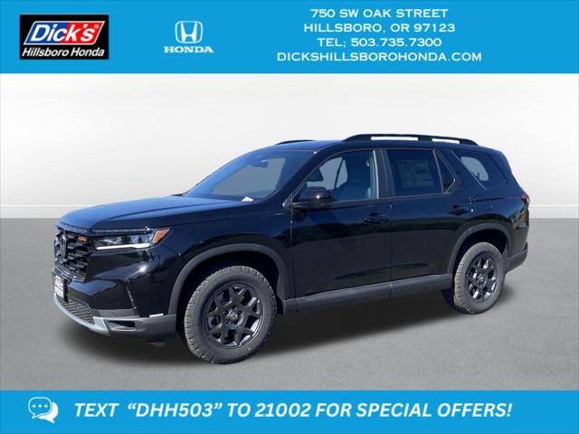 2025 Honda Pilot TrailSport Crystal Black Pearl AWD 10-Speed Automatic 3.5L V6 DOHC 24VAWD, 3rd row seats: split-bench, 4-Wheel Disc Brakes, 4.167 Axle Ratio, 9 Speakers, ABS brakes, Adaptive Cruise Control: Adaptive Cruise Control (ACC) with Low-Speed Follow, Air Conditioning, Alloy wheels, AM/FM radio: SiriusXM, Apple CarPlay/Android Auto, Auto High-beam Headlights, Auto-dimming Rear-View mirror, Automatic temperature control, Blind Spot Information (BSI) System warning, Brake assist, Bumpers: body-color, Delay-off headlights, Driver door bin, Driver vanity mirror, Dual front impact airbags, Dual front side impact airbags, Durable Synthetic Leather Seat Trim, Electronic Stability Control, Emergency communication system: HondaLink Assist, Exterior Parking Camera Rear, Four wheel independent suspension, Front anti-roll bar, Front Bucket Seats, Front Center Armrest, Front dual zone A/C, Front fog lights, Front reading lights, Fully automatic headlights, Garage door transmitter: HomeLink, Heated door mirrors, Heated Front Bucket Seats, Heated front seats, Illuminated entry, Knee airbag, Lane departure: Lane Keeping Assist System (LKAS) active, Low tire pressure warning, Memory seat, Occupant sensing airbag, Outside temperature display, Overhead airbag, Overhead console, Panic alarm, Passenger door bin, Passenger vanity mirror, Power door mirrors, Power driver seat, Power Liftgate, Power moonroof, Power passenger seat, Power steering, Power windows, Radio data system, Radio: 245-Watt Audio System, Rear air conditioning, Rear anti-roll bar, Rear reading lights, Rear window defroster, Rear window wiper, Reclining 3rd row seat, Remote keyless entry, Security system, SiriusXM, Speed control, Speed-sensing steering, Speed-Sensitive Wipers, Split folding rear seat, Spoiler, Steering wheel mounted audio controls, Tachometer, Telescoping steering wheel, Tilt steering wheel, Traction control, Trip computer, Turn signal indicator mirrors, Variably intermittent wipers, Wheels: 18 Shark Gray w/Black Lug Nuts, AWD. This 2025 Honda Pilot TrailSport features a Crystal Black Pearl exterior with a Black interior. Factory equipped with an impressive 3.5 l, and an 10-speed automatic w/od with awd.*DESIRABLE FEATURES:* Remote start, Backup camera, Heated seating, Bluetooth, Moonroof, Power liftgate, Multi-zone AC, 3rd row seat. Your 2025 Honda Pilot TrailSport is one of 9 other SUVs like this in stock Beaverton drivers will find available to test drive at our new SUV showroom in Hillsboro, OR. This Honda Pilot is perfect for any ones SUV needs in our neighboring communities of Portland, Hillsboro & Beaverton, OR.*TECHNOLOGY FEATURES:* This Honda Pilot for sale near Portland includes GPS System, Remote Engine Start, Keyless Start, Smart Device Integration, Garage Door Opener, SiriusXM Satellite Radio, Bluetooth Connection, HD Radio, Keyless Entry.*Our Honda Dealership:* Call Dicks Hillsboro Honda today at *503-735-7310 to schedule your test drive* of this 2025 Honda Pilot TrailSport! Dicks Hillsboro Honda features a wide selection of new Honda SUVs for sale near Portland, Hillsboro & Beaverton Oregon. You can also visit us at, 750 SW Oak St. Hillsboro OR, 97123 to check it out in person!*MECHANICAL FEATURES:* Installed mechanical features include Push Button Start, All Wheel Drive, Power One-touch down windows, Heated Mirrors, Power Mirrors, Power Locks, Traction Control, Locking Rear Differential, Ventilated Disc Brakes, Power Passenger Seat, Cruise Control, Intermittent Wipers, Tires- All-Terrain, Remote Trunk Release, Trip Computer, Variable Speed Intermittent Wipers, Power Steering*INTERIOR OPTIONS:* Automatic Climate Control, Third Row Seats, Premium Synthetic Seats, Panoramic Roof, Heated Front Seats, Dual Power Seats, Moon Roof, Adjustable Lumbar Seats, Power Drivers Seat, Memory Seats, Leather Wrapped Steering Wheel, Memory Mirrors, Bucket Front Seats, Driver Illuminated Vanity Mirror, Air Conditioning, Steering Wheel Audio Controls, Auto Dimming R/V Mirror, Multi-zone Climate Control, Passenger Illuminated Visor Mirror, Vanity Mirrors, Trip Odometer, Floor Mats, Auxiliary Audio Input, Rear Window Defroster, Tilt Steering Wheel, AM/FM Stereo. Beaverton new Honda SUV dealers simply cannot compete with Dicks Hillsboro Honda attention to stocking Honda SUVs with the most popular interior options.*EXTERIOR OPTIONS:* Fog Lights, Aluminum Wheels, Trailer Hitch Receiver, Power Folding Mirrors, Power Hands-Free Liftgate, Spare Tire *Full Size*, Front Tow Hooks, Privacy Glass, Auto Headlamp, Spoiler*SAFETY OPTIONS:* Lane Keeping Assist System, Lane Departure Warning, Blind Spot Monitoring, Cross Traffic Alerts, Back-Up Camera, Electronic Stability Control, Rear Parking Aid, Daytime Running Lights, Adaptive Cruise Control, Brake Assist, LED Headlights, Front Collision Mitigation, Security System, Integrated Turn Signal Mirrors, Cruise Control Steering Assist, Knee AirBag, Rear Air Bag, Driver Alert System, Drivers Air Bag, Tire Pressure Monitoring System, ABS Brakes, Ground view camera, Front Head Air Bag, Passenger Air Bag Sensor, Child Proof Locks, Driver Front Side Impact Air BagOREGON'S BEST HONDA FINANCIAL CREDIT FINANCE RATES: are right here at Dicks Hillsboro Honda Hillsboro Dealership where we offer the most competitive Honda Financial finance rates near Portland for new & Certified Honda Financial Financing. Our brand Finance experts have solutions for everyone including bad credit car loans or first time buyer financing programs.Dicks Hillsboro Honda New Honda SUV dealership in Northwest Oregon is an easy drive or fly in from anywhere in the United States. Our Honda dealership sits just west of Beaverton.When choosing Honda dealers Portland shoppers prefer the short drive to Hillsboro where Dick's Hillsboro Honda has a new Honda Superstore and has the best customer service. We're glad you found this new Honda Pilot for sale at our Honda dealership near you in Beaverton in Hillsboro, OR. Looking for Hond