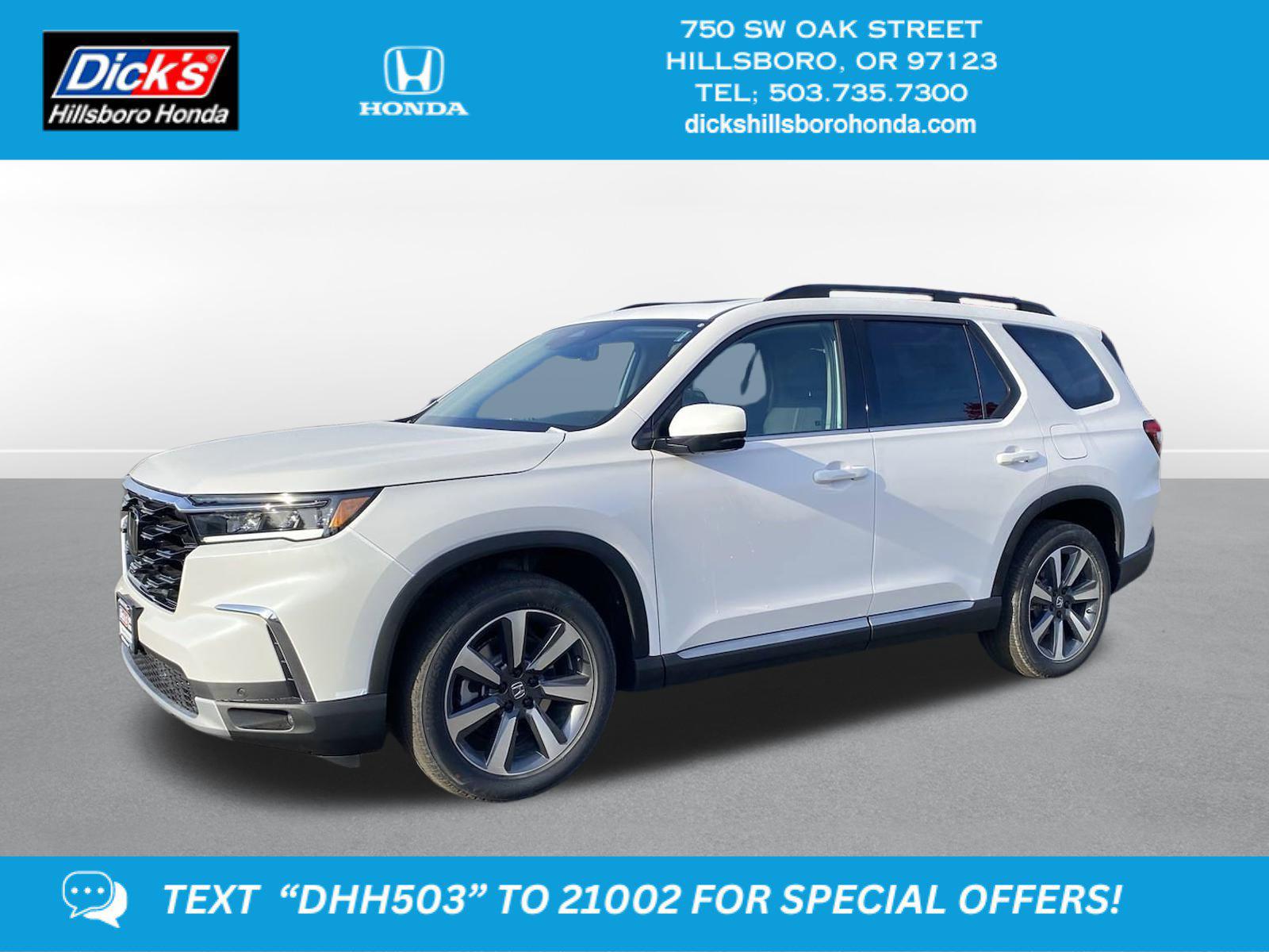 2025 Honda Pilot Touring Platinum White Pearl AWD 10-Speed Automatic 3.5L V6 DOHC 24VAWD, 12 Speakers, 3rd row seats: split-bench, 4-Wheel Disc Brakes, 4.167 Axle Ratio, ABS brakes, Adaptive Cruise Control: Adaptive Cruise Control (ACC) with Low-Speed Follow, Air Conditioning, Alloy wheels, AM/FM radio: SiriusXM, Apple CarPlay/Android Auto, Auto High-beam Headlights, Auto-dimming Rear-View mirror, Automatic temperature control, Blind Spot Information (BSI) System warning, Bose Premium Sound System, Brake assist, Bumpers: body-color, Compass, Delay-off headlights, Door auto-latch, Driver door bin, Driver vanity mirror, Dual front impact airbags, Dual front side impact airbags, Electronic Stability Control, Emergency communication system: HondaLink, Exterior Parking Camera Rear, Four wheel independent suspension, Front anti-roll bar, Front Bucket Seats, Front Center Armrest, Front dual zone A/C, Front fog lights, Front reading lights, Fully automatic headlights, Garage door transmitter: HomeLink, Heated door mirrors, Heated Front Bucket Seats, Heated front seats, Honda Satellite-Linked Navigation System, HondaLink Subscription Services, Illuminated entry, Knee airbag, Lane departure: Lane Keeping Assist System (LKAS) active, Leather Seat Trim, Low tire pressure warning, Memory seat, Navigation system: Honda Satellite-Linked Navigation System, Occupant sensing airbag, Outside temperature display, Overhead airbag, Overhead console, Panic alarm, Passenger door bin, Passenger vanity mirror, Power door mirrors, Power driver seat, Power Liftgate, Power moonroof, Power passenger seat, Power steering, Power windows, Radio data system, Rear air conditioning, Rear anti-roll bar, Rear reading lights, Rear seat center armrest, Rear window defroster, Rear window wiper, Reclining 3rd row seat, Remote keyless entry, Roof rack: rails only, Security system, SiriusXM, Speed control, Speed-sensing steering, Speed-Sensitive Wipers, Split folding rear seat, Spoiler, Steering wheel mounted audio controls, Tachometer, Telescoping steering wheel, Tilt steering wheel, Traction control, Trip computer, Turn signal indicator mirrors, Variably intermittent wipers, Wheels: 20 Shark Gray Machine Face w/Blk Lug Nuts, AWD. This 2025 Honda Pilot Touring features a Platinum White Pearl exterior with a Black interior. Factory equipped with an impressive 3.5 l, and an 10-speed automatic w/od with awd.*DESIRABLE FEATURES:* Navigation, Remote start, Backup camera, Moonroof, WiFi capability, Heated seating, Leather, Bluetooth, Power liftgate, Multi-zone AC, Premium audio, 3rd row seat. Your 2025 Honda Pilot Touring is one of 12 other SUVs like this in stock Beaverton drivers will find available to test drive at our new SUV showroom in Hillsboro, OR. This Honda Pilot is perfect for any ones SUV needs in our neighboring communities of Portland, Hillsboro & Beaverton, OR.*TECHNOLOGY FEATURES:* This Honda Pilot for sale near Portland includes Remote Engine Start, GPS System, Premium Sound System, WiFi Mobile Hotspot, Navigation System, Keyless Start, Garage Door Opener, SiriusXM Satellite Radio, Bluetooth Connection, Smart Device Integration, HD Radio, Keyless Entry.*Our Honda Dealership in Hillsboro:* Call Dicks Hillsboro Honda today at *(503) 616-4532 to schedule your test drive* of this 2025 Honda Pilot Touring! Dicks Hillsboro Honda features a wide selection of new Honda SUVs for sale near Portland, Hillsboro & Beaverton Oregon. You can also visit us at, 750 SW Oak St. Hillsboro OR, 97123 to check it out in person!*MECHANICAL FEATURES:* Installed mechanical features include Power One-touch Down windows, All Wheel Drive, Push Button Start, Heated Mirrors, Power Locks, Power Mirrors, Traction Control, Cruise Control, Locking Rear Differential, Ventilated Disc Brakes, Power Passenger Seat, Intermittent Wipers, Remote Trunk Release, Variable Speed Intermittent Wipers, Tires - Front Performance, Power Steering, Tires - Rear Performance, Trip Computer*INTERIOR OPTIONS:* Third Row Seats, Leather Seats, Panoramic Roof, Heated Front Seats, Automatic Climate Control, Dual Power Seats, Moon Roof, Memory Seats, Power Drivers Seat, Adjustable Lumbar Seats, Leather Wrapped Steering Wheel, Air Conditioning, Pass-Through Rear Seat, Steering Wheel Audio Controls, Memory Mirrors, Bucket Front Seats, Driver Illuminated Vanity Mirror, Auto Dimming R/V Mirror, Passenger Illuminated Visor Mirror, Multi-zone Climate Control, Bench Seats, Rear Window Defroster, Trip Odometer, Vanity Mirrors, Auxiliary Audio Input, Tilt Steering Wheel, AM/FM Stereo, Floor Mats. Beaverton new Honda SUV dealers simply cannot compete with Dicks Hillsboro Honda attention to stocking Honda SUVs with the most popular interior options.*EXTERIOR OPTIONS:* Aluminum Wheels, Fog Lights, Power Folding Mirrors, Power Hands-Free Liftgate, Privacy Glass, Auto Headlamp, Spoiler, Spare Tire *Small Size**SAFETY OPTIONS:* Blind Spot Monitoring, Back-Up Camera, Lane Keeping Assist System, Cross Traffic Alerts, Electronic Stability Control, Lane Departure Warning, Rear Parking Aid, Adaptive Cruise Control, Cruise Control Steering Assist, Front Collision Mitigation, LED Headlights, Integrated Turn Signal Mirrors, Security System, Brake Assist, Daytime Running Lights, Rear Air Bag, Drivers Air Bag, ABS Brakes, Driver Alert System, Tire Pressure Monitoring System, Knee AirBag, Child Proof Locks, Passenger Air Bag Sensor, Driver Front Side Impact Air Bag, Front Head Air BagOREGON'S BEST HONDA FINANCIAL CREDIT FINANCE RATES: are right here at Dicks Hillsboro Honda Hillsboro Dealership where we offer the most competitive Honda Financial finance rates near Portland for new & Certified Honda Financial Financing. Our brand Finance experts have solutions for everyone including bad credit car loans or first time buyer financing programs.Dicks Hillsboro Honda New Honda SUV dealership in Northwest Oregon is an easy drive or fly in from anywhere in the United States. Our Honda dealership sits just west o