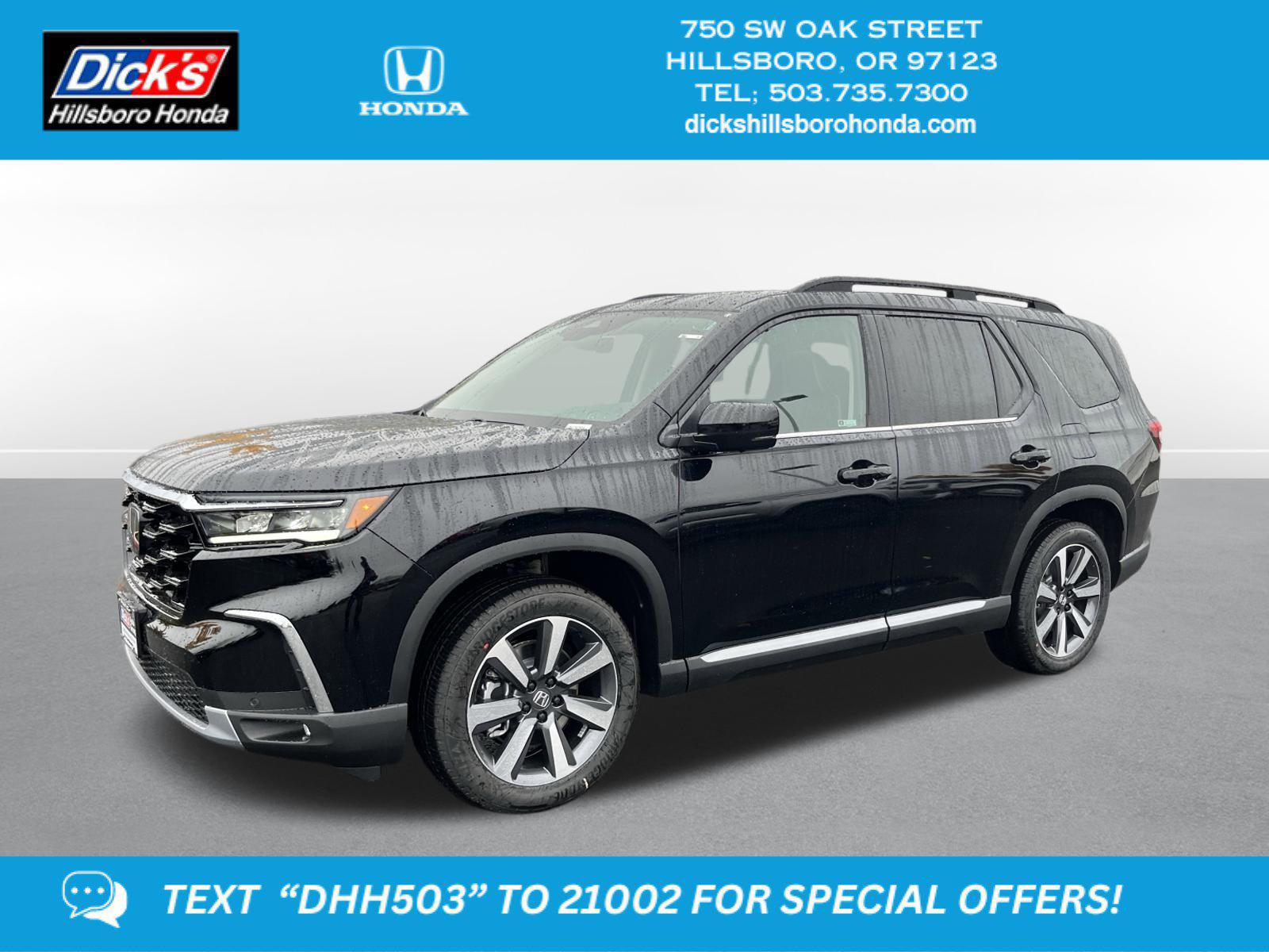 2025 Honda Pilot Elite Crystal Black Pearl AWD 10-Speed Automatic 3.5L V6 DOHC 24VAWD, 12 Speakers, 3rd row seats: split-bench, 4-Wheel Disc Brakes, 4.167 Axle Ratio, ABS brakes, Adaptive Cruise Control: Adaptive Cruise Control (ACC) with Low-Speed Follow, Air Conditioning, Alloy wheels, AM/FM radio: SiriusXM, Apple CarPlay/Android Auto, Auto High-beam Headlights, Auto-dimming door mirrors, Auto-dimming Rear-View mirror, Automatic temperature control, Blind Spot Information (BSI) System warning, Bose Premium Sound System, Brake assist, Bumpers: body-color, Compass, Delay-off headlights, Driver door bin, Driver vanity mirror, Dual front impact airbags, Dual front side impact airbags, Electronic Stability Control, Emergency communication system: HondaLink, Exterior Parking Camera Rear, Four wheel independent suspension, Front anti-roll bar, Front Bucket Seats, Front Center Armrest, Front dual zone A/C, Front fog lights, Front reading lights, Fully automatic headlights, Garage door transmitter: HomeLink, Heads-Up Display, Heated & Ventilated Front Bucket Seats, Heated door mirrors, Heated front seats, Heated rear seats, Heated steering wheel, Honda Satellite-Linked Navigation System, HondaLink Subscription Services, Illuminated entry, Knee airbag, Lane departure: Lane Keeping Assist System (LKAS) active, Low tire pressure warning, Memory seat, Navigation system: Honda Satellite-Linked Navigation System, Occupant sensing airbag, Outside temperature display, Overhead airbag, Overhead console, Panic alarm, Passenger door bin, Passenger vanity mirror, Perforated Leather Seat Trim, Power door mirrors, Power driver seat, Power Liftgate, Power moonroof, Power passenger seat, Power steering, Power windows, Radio data system, Rain sensing wipers, Rear air conditioning, Rear anti-roll bar, Rear reading lights, Rear seat center armrest, Rear window defroster, Rear window wiper, Reclining 3rd row seat, Remote keyless entry, Security system, SiriusXM, Speed control, Speed-sensing steering, Speed-Sensitive Wipers, Split folding rear seat, Spoiler, Steering wheel mounted audio controls, Tachometer, Telescoping steering wheel, Tilt steering wheel, Traction control, Trip computer, Turn signal indicator mirrors, Variably intermittent wipers, Ventilated front seats, Wheels: 20 Shark Gray Machine Face w/Blk Lug Nuts, AWD. This 2025 Honda Pilot Elite features a Crystal Black Pearl exterior with a Black interior. Factory equipped with an impressive 3.5 l, and an 10-speed automatic w/od with awd.*DESIRABLE FEATURES:* Navigation, Remote start, Backup camera, Heated seating, WiFi capability, Moonroof, Bluetooth, Leather, Heated steering, Power liftgate, Premium audio, 3rd row seat, Multi-zone AC. Your 2025 Honda Pilot Elite is one of 12 other SUVs like this in stock Beaverton drivers will find available to test drive at our new SUV showroom in Hillsboro, OR. This Honda Pilot is perfect for any ones SUV needs in our neighboring communities of Portland, Hillsboro & Beaverton, OR.*TECHNOLOGY FEATURES:* This Honda Pilot for sale near Portland includes Heads Up Display, Remote Engine Start, Navigation System, Premium Sound System, WiFi Mobile Hotspot, GPS System, Keyless Start, Smart Device Integration, SiriusXM Satellite Radio, Bluetooth Connection, Garage Door Opener, HD Radio, Keyless Entry.*Our Honda Dealership:* Call Dicks Hillsboro Honda today at *503-735-7310 to schedule your test drive* of this 2025 Honda Pilot Elite! Dicks Hillsboro Honda features a wide selection of new Honda SUVs for sale near Portland, Hillsboro & Beaverton Oregon. You can also visit us at, 750 SW Oak St. Hillsboro OR, 97123 to check it out in person!*MECHANICAL FEATURES:* Installed mechanical features include All Wheel Drive, Power One-touch down windows, Push Button Start, Heated Mirrors, Traction Control, Power Mirrors, Power Locks, Ventilated Disc Brakes, Power Passenger Seat, Cruise Control, Locking Rear Differential, Intermittent Wipers, Remote Trunk Release, Trip Computer, Tires - Rear Performance, Tires - Front Performance, Power Steering, Variable Speed Intermittent Wipers*INTERIOR OPTIONS:* Heated Rear Seats, Panoramic Roof, Heated Steering Wheel, Dual Power Seats, Moon Roof, Heated Front Seats, Leather Seats, Air Conditioned Front Seats, Automatic Climate Control, Third Row Seats, Leather Wrapped Steering Wheel, Power Drivers Seat, Adjustable Lumbar Seats, Memory Seats, Air Conditioning, Bucket Front Seats, Memory Mirrors, Driver Illuminated Vanity Mirror, Steering Wheel Audio Controls, Pass-Through Rear Seat, Multi-zone Climate Control, Passenger Illuminated Visor Mirror, Auto Dimming R/V Mirror, Rear Window Defroster, Floor Mats, Tilt Steering Wheel, Bench Seats, Auxiliary Audio Input, Trip Odometer, Vanity Mirrors, AM/FM Stereo. Beaverton new Honda SUV dealers simply cannot compete with Dicks Hillsboro Honda attention to stocking Honda SUVs with the most popular interior options.*EXTERIOR OPTIONS:* Fog Lights, Aluminum Wheels, Power Hands-Free Liftgate, Power Folding Mirrors, Privacy Glass, Auto Headlamp, Spoiler, Spare Tire *Small Size**SAFETY OPTIONS:* Blind Spot Monitoring, Lane Departure Warning, Cross Traffic Alerts, Rain Sensing Wipers, Electronic Stability Control, Rear Parking Aid, Lane Keeping Assist System, Back-Up Camera, Adaptive Cruise Control, Daytime Running Lights, Front Collision Mitigation, Security System, Cruise Control Steering Assist, Brake Assist, LED Headlights, Integrated Turn Signal Mirrors, Tire Pressure Monitoring System, Drivers Air Bag, ABS Brakes, Ground view camera, Driver Alert System, Knee AirBag, Rear Air Bag, Driver Front Side Impact Air Bag, Passenger Air Bag Sensor, Child Proof Locks, Front Head Air BagOREGON'S BEST HONDA FINANCIAL CREDIT FINANCE RATES: are right here at Dicks Hillsboro Honda Hillsboro Dealership where we offer the most competitive Honda Financial finance rates near Portland for new & Certified Honda Financial Financing. Our brand Finance experts have solutions for everyone