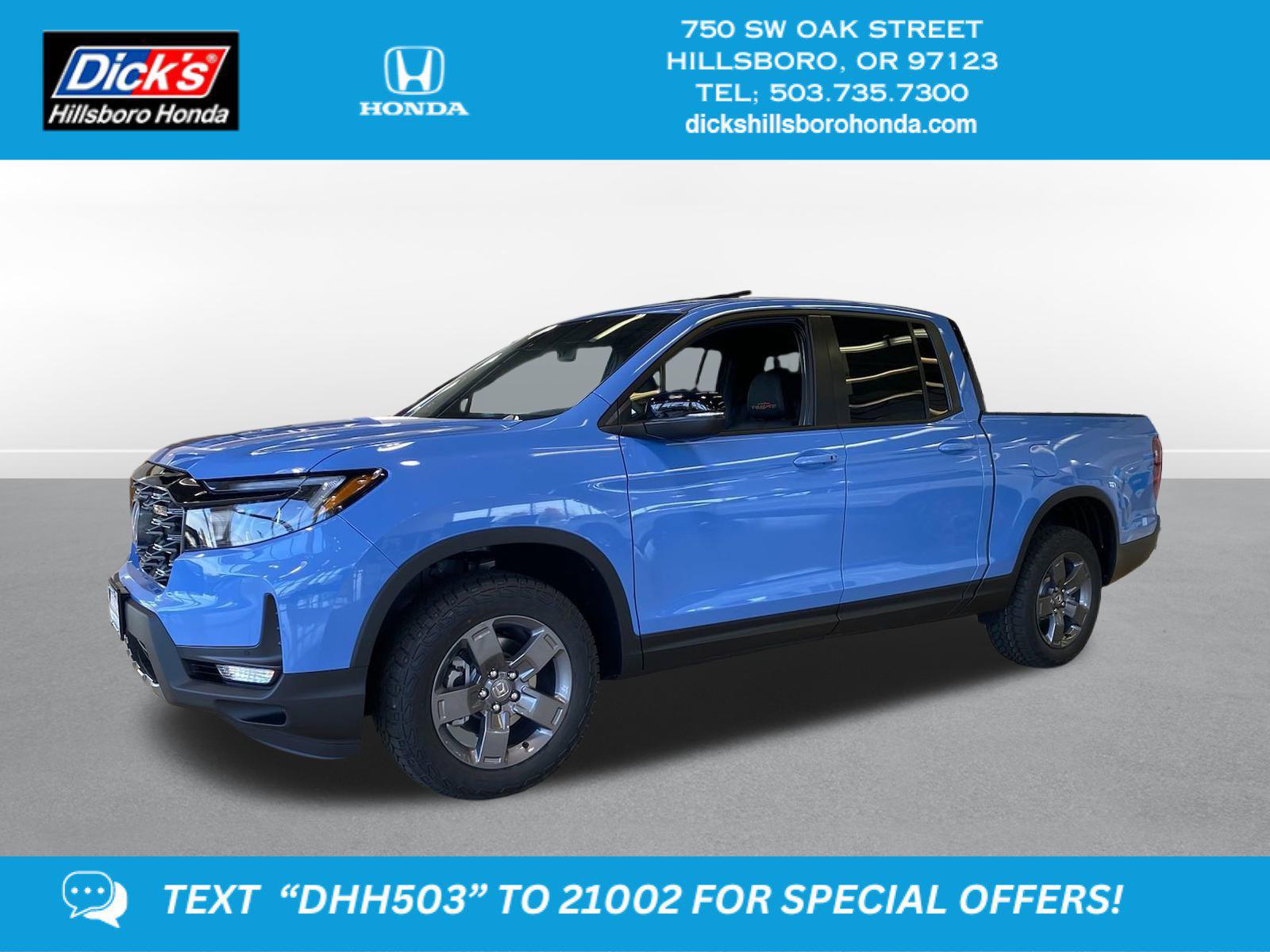 2025 Honda Ridgeline TrailSport Diffused Sky Pearl AWD 9-Speed Automatic 3.5L V6 SOHC i-VTEC 24VBlack Leather, 4-Wheel Disc Brakes, 4.33 Axle Ratio, 7 Speakers, ABS brakes, Air Conditioning, Alloy wheels, AM/FM radio: SiriusXM, Auto-dimming Rear-View mirror, Automatic temperature control, Blind Spot Information (BSI) System warning, Bluetooth® Hands-Free Link, Brake assist, Bumpers: body-color, Compass, Delay-off headlights, Driver door bin, Driver vanity mirror, Driver's Seat Mounted Armrest, Dual front impact airbags, Dual front side impact airbags, Electronic Stability Control, Emergency communication system: HondaLink Assist, Exterior Parking Camera Rear, Four wheel independent suspension, Front anti-roll bar, Front Bucket Seats, Front dual zone A/C, Front fog lights, Front reading lights, Fully automatic headlights, Garage door transmitter: HomeLink, Heated door mirrors, Heated Front Bucket Seats, Heated front seats, Heated steering wheel, Honda Satellite-Linked Navigation System, Illuminated entry, Leather Seat Trim, Leather steering wheel, Low tire pressure warning, Memory seat, Navigation system: Honda Satellite-Linked Navigation System, Occupant sensing airbag, Outside temperature display, Overhead airbag, Overhead console, Panic alarm, Passenger door bin, Passenger seat mounted armrest, Passenger vanity mirror, Power door mirrors, Power driver seat, Power moonroof, Power passenger seat, Power steering, Power windows, Radio data system, Radio: 215-Watt Audio System w/7 Speakers, Rear air conditioning, Rear anti-roll bar, Rear reading lights, Rear seat center armrest, Rear step bumper, Rear window defroster, Remote keyless entry, Security system, SiriusXM, Speed control, Speed-sensing steering, Split folding rear seat, Steering wheel mounted audio controls, Tachometer, Telescoping steering wheel, Tilt steering wheel, Traction control, Trip computer, Turn signal indicator mirrors, Variably intermittent wipers, Wheels: 18 TrailSport Pewter Gray Alloy, Black Leather.Recent Arrival! This 2025 Honda Ridgeline TrailSport features a Diffused Sky Pearl exterior with a Black interior. Factory equipped with an impressive 3.5 l, and an 9-speed automatic w/od with awd.*DESIRABLE FEATURES:* Navigation, Remote start, Backup camera, Heated steering, Heated seating, Bluetooth, Moonroof, Multi-zone AC. Your 2025 Honda Ridgeline TrailSport is one of 11 other trucks like this in stock Portland drivers will find available to test drive at our new truck showroom in Hillsboro, OR. This Honda Ridgeline is perfect for any ones truck needs in our neighboring communities of Portland, Hillsboro & Beaverton, OR.*TECHNOLOGY FEATURES:* This Honda Ridgeline for sale near Beaverton includes GPS System, Navigation System, Remote Engine Start, Keyless Start, Bluetooth Connection, Garage Door Opener, Smart Device Integration, SiriusXM Satellite Radio, HD Radio, Keyless Entry.*Our Honda Dealership:* Call Dicks Hillsboro Honda today at *(503) 616-4532 to schedule your test drive* of this 2025 Honda Ridgeline TrailSport! Dicks Hillsboro Honda features a wide selection of new Honda trucks for sale near Portland, Hillsboro & Beaverton, OR. You can also visit us at, 750 SW Oak St. Hillsboro OR, 97123 to check it out in person!*MECHANICAL FEATURES:* Installed mechanical features include All Wheel Drive, Heated Mirrors, Power One-touch Down windows, Push Button Start, Power Locks, Traction Control, Power Mirrors, Locking Rear Differential, Cruise Control, Power Passenger Seat, Ventilated Disc Brakes, Intermittent Wipers, Power Steering, Tires- All-Terrain, Trip Computer, Variable Speed Intermittent Wipers*INTERIOR OPTIONS:* Moon Roof, Dual Power Seats, Heated Front Seats, Automatic Climate Control, Heated Steering Wheel, Premium Synthetic Seats, Leather Wrapped Steering Wheel, Memory Seats, Adjustable Lumbar Seats, Power Drivers Seat, Pass-Through Rear Seat, Driver Illuminated Vanity Mirror, Steering Wheel Audio Controls, Air Conditioning, Memory Mirrors, Bucket Front Seats, Multi-zone Climate Control, Auto Dimming R/V Mirror, Passenger Illuminated Visor Mirror, AM/FM Stereo, Auxiliary Audio Input, Bench Seats, Tilt Steering Wheel, Vanity Mirrors, Floor Mats, Rear Window Defroster, Trip Odometer. Portland new Honda truck dealers simply cannot compete with Dicks Hillsboro Honda attention to stocking Honda trucks with the most popular interior options*EXTERIOR OPTIONS:* Aluminum Wheels, Fog Lights, Trailer Hitch Receiver, Power Folding Mirrors, Privacy Glass, Auto Headlamp, Spare Tire *Small Size**SAFETY OPTIONS:* Rear Parking Aid, Back-Up Camera, Cross Traffic Alerts, Electronic Stability Control, Lane Keeping Assist System, Lane Departure Warning, Blind Spot Monitoring, LED Headlights, Front Collision Mitigation, Integrated Turn Signal Mirrors, Daytime Running Lights, Brake Assist, Adaptive Cruise Control, Security System, Tire Pressure Monitoring System, Rear Air Bag, ABS Brakes, Drivers Air Bag, Child Proof Locks, Passenger Air Bag Sensor, Front Head Air Bag, Driver Front Side Impact Air BagOREGON'S BEST HONDA FINANCIAL CREDIT FINANCE RATES: are right here at Dicks Hillsboro Honda Hillsboro Dealership where we offer the most competitive Honda Financial finance rates near Beaverton for new & Certified Honda Financial Financing. Our brand Finance experts have solutions for everyone including bad credit car loans or first time buyer financing programs.Dicks Hillsboro Honda New Honda Light Duty, Heavy Duty and Commercial Truck dealership in Northwest Oregon is an easy drive or fly in from anywhere in the United States. Our Honda dealership sits just west of Portland.When choosing Honda dealers Beaverton shoppers prefer the short drive to Hillsboro where Dick's Hillsboro Honda has a new Honda Superstore and has the best customer service. We're glad you found this new Honda Ridgeline for sale at our Honda dealership near you in Portland in Hillsboro, OR. Looking for Honda financing? Our Dicks Hillsboro Honda finance speciali