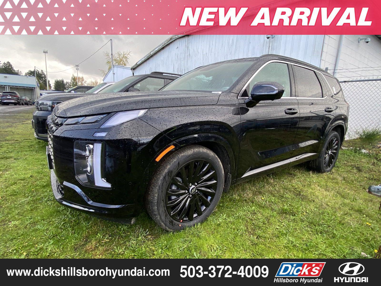2025 Hyundai Palisade Calligraphy Night Edition Abyss Black Pearl AWD V6 8-Speed Automatic with SHIFTRONIC12 Speakers, 3rd row seats: split-bench, 4-Wheel Disc Brakes, ABS brakes, Air Conditioning, Alloy wheels, AM/FM radio: SiriusXM, Apple CarPlay & Android Auto, Auto High-beam Headlights, Auto-dimming door mirrors, Auto-dimming Rear-View mirror, Auto-leveling suspension, Automatic temperature control, Brake assist, Bumper Applique, Bumpers: body-color, Cargo Block, Cargo Net, Carpeted Floor Mats, Compass, Delay-off headlights, Driver door bin, Driver vanity mirror, Dual front impact airbags, Dual front side impact airbags, Electronic Stability Control, Emergency communication system, Exterior Parking Camera Rear, First Aid Kit, Four wheel independent suspension, Front anti-roll bar, Front Bucket Seats, Front Center Armrest, Front dual zone A/C, Front reading lights, Fully automatic headlights, Garage door transmitter: HomeLink, harman/kardon® Speakers, Heads-Up Display, Heated & Ventilated Front Bucket Seats, Heated door mirrors, Heated front seats, Heated rear seats, Heated steering wheel, Illuminated entry, Knee airbag, Leather steering wheel, Low tire pressure warning, Memory seat, Microfiber Suede Seat Trim, Mudguards, Navigation System, Occupant sensing airbag, Option Group 01, Outside temperature display, Overhead airbag, Overhead console, Panic alarm, Passenger door bin, Passenger vanity mirror, Power door mirrors, Power driver seat, Power Liftgate, Power moonroof, Power passenger seat, Power steering, Power windows, Radio data system, Radio: AM/FM/MP3 Premium Audio System, Rain sensing wipers, Rear air conditioning, Rear anti-roll bar, Rear audio controls, Rear reading lights, Rear side impact airbag, Rear window defroster, Rear window wiper, Reclining 3rd row seat, Remote keyless entry, Roadside Assistance Kit, Roof rack, Security system, Speed control, Speed-sensing steering, Split folding rear seat, Spoiler, Steering wheel mounted audio controls, Tachometer, Telescoping steering wheel, Tilt steering wheel, Traction control, Trip computer, Turn signal indicator mirrors, Variably intermittent wipers, Ventilated front seats, Ventilated rear seats, Wheel Locks, Wheels: 20 x 7.5J Black Liquid Paint Alloy.Recent Arrival!