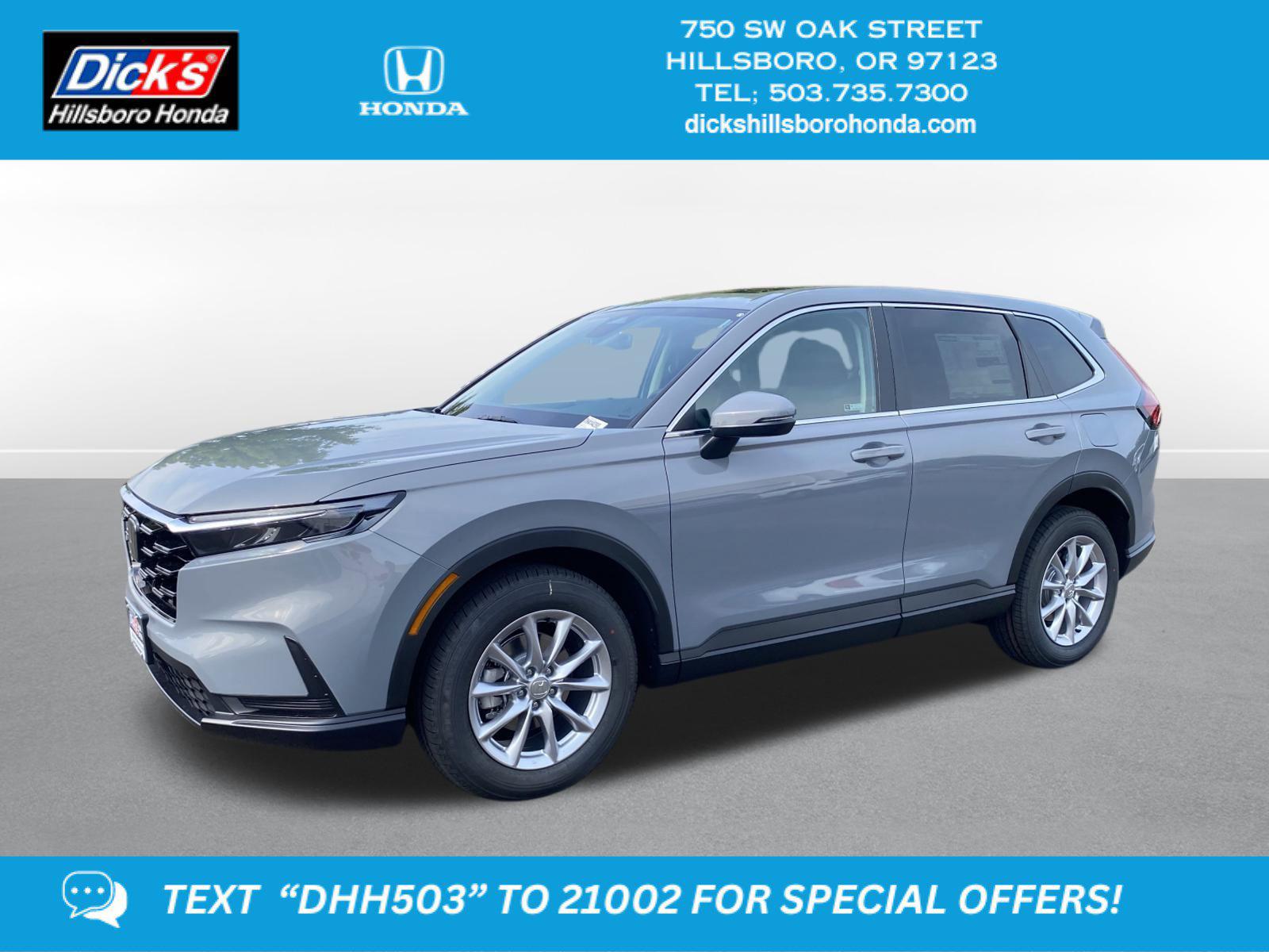 2026 Honda CR-V EX Urban Gray Pearl AWD CVT 1.5L I4 DOHC 16VAWD, 4-Wheel Disc Brakes, 6 Speakers, ABS brakes, Adaptive Cruise Control: Adaptive Cruise Control (ACC) with Low-Speed Follow, Air Conditioning, Alloy wheels, Apple CarPlay/Android Auto, Auto High-beam Headlights, Automatic temperature control, Blind Spot Information (BSI) System warning, Brake assist, Bumpers: body-color, Cloth Seat Trim, Compass, Delay-off headlights, Driver door bin, Driver vanity mirror, Dual front impact airbags, Dual front side impact airbags, Electronic Stability Control, Exterior Parking Camera Rear, Four wheel independent suspension, Front anti-roll bar, Front Bucket Seats, Front Center Armrest, Front dual zone A/C, Front reading lights, Fully automatic headlights, Heated door mirrors, Heated Front Bucket Seats, Heated front seats, Illuminated entry, Knee airbag, Low tire pressure warning, Occupant sensing airbag, Outside temperature display, Overhead airbag, Overhead console, Panic alarm, Passenger door bin, Passenger vanity mirror, Power door mirrors, Power driver seat, Power moonroof, Power steering, Power windows, Radio data system, Radio: 240-Watt AM/FM Audio System, Rear anti-roll bar, Rear reading lights, Rear seat center armrest, Rear side impact airbag, Rear window defroster, Rear window wiper, Remote keyless entry, Security system, Speed control, Speed-sensing steering, Speed-Sensitive Wipers, Split folding rear seat, Spoiler, Steering wheel mounted audio controls, Tachometer, Telescoping steering wheel, Tilt steering wheel, Traction control, Trip computer, Turn signal indicator mirrors, Variably intermittent wipers, Wheels: 18 Sparkle Silver, AWD.27/31 City/Highway MPG This 2026 Honda CR-V EX features a Urban Gray Pearl exterior with a Black interior. Factory equipped with an impressive 1.5 l, and an cvt w/od with awd.*DESIRABLE FEATURES:* Remote start, Backup camera, Turbocharged, Heated seating, Moonroof, Bluetooth, Multi-zone AC. Your 2026 Honda CR-V EX is one of 17 other SUVs like this in stock Beaverton drivers will find available to test drive at our new SUV showroom in Hillsboro, OR. This Honda CR-V is perfect for any ones SUV needs in our neighboring communities of Portland, Hillsboro & Beaverton, OR.*TECHNOLOGY FEATURES:* This Honda CR-V for sale near Portland includes Remote Engine Start, Keyless Start, Smart Device Integration, Bluetooth Connection, Keyless Entry.*Our Honda Dealership:* Call Dicks Hillsboro Honda today at *503-735-7310 to schedule your test drive* of this 2026 Honda CR-V EX! Dicks Hillsboro Honda features a wide selection of new Honda SUVs for sale near Portland, Hillsboro & Beaverton Oregon. You can also visit us at, 750 SW Oak St. Hillsboro OR, 97123 to check it out in person!*MECHANICAL FEATURES:* Installed mechanical features include All Wheel Drive, Turbocharged Engine, Power One-touch down windows, Push Button Start, Heated Mirrors, Power Mirrors, Power Locks, Traction Control, Ventilated Disc Brakes, Cruise Control, Intermittent Wipers, Power Steering, Tires - Rear All-Season, Tires - Front All-Season, Variable Speed Intermittent Wipers, Trip Computer*INTERIOR OPTIONS:* Heated Front Seats, Moon Roof, Automatic Climate Control, Power Drivers Seat, Cloth Seats, Adjustable Lumbar Seats, Steering Wheel Audio Controls, Air Conditioning, Driver Illuminated Vanity Mirror, Pass-Through Rear Seat, Bucket Front Seats, Passenger Illuminated Visor Mirror, Multi-zone Climate Control, Floor Mats, Rear Window Defroster, Tilt Steering Wheel, Auxiliary Audio Input, Bench Seats, Trip Odometer, AM/FM Stereo, Vanity Mirrors. Beaverton new Honda SUV dealers simply cannot compete with Dicks Hillsboro Honda attention to stocking Honda SUVs with the most popular interior options.*EXTERIOR OPTIONS:* Aluminum Wheels, Privacy Glass, Auto Headlamp, Spoiler, Spare Tire *Small Size**SAFETY OPTIONS:* Lane Departure Warning, Back-Up Camera, Blind Spot Monitoring, Lane Keeping Assist System, Electronic Stability Control, Cross Traffic Alerts, Front Collision Mitigation, Rear Collision Warning, Integrated Turn Signal Mirrors, Security System, Daytime Running Lights, Cruise Control Steering Assist, Brake Assist, LED Headlights, Adaptive Cruise Control, Tire Pressure Monitoring System, ABS Brakes, Drivers Air Bag, Knee AirBag, Driver Alert System, Rear Air Bag, Child Proof Locks, Passenger Air Bag Sensor, Driver Front Side Impact Air Bag, Front Head Air BagOREGON'S BEST HONDA FINANCIAL CREDIT FINANCE RATES: are right here at Dicks Hillsboro Honda Hillsboro Dealership where we offer the most competitive Honda Financial finance rates near Portland for new & Certified Honda Financial Financing. Our brand Finance experts have solutions for everyone including bad credit car loans or first time buyer financing programs.Dicks Hillsboro Honda New Honda SUV dealership in Northwest Oregon is an easy drive or fly in from anywhere in the United States. Our Honda dealership sits just west of Beaverton.When choosing Honda dealers Portland shoppers prefer the short drive to Hillsboro where Dick's Hillsboro Honda has a new Honda Superstore and has the best customer service. We're glad you found this new Honda CR-V for sale at our Honda dealership near you in Beaverton in Hillsboro, OR. Looking for Honda financing? Our Dicks Hillsboro Honda finance specialist will find the best rates available for this new Honda CR-V for sale. Dicks Hillsboro Honda has new cars for sale and used cars for sale in Hillsboro just west of Portland.Dicks Hillsboro Honda New Honda SUV Super center sits just west of Beaverton. We stock and special order the new Honda SUV models Portland, Hillsboro & Beaverton OR SUV shoppers prefer, like this 2026 Honda CR-V EX Stock# TH414290.