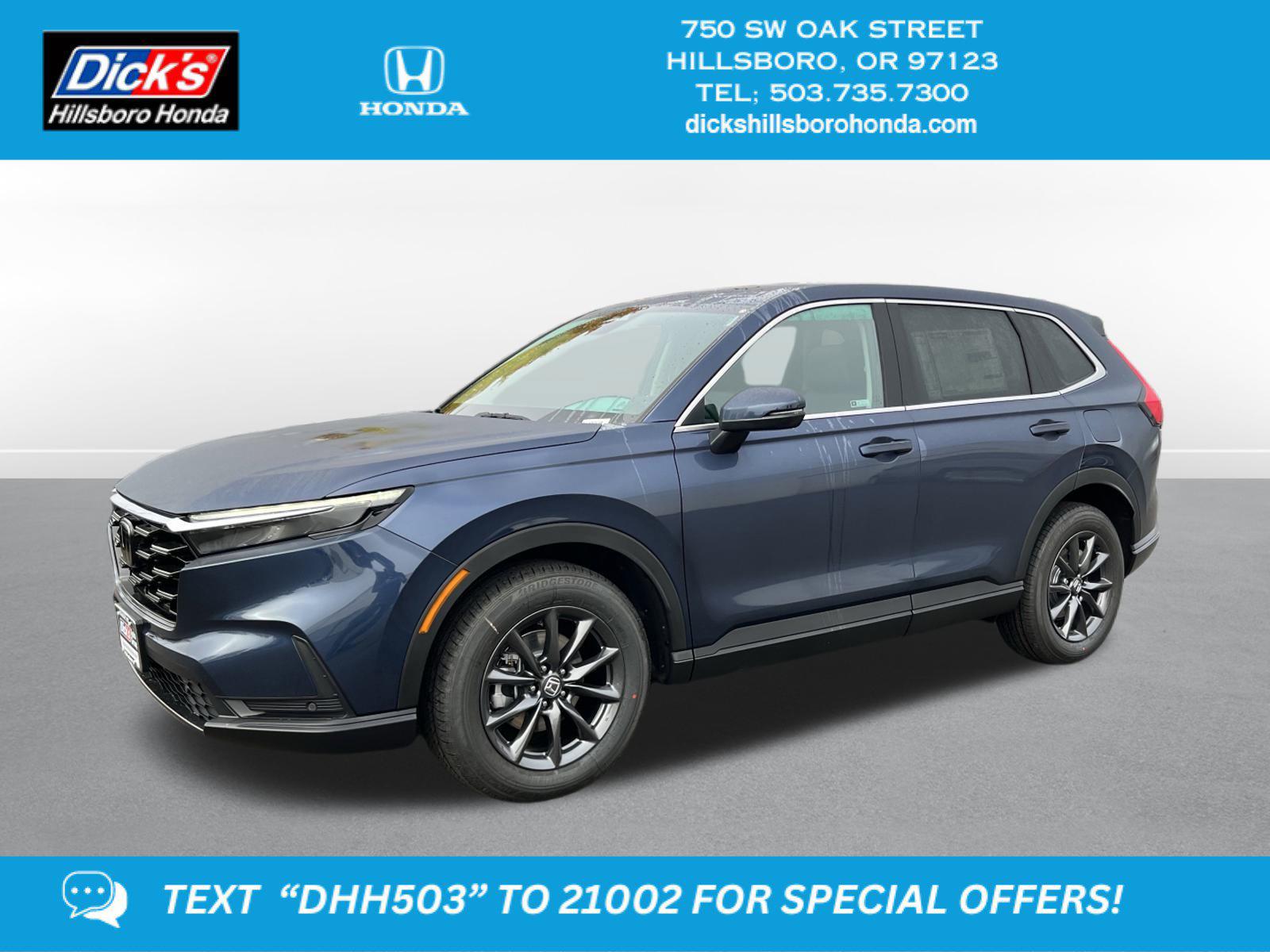 2026 Honda CR-V EX-L Canyon River Blue Metallic AWD CVT 1.5L I4 DOHC 16VAWD, 4-Wheel Disc Brakes, 8 Speakers, ABS brakes, Adaptive Cruise Control: Adaptive Cruise Control (ACC) with Low-Speed Follow, Air Conditioning, Alloy wheels, Apple CarPlay/Android Auto, Auto High-beam Headlights, Auto-dimming Rear-View mirror, Automatic temperature control, Blind Spot Information (BSI) System warning, Brake assist, Bumpers: body-color, Compass, Delay-off headlights, Driver door bin, Driver vanity mirror, Dual front impact airbags, Dual front side impact airbags, Electronic Stability Control, Exterior Parking Camera Rear, Four wheel independent suspension, Front anti-roll bar, Front Bucket Seats, Front Center Armrest, Front dual zone A/C, Front reading lights, Fully automatic headlights, Heated door mirrors, Heated Front Bucket Seats, Heated front seats, Illuminated entry, Knee airbag, Leather Seat Trim, Leather Shift Knob, Leather steering wheel, Low tire pressure warning, Memory seat, Occupant sensing airbag, Outside temperature display, Overhead airbag, Overhead console, Panic alarm, Passenger door bin, Passenger vanity mirror, Power door mirrors, Power driver seat, Power Liftgate, Power moonroof, Power passenger seat, Power steering, Power windows, Radio data system, Radio: 320-Watt AM/FM Audio System, Rear anti-roll bar, Rear reading lights, Rear seat center armrest, Rear side impact airbag, Rear window defroster, Rear window wiper, Remote keyless entry, Security system, Speed control, Speed-sensing steering, Speed-Sensitive Wipers, Split folding rear seat, Spoiler, Steering wheel mounted audio controls, Tachometer, Telescoping steering wheel, Tilt steering wheel, Traction control, Trip computer, Turn signal indicator mirrors, Variably intermittent wipers, Wheels: 18 Shark Gray, AWD.27/31 City/Highway MPG This 2026 Honda CR-V EX-L features a Canyon River Blue Metallic exterior with a Black interior. Factory equipped with an impressive 1.5 l, and an cvt w/od with awd.*DESIRABLE FEATURES:* Remote start, Turbocharged, Backup camera, Bluetooth, Leather, Moonroof, Heated seating, Power liftgate, Multi-zone AC. Your 2026 Honda CR-V EX-L is one of 16 other SUVs like this in stock Beaverton drivers will find available to test drive at our new SUV showroom in Hillsboro, OR. This Honda CR-V is perfect for any ones SUV needs in our neighboring communities of Portland, Hillsboro & Beaverton, OR.*TECHNOLOGY FEATURES:* This Honda CR-V for sale near Portland includes Remote Engine Start, Keyless Start, Smart Device Integration, Bluetooth Connection, Keyless Entry.*Our Honda Dealership:* Call Dicks Hillsboro Honda today at *503-735-7310 to schedule your test drive* of this 2026 Honda CR-V EX-L! Dicks Hillsboro Honda features a wide selection of new Honda SUVs for sale near Portland, Hillsboro & Beaverton Oregon. You can also visit us at, 750 SW Oak St. Hillsboro OR, 97123 to check it out in person!*MECHANICAL FEATURES:* Installed mechanical features include Turbocharged Engine, All Wheel Drive, Push Button Start, Power One-touch down windows, Heated Mirrors, Traction Control, Power Mirrors, Power Locks, Cruise Control, Ventilated Disc Brakes, Power Passenger Seat, Intermittent Wipers, Power Steering, Tires - Front All-Season, Tires - Rear All-Season, Variable Speed Intermittent Wipers, Remote Trunk Release, Trip Computer*INTERIOR OPTIONS:* Automatic Climate Control, Dual Power Seats, Leather Seats, Moon Roof, Heated Front Seats, Power Drivers Seat, Memory Seats, Leather Wrapped Steering Wheel, Adjustable Lumbar Seats, Steering Wheel Audio Controls, Bucket Front Seats, Pass-Through Rear Seat, Air Conditioning, Driver Illuminated Vanity Mirror, Auto Dimming R/V Mirror, Passenger Illuminated Visor Mirror, Multi-zone Climate Control, Vanity Mirrors, Floor Mats, Auxiliary Audio Input, Rear Window Defroster, AM/FM Stereo, Tilt Steering Wheel, Trip Odometer, Bench Seats. Beaverton new Honda SUV dealers simply cannot compete with Dicks Hillsboro Honda attention to stocking Honda SUVs with the most popular interior options.*EXTERIOR OPTIONS:* Aluminum Wheels, Power Hands-Free Liftgate, Privacy Glass, Auto Headlamp, Spare Tire *Small Size*, Spoiler*SAFETY OPTIONS:* Cross Traffic Alerts, Electronic Stability Control, Lane Keeping Assist System, Blind Spot Monitoring, Lane Departure Warning, Rear Parking Aid, Back-Up Camera, Front Collision Mitigation, Brake Assist, Integrated Turn Signal Mirrors, Rear Collision Warning, Cruise Control Steering Assist, LED Headlights, Security System, Adaptive Cruise Control, Daytime Running Lights, Tire Pressure Monitoring System, Drivers Air Bag, Knee AirBag, ABS Brakes, Rear Air Bag, Driver Alert System, Passenger Air Bag Sensor, Front Head Air Bag, Driver Front Side Impact Air Bag, Child Proof LocksOREGON'S BEST HONDA FINANCIAL CREDIT FINANCE RATES: are right here at Dicks Hillsboro Honda Hillsboro Dealership where we offer the most competitive Honda Financial finance rates near Portland for new & Certified Honda Financial Financing. Our brand Finance experts have solutions for everyone including bad credit car loans or first time buyer financing programs.Dicks Hillsboro Honda New Honda SUV dealership in Northwest Oregon is an easy drive or fly in from anywhere in the United States. Our Honda dealership sits just west of Beaverton.When choosing Honda dealers Portland shoppers prefer the short drive to Hillsboro where Dick's Hillsboro Honda has a new Honda Superstore and has the best customer service. We're glad you found this new Honda CR-V for sale at our Honda dealership near you in Beaverton in Hillsboro, OR. Looking for Honda financing? Our Dicks Hillsboro Honda finance specialist will find the best rates available for this new Honda CR-V for sale. Dicks Hillsboro Honda has new cars for sale and used cars for sale in Hillsboro just west of Portland.Dicks Hillsboro Honda New Honda SUV Super center sits just west of Beaverton. We stock and special order the new Honda SUV models Port
