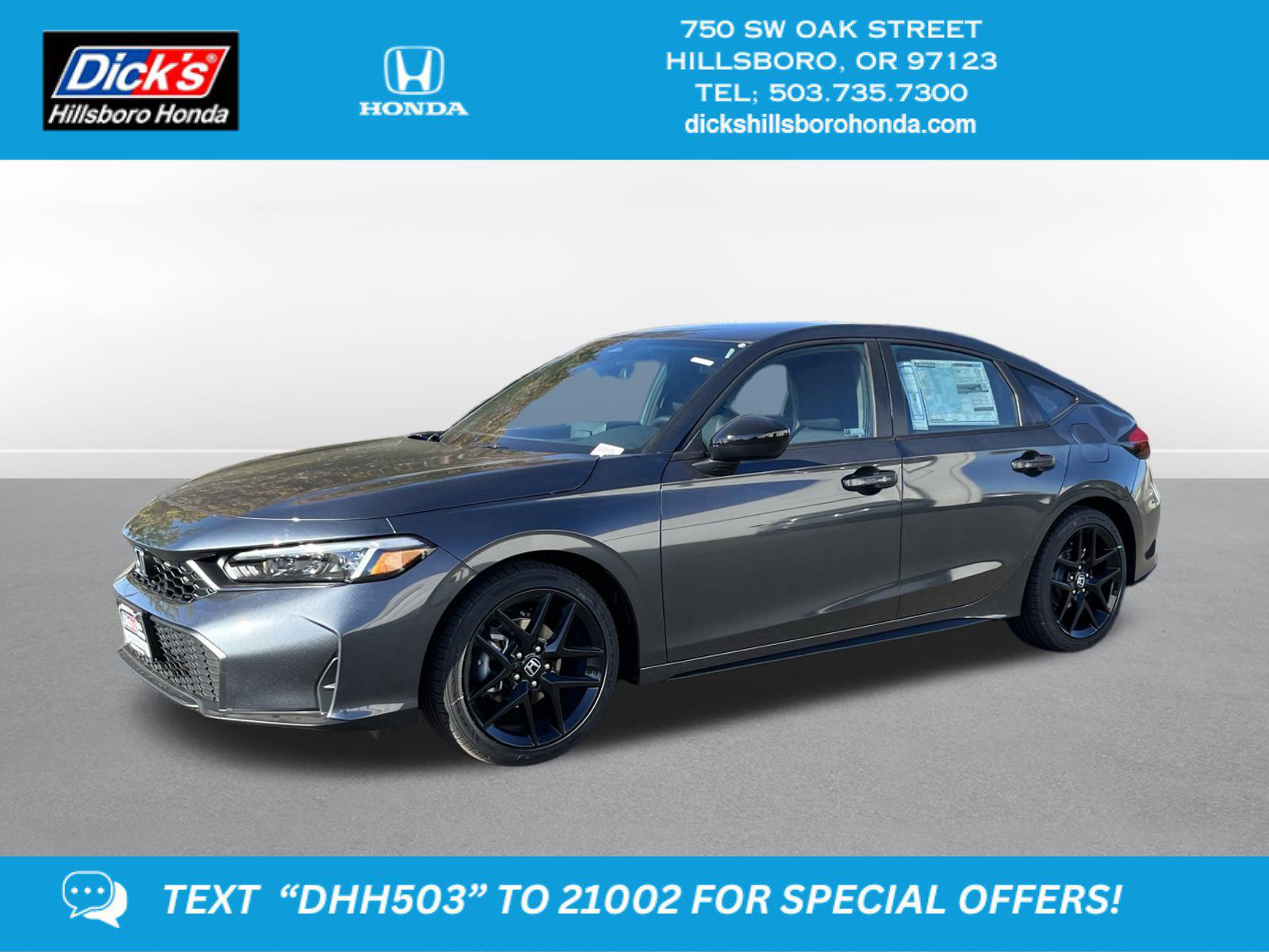 2026 Honda Civic Sport Meteorite Gray Metallic FWD CVT 2.0L I4 DOHC 16VBlack Artificial Leather, 4-Wheel Disc Brakes, 8 Speakers, ABS brakes, Adaptive Cruise Control: Adaptive Cruise Control (ACC) with Low-Speed Follow, Air Conditioning, Alloy wheels, AM/FM radio, Apple CarPlay/Android Auto, Auto High-beam Headlights, Automatic temperature control, Blind Spot Information (BSI) System warning, Brake assist, Bumpers: body-color, Cloth/Leatherette Seating Surfaces, Delay-off headlights, Driver door bin, Driver vanity mirror, Dual front impact airbags, Dual front side impact airbags, Electronic Stability Control, Emergency communication system: HondaLink, Exterior Parking Camera Rear, Four wheel independent suspension, Front anti-roll bar, Front Bucket Seats, Front Center Armrest, Front reading lights, Fully automatic headlights, Heated door mirrors, HondaLink, Illuminated entry, Knee airbag, Lane departure: Lane Keeping Assist System (LKAS) active, Leather Shift Knob, Low tire pressure warning, Occupant sensing airbag, Outside temperature display, Overhead airbag, Panic alarm, Passenger door bin, Passenger vanity mirror, Power door mirrors, Power steering, Power windows, Radio data system, Radio: 180-Watt Audio System, Rear anti-roll bar, Rear side impact airbag, Rear window defroster, Rear window wiper, Remote keyless entry, Security system, Speed control, Speed-sensing steering, Split folding rear seat, Steering wheel mounted audio controls, Tachometer, Telescoping steering wheel, Tilt steering wheel, Traction control, Trip computer, Wheels: 18 Gloss Black Alloy, Black Artificial Leather.30/38 City/Highway MPGThis 2026 Honda Civic Hatchback Sport features a Meteorite Gray Metallic exterior with a Black interior. Factory equipped with an impressive 2.0 l, and an cvt w/od transmission with fwd.*DESIRABLE FEATURES:* Remote start, Backup camera, Bluetooth. Your 2026 Honda Civic Hatchback Sport is one of 4 other models like this in stock Beaverton drivers will find available to test drive at our new vehicle showroom in Hillsboro, OR. This Honda Civic Hatchback is perfect for any ones car needs in our neighboring communities of Portland, Hillsboro & Beaverton, OR.*TECHNOLOGY FEATURES:* This Honda Civic Hatchback for sale near Portland includes Remote Engine Start, GPS System, Keyless Start, Smart Device Integration, Bluetooth Connection, Keyless Entry.*Our Honda Dealership in Hillsboro:* Call Dicks Hillsboro Honda today at *503-735-7310 to schedule your test drive* of this 2026 Honda Civic Hatchback Sport! Dicks Hillsboro Honda features a wide selection of new Honda vehicles for sale near Portland, Hillsboro & Beaverton Oregon. You can also visit us at, 750 SW Oak St. Hillsboro OR, 97123 to check it out in person!*MECHANICAL FEATURES:* Installed mechanical features include Power One-touch down windows, Heated Mirrors, Push Button Start, Traction Control, Power Locks, Front Wheel Drive, Power Mirrors, Ventilated Disc Brakes, Cruise Control, Intermittent Wipers, Power Steering, Variable Speed Intermittent Wipers, Tires - Front Performance, Trip Computer, Tires - Rear Performance*INTERIOR OPTIONS:* Automatic Climate Control, Premium Synthetic Seats, Cloth Seats, Steering Wheel Audio Controls, Air Conditioning, Bucket Front Seats, Pass-Through Rear Seat, Trip Odometer, Tilt Steering Wheel, Bench Seats, Auxiliary Audio Input, AM/FM Stereo, Floor Mats, Vanity Mirrors, Rear Window Defroster. Beaverton new Honda dealers simply cannot compete with Dicks Hillsboro Honda attention to stocking Honda cars, trucks & SUVs with the most popular interior options.*EXTERIOR OPTIONS:* Aluminum Wheels, Cargo Floor (Slide Out), Auto Headlamp, Spare Tire *Small Size**SAFETY OPTIONS:* Lane Departure Warning, Back-Up Camera, Lane Keeping Assist System, Electronic Stability Control, Blind Spot Monitoring, Cross Traffic Alerts, Front Collision Mitigation, LED Headlights, Adaptive Cruise Control, Cruise Control Steering Assist, Brake Assist, Daytime Running Lights, Security System, Tire Pressure Monitoring System, Drivers Air Bag, Knee AirBag, Rear Air Bag, Driver Alert System, ABS Brakes, Front Head Air Bag, Child Proof Locks, Driver Front Side Impact Air Bag, Passenger Air Bag SensorOREGON'S BEST HONDA FINANCIAL CREDIT FINANCE RATES: are right here at Dicks Hillsboro Honda Hillsboro Dealership where we offer the most competitive Honda Financial finance rates near Portland for new & Certified Honda Financial Financing. Our brand Finance experts have solutions for everyone including bad credit car loans or first time buyer financing programs.Dicks Hillsboro Honda New Honda dealership in Northwest Oregon is an easy drive or fly in from anywhere in the United States. Our Honda dealership sits just west of Beaverton.When choosing Honda dealers Portland shoppers prefer the short drive to Hillsboro where Dick's Hillsboro Honda has a new Honda Superstore and has the best customer service. We're glad you found this new Honda Civic Hatchback for sale at our Honda dealership near you in Beaverton in Hillsboro, OR. Looking for Honda financing? Our Dicks Hillsboro Honda finance specialist will find the best rates available for this new Honda Civic Hatchback for sale. Dicks Hillsboro Honda has new cars for sale and used cars for sale in Hillsboro just west of Portland.