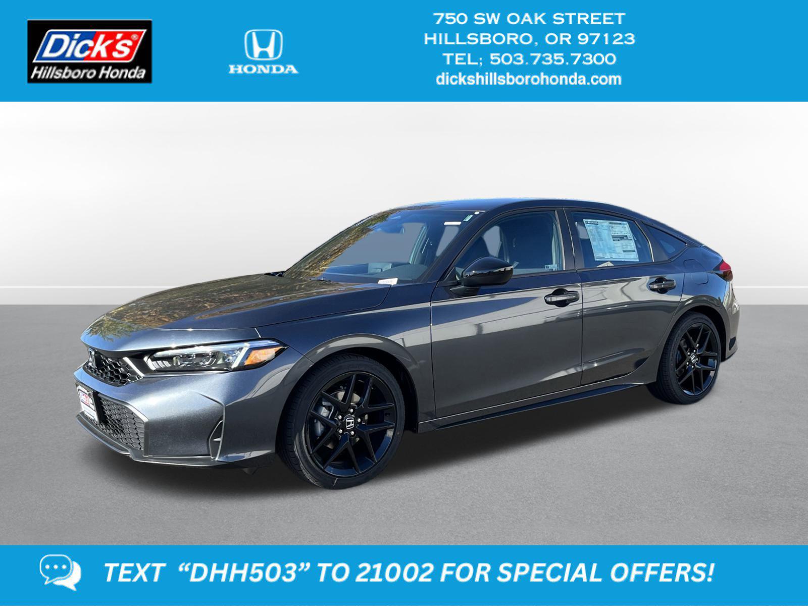 2026 Honda Civic Sport Meteorite Gray Metallic FWD CVT 2.0L I4 DOHC 16VBlack Artificial Leather, 4-Wheel Disc Brakes, 8 Speakers, ABS brakes, Adaptive Cruise Control: Adaptive Cruise Control (ACC) with Low-Speed Follow, Air Conditioning, Alloy wheels, AM/FM radio, Apple CarPlay/Android Auto, Auto High-beam Headlights, Automatic temperature control, Blind Spot Information (BSI) System warning, Brake assist, Bumpers: body-color, Cloth/Leatherette Seating Surfaces, Delay-off headlights, Driver door bin, Driver vanity mirror, Dual front impact airbags, Dual front side impact airbags, Electronic Stability Control, Emergency communication system: HondaLink, Exterior Parking Camera Rear, Four wheel independent suspension, Front anti-roll bar, Front Bucket Seats, Front Center Armrest, Front reading lights, Fully automatic headlights, Heated door mirrors, HondaLink, Illuminated entry, Knee airbag, Lane departure: Lane Keeping Assist System (LKAS) active, Leather Shift Knob, Low tire pressure warning, Occupant sensing airbag, Outside temperature display, Overhead airbag, Panic alarm, Passenger door bin, Passenger vanity mirror, Power door mirrors, Power steering, Power windows, Radio data system, Radio: 180-Watt Audio System, Rear anti-roll bar, Rear side impact airbag, Rear window defroster, Rear window wiper, Remote keyless entry, Security system, Speed control, Speed-sensing steering, Split folding rear seat, Steering wheel mounted audio controls, Tachometer, Telescoping steering wheel, Tilt steering wheel, Traction control, Trip computer, Wheels: 18 Gloss Black Alloy, Black Artificial Leather.30/38 City/Highway MPGThis 2026 Honda Civic Hatchback Sport features a Meteorite Gray Metallic exterior with a Black interior. Factory equipped with an impressive 2.0 l, and an cvt w/od transmission with fwd.*DESIRABLE FEATURES:* Remote start, Backup camera, Bluetooth. Your 2026 Honda Civic Hatchback Sport is one of 4 other models like this in stock Beaverton drivers will find available to test drive at our new vehicle showroom in Hillsboro, OR. This Honda Civic Hatchback is perfect for any ones car needs in our neighboring communities of Portland, Hillsboro & Beaverton, OR.*TECHNOLOGY FEATURES:* This Honda Civic Hatchback for sale near Portland includes GPS System, Remote Engine Start, Keyless Start, Bluetooth Connection, Smart Device Integration, Keyless Entry.*Our Honda Dealership in Hillsboro:* Call Dicks Hillsboro Honda today at *503-735-7310 to schedule your test drive* of this 2026 Honda Civic Hatchback Sport! Dicks Hillsboro Honda features a wide selection of new Honda vehicles for sale near Portland, Hillsboro & Beaverton Oregon. You can also visit us at, 750 SW Oak St. Hillsboro OR, 97123 to check it out in person!*MECHANICAL FEATURES:* Installed mechanical features include Push Button Start, Heated Mirrors, Power One-touch down windows, Power Locks, Traction Control, Front Wheel Drive, Power Mirrors, Cruise Control, Ventilated Disc Brakes, Intermittent Wipers, Tires - Rear Performance, Power Steering, Trip Computer, Tires - Front Performance, Variable Speed Intermittent Wipers*INTERIOR OPTIONS:* Premium Synthetic Seats, Automatic Climate Control, Cloth Seats, Steering Wheel Audio Controls, Pass-Through Rear Seat, Bucket Front Seats, Air Conditioning, Auxiliary Audio Input, AM/FM Stereo, Bench Seats, Floor Mats, Vanity Mirrors, Tilt Steering Wheel, Trip Odometer, Rear Window Defroster. Beaverton new Honda dealers simply cannot compete with Dicks Hillsboro Honda attention to stocking Honda cars, trucks & SUVs with the most popular interior options.*EXTERIOR OPTIONS:* Aluminum Wheels, Cargo Floor (Slide Out), Auto Headlamp, Spare Tire *Small Size**SAFETY OPTIONS:* Blind Spot Monitoring, Electronic Stability Control, Cross Traffic Alerts, Lane Keeping Assist System, Back-Up Camera, Lane Departure Warning, LED Headlights, Security System, Cruise Control Steering Assist, Brake Assist, Front Collision Mitigation, Adaptive Cruise Control, Daytime Running Lights, Driver Alert System, Rear Air Bag, ABS Brakes, Knee AirBag, Tire Pressure Monitoring System, Drivers Air Bag, Passenger Air Bag Sensor, Child Proof Locks, Front Head Air Bag, Driver Front Side Impact Air BagOREGON'S BEST HONDA FINANCIAL CREDIT FINANCE RATES: are right here at Dicks Hillsboro Honda Hillsboro Dealership where we offer the most competitive Honda Financial finance rates near Portland for new & Certified Honda Financial Financing. Our brand Finance experts have solutions for everyone including bad credit car loans or first time buyer financing programs.Dicks Hillsboro Honda New Honda dealership in Northwest Oregon is an easy drive or fly in from anywhere in the United States. Our Honda dealership sits just west of Beaverton.When choosing Honda dealers Portland shoppers prefer the short drive to Hillsboro where Dick's Hillsboro Honda has a new Honda Superstore and has the best customer service. We're glad you found this new Honda Civic Hatchback for sale at our Honda dealership near you in Beaverton in Hillsboro, OR. Looking for Honda financing? Our Dicks Hillsboro Honda finance specialist will find the best rates available for this new Honda Civic Hatchback for sale. Dicks Hillsboro Honda has new cars for sale and used cars for sale in Hillsboro just west of Portland.