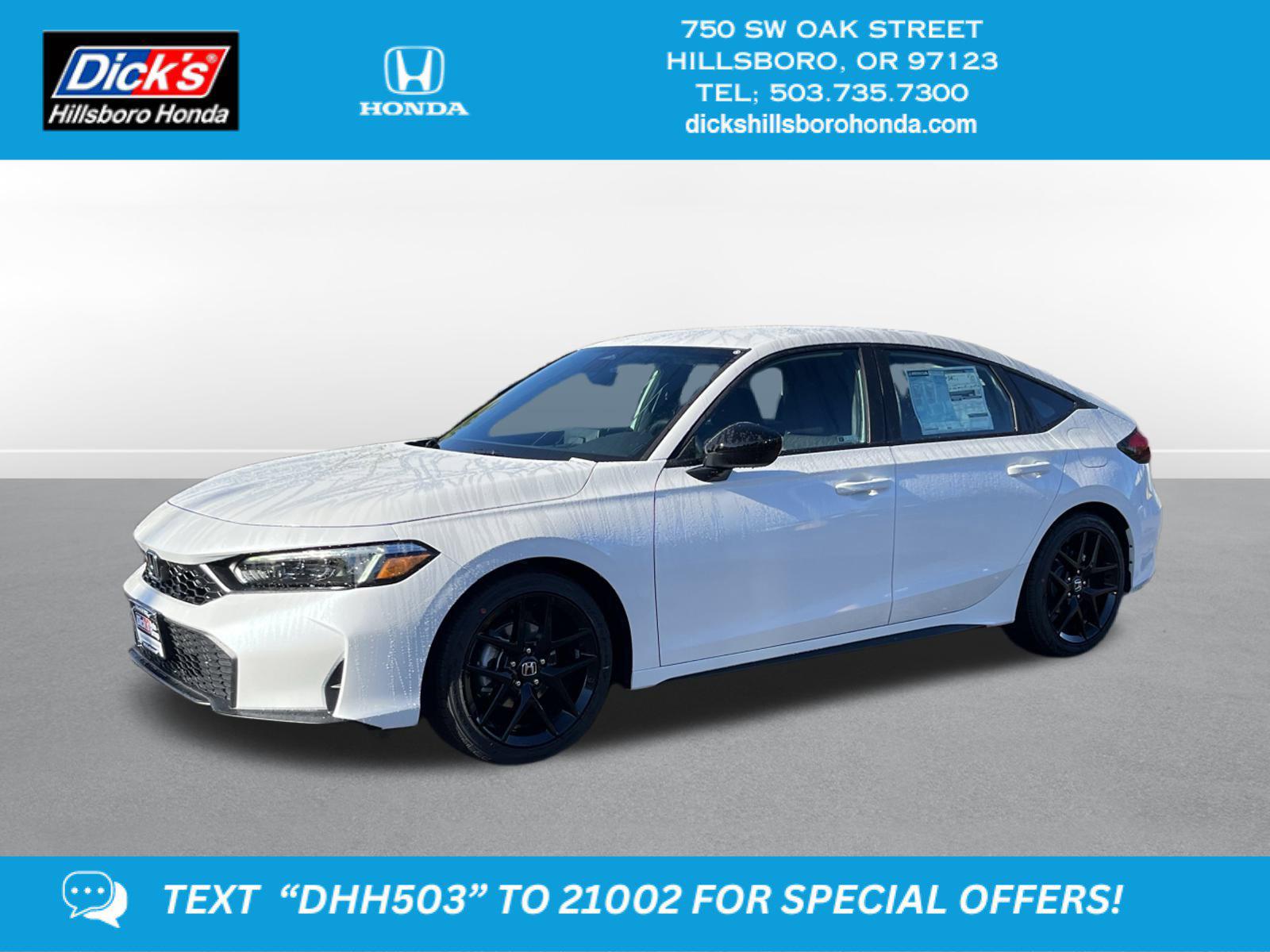 2026 Honda Civic Sport Platinum White Pearl FWD CVT 2.0L I4 DOHC 16VBlack Artificial Leather, 4-Wheel Disc Brakes, 8 Speakers, ABS brakes, Adaptive Cruise Control: Adaptive Cruise Control (ACC) with Low-Speed Follow, Air Conditioning, Alloy wheels, AM/FM radio, Apple CarPlay/Android Auto, Auto High-beam Headlights, Automatic temperature control, Blind Spot Information (BSI) System warning, Brake assist, Bumpers: body-color, Cloth/Leatherette Seating Surfaces, Delay-off headlights, Driver door bin, Driver vanity mirror, Dual front impact airbags, Dual front side impact airbags, Electronic Stability Control, Emergency communication system: HondaLink, Exterior Parking Camera Rear, Four wheel independent suspension, Front anti-roll bar, Front Bucket Seats, Front Center Armrest, Front reading lights, Fully automatic headlights, Heated door mirrors, HondaLink, Illuminated entry, Knee airbag, Lane departure: Lane Keeping Assist System (LKAS) active, Leather Shift Knob, Low tire pressure warning, Occupant sensing airbag, Outside temperature display, Overhead airbag, Panic alarm, Passenger door bin, Passenger vanity mirror, Power door mirrors, Power steering, Power windows, Radio data system, Radio: 180-Watt Audio System, Rear anti-roll bar, Rear side impact airbag, Rear window defroster, Rear window wiper, Remote keyless entry, Security system, Speed control, Speed-sensing steering, Split folding rear seat, Steering wheel mounted audio controls, Tachometer, Telescoping steering wheel, Tilt steering wheel, Traction control, Trip computer, Wheels: 18 Gloss Black Alloy, Black Artificial Leather.30/38 City/Highway MPGThis 2026 Honda Civic Hatchback Sport features a Platinum White Pearl exterior with a Black interior. Factory equipped with an impressive 2.0 l, and an cvt w/od transmission with fwd.*DESIRABLE FEATURES:* Remote start, Backup camera, Bluetooth. Your 2026 Honda Civic Hatchback Sport is one of 4 other models like this in stock Beaverton drivers will find available to test drive at our new vehicle showroom in Hillsboro, OR. This Honda Civic Hatchback is perfect for any ones car needs in our neighboring communities of Portland, Hillsboro & Beaverton, OR.*TECHNOLOGY FEATURES:* This Honda Civic Hatchback for sale near Portland includes GPS System, Remote Engine Start, Keyless Start, Smart Device Integration, Bluetooth Connection, Keyless Entry.*Our Honda Dealership in Hillsboro:* Call Dicks Hillsboro Honda today at *503-735-7310 to schedule your test drive* of this 2026 Honda Civic Hatchback Sport! Dicks Hillsboro Honda features a wide selection of new Honda vehicles for sale near Portland, Hillsboro & Beaverton Oregon. You can also visit us at, 750 SW Oak St. Hillsboro OR, 97123 to check it out in person!*MECHANICAL FEATURES:* Installed mechanical features include Push Button Start, Power One-touch down windows, Heated Mirrors, Traction Control, Power Mirrors, Power Locks, Front Wheel Drive, Ventilated Disc Brakes, Cruise Control, Intermittent Wipers, Trip Computer, Tires - Rear Performance, Power Steering, Variable Speed Intermittent Wipers, Tires - Front Performance*INTERIOR OPTIONS:* Premium Synthetic Seats, Automatic Climate Control, Cloth Seats, Bucket Front Seats, Steering Wheel Audio Controls, Air Conditioning, Pass-Through Rear Seat, Bench Seats, Vanity Mirrors, AM/FM Stereo, Auxiliary Audio Input, Trip Odometer, Rear Window Defroster, Floor Mats, Tilt Steering Wheel. Beaverton new Honda dealers simply cannot compete with Dicks Hillsboro Honda attention to stocking Honda cars, trucks & SUVs with the most popular interior options.*EXTERIOR OPTIONS:* Aluminum Wheels, Cargo Floor (Slide Out), Auto Headlamp, Spare Tire *Small Size**SAFETY OPTIONS:* Back-Up Camera, Lane Keeping Assist System, Electronic Stability Control, Blind Spot Monitoring, Lane Departure Warning, Cross Traffic Alerts, LED Headlights, Cruise Control Steering Assist, Security System, Adaptive Cruise Control, Front Collision Mitigation, Brake Assist, Daytime Running Lights, Rear Air Bag, ABS Brakes, Driver Alert System, Knee AirBag, Drivers Air Bag, Tire Pressure Monitoring System, Front Head Air Bag, Passenger Air Bag Sensor, Driver Front Side Impact Air Bag, Child Proof LocksOREGON'S BEST HONDA FINANCIAL CREDIT FINANCE RATES: are right here at Dicks Hillsboro Honda Hillsboro Dealership where we offer the most competitive Honda Financial finance rates near Portland for new & Certified Honda Financial Financing. Our brand Finance experts have solutions for everyone including bad credit car loans or first time buyer financing programs.Dicks Hillsboro Honda New Honda dealership in Northwest Oregon is an easy drive or fly in from anywhere in the United States. Our Honda dealership sits just west of Beaverton.When choosing Honda dealers Portland shoppers prefer the short drive to Hillsboro where Dick's Hillsboro Honda has a new Honda Superstore and has the best customer service. We're glad you found this new Honda Civic Hatchback for sale at our Honda dealership near you in Beaverton in Hillsboro, OR. Looking for Honda financing? Our Dicks Hillsboro Honda finance specialist will find the best rates available for this new Honda Civic Hatchback for sale. Dicks Hillsboro Honda has new cars for sale and used cars for sale in Hillsboro just west of Portland.
