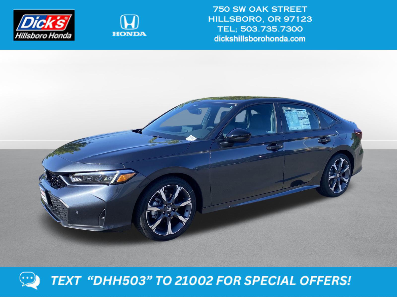 2026 Honda Civic Hybrid Sport Touring Meteorite Gray Metallic FWD eCVT 2.0L 16V DOHC2.0L 16V DOHC, 12 Speakers, 4-Wheel Disc Brakes, ABS brakes, Adaptive Cruise Control: Adaptive Cruise Control (ACC) with Low-Speed Follow, Air Conditioning, Alloy wheels, AM/FM radio, Apple CarPlay/Android Auto, Auto High-beam Headlights, Auto-dimming Rear-View mirror, Automatic temperature control, Blind Spot Information (BSI) System warning, Bose Premium Sound System, Brake assist, Bumpers: body-color, Compass, Delay-off headlights, Driver door bin, Driver vanity mirror, Dual front impact airbags, Dual front side impact airbags, Electronic Stability Control, Emergency communication system: HondaLink, Exterior Parking Camera Rear, Four wheel independent suspension, Front anti-roll bar, Front Bucket Seats, Front Center Armrest, Front dual zone A/C, Front reading lights, Fully automatic headlights, Heated door mirrors, Heated Front Bucket Seats, Heated front seats, Illuminated entry, Knee airbag, Leather Shift Knob, Leather steering wheel, Leather-Trimmed Seat Trim, Low tire pressure warning, Navigation system: Google Maps, Occupant sensing airbag, Outside temperature display, Overhead airbag, Overhead console, Panic alarm, Passenger door bin, Passenger vanity mirror, Power door mirrors, Power driver seat, Power moonroof, Power passenger seat, Power steering, Power windows, Radio data system, Rain sensing wipers, Rear anti-roll bar, Rear seat center armrest, Rear side impact airbag, Rear window defroster, Remote keyless entry, Security system, Speed control, Speed-sensing steering, Split folding rear seat, Steering wheel mounted audio controls, Tachometer, Telescoping steering wheel, Tilt steering wheel, Traction control, Trip computer, Turn signal indicator mirrors, Variably intermittent wipers, Wheels: 18 Alloy w/Matte Shark Gray Inserts, 2.0L 16V DOHC.50/47 City/Highway MPGThis 2026 Honda Civic Hybrid Sport Touring features a Meteorite Gray Metallic exterior with a Black interior. Factory equipped with an impressive 2.0 l, and a cvt w/od transmission with fwd.*DESIRABLE FEATURES:* Remote start, Navigation, Backup camera, WiFi capability, Moonroof, Leather, Heated seating, Bluetooth, Premium audio, Multi-zone AC. Your 2026 Honda Civic Hybrid Sport Touring is one of 11 other models like this in stock Beaverton drivers will find available to test drive at our new vehicle showroom in Hillsboro, OR. This Honda Civic Hybrid is perfect for any ones car needs in our neighboring communities of Portland, Hillsboro & Beaverton, OR.*TECHNOLOGY FEATURES:* This Honda Civic Hybrid for sale near Portland includes Navigation System, GPS System, Remote Engine Start, Premium Sound System, WiFi Mobile Hotspot, Keyless Start, Bluetooth Connection, Smart Device Integration, HD Radio, Keyless Entry.*Our Honda Dealership:* Call Dicks Hillsboro Honda today at *503-735-7310 to schedule your test drive* of this 2026 Honda Civic Hybrid Sport Touring! Dicks Hillsboro Honda features a wide selection of new Honda vehicles for sale near Portland, Hillsboro & Beaverton Oregon. You can also visit us at, 750 SW Oak St. Hillsboro OR, 97123 to check it out in person!*MECHANICAL FEATURES:* Installed mechanical features include Push Button Start, Heated Mirrors, Power One-touch down windows, Traction Control, Front Wheel Drive, Power Mirrors, Power Locks, Cruise Control, Ventilated Disc Brakes, Power Passenger Seat, Intermittent Wipers, Tires - Rear Performance, Tires - Front Performance, Trip Computer, Power Steering, Variable Speed Intermittent Wipers*INTERIOR OPTIONS:* Dual Power Seats, Leather Seats, Moon Roof, Automatic Climate Control, Heated Front Seats, Leather Wrapped Steering Wheel, Power Drivers Seat, Pass-Through Rear Seat, Air Conditioning, Bucket Front Seats, Steering Wheel Audio Controls, Multi-zone Climate Control, Auto Dimming R/V Mirror, Vanity Mirrors, AM/FM Stereo, Floor Mats, Auxiliary Audio Input, Trip Odometer, Tilt Steering Wheel, Bench Seats, Rear Window Defroster. Beaverton new Honda dealers simply cannot compete with Dicks Hillsboro Honda attention to stocking Honda cars, trucks & SUVs with the most popular interior options.*SAFETY OPTIONS:* Lane Departure Warning, Blind Spot Monitoring, Rear Parking Aid, Cross Traffic Alerts, Electronic Stability Control, Back-Up Camera, Lane Keeping Assist System, Rain Sensing Wipers, LED Headlights, Front Collision Mitigation, Daytime Running Lights, Integrated Turn Signal Mirrors, Brake Assist, Rear Collision Warning, Cruise Control Steering Assist, Security System, Adaptive Cruise Control, Tire Pressure Monitoring System, Drivers Air Bag, Knee AirBag, Rear Air Bag, ABS Brakes, Driver Alert System, Driver Front Side Impact Air Bag, Front Head Air Bag, Passenger Air Bag Sensor, Child Proof LocksOREGON'S BEST HONDA FINANCIAL CREDIT FINANCE RATES: are right here at Dicks Hillsboro Honda Hillsboro Dealership where we offer the most competitive Honda Financial finance rates near Portland for new & Certified Honda Financial Financing. Our brand Finance experts have solutions for everyone including bad credit car loans or first time buyer financing programs.Dicks Hillsboro Honda New Honda dealership in Northwest Oregon is an easy drive or fly in from anywhere in the United States. Our Honda dealership sits just west of Beaverton.When choosing Honda dealers Portland shoppers prefer the short drive to Hillsboro where Dick's Hillsboro Honda has a new Honda Superstore and has the best customer service. We're glad you found this new Honda Civic Hybrid for sale at our Honda dealership near you in Beaverton in Hillsboro, OR. Looking for Honda financing? Our Dicks Hillsboro Honda finance specialist will find the best rates available for this new Honda Civic Hybrid for sale. Dicks Hillsboro Honda has new cars for sale and used cars for sale in Hillsboro just west of Portland.