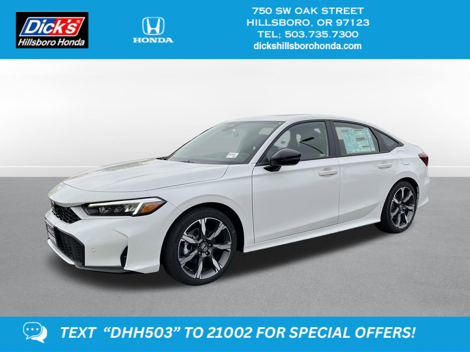2026 Honda Civic Hybrid Sport Touring Platinum White Pearl FWD eCVT 2.0L 16V DOHC2.0L 16V DOHC, 12 Speakers, 4-Wheel Disc Brakes, ABS brakes, Adaptive Cruise Control: Adaptive Cruise Control (ACC) with Low-Speed Follow, Air Conditioning, Alloy wheels, AM/FM radio, Apple CarPlay/Android Auto, Auto High-beam Headlights, Auto-dimming Rear-View mirror, Automatic temperature control, Blind Spot Information (BSI) System warning, Bose Premium Sound System, Brake assist, Bumpers: body-color, Compass, Delay-off headlights, Driver door bin, Driver vanity mirror, Dual front impact airbags, Dual front side impact airbags, Electronic Stability Control, Emergency communication system: HondaLink, Exterior Parking Camera Rear, Four wheel independent suspension, Front anti-roll bar, Front Bucket Seats, Front Center Armrest, Front dual zone A/C, Front reading lights, Fully automatic headlights, Heated door mirrors, Heated Front Bucket Seats, Heated front seats, Illuminated entry, Knee airbag, Leather Shift Knob, Leather steering wheel, Leather-Trimmed Seat Trim, Low tire pressure warning, Navigation system: Google Maps, Occupant sensing airbag, Outside temperature display, Overhead airbag, Overhead console, Panic alarm, Passenger door bin, Passenger vanity mirror, Power door mirrors, Power driver seat, Power moonroof, Power passenger seat, Power steering, Power windows, Radio data system, Rain sensing wipers, Rear anti-roll bar, Rear seat center armrest, Rear side impact airbag, Rear window defroster, Remote keyless entry, Security system, Speed control, Speed-sensing steering, Split folding rear seat, Steering wheel mounted audio controls, Tachometer, Telescoping steering wheel, Tilt steering wheel, Traction control, Trip computer, Turn signal indicator mirrors, Variably intermittent wipers, Wheels: 18 Alloy w/Matte Shark Gray Inserts, 2.0L 16V DOHC.50/47 City/Highway MPGThis 2026 Honda Civic Hybrid Sport Touring features a Platinum White Pearl exterior with a Black interior. Factory equipped with an impressive 2.0 l, and an cvt w/od transmission with fwd.*DESIRABLE FEATURES:* Remote start, Navigation, Backup camera, WiFi capability, Moonroof, Heated seating, Leather, Bluetooth, Premium audio, Multi-zone AC. Your 2026 Honda Civic Hybrid Sport Touring is one of 10 other models like this in stock Beaverton drivers will find available to test drive at our new vehicle showroom in Hillsboro, OR. This Honda Civic Hybrid is perfect for any ones car needs in our neighboring communities of Portland, Hillsboro & Beaverton, OR.*TECHNOLOGY FEATURES:* This Honda Civic Hybrid for sale near Portland includes Navigation System, Remote Engine Start, WiFi Mobile Hotspot, GPS System, Premium Sound System, Keyless Start, Smart Device Integration, Bluetooth Connection, HD Radio, Keyless Entry.*Our Honda Dealership in Hillsboro:* Call Dicks Hillsboro Honda today at *503-735-7310 to schedule your test drive* of this 2026 Honda Civic Hybrid Sport Touring! Dicks Hillsboro Honda features a wide selection of new Honda vehicles for sale near Portland, Hillsboro & Beaverton Oregon. You can also visit us at, 750 SW Oak St. Hillsboro OR, 97123 to check it out in person!*MECHANICAL FEATURES:* Installed mechanical features include Push Button Start, Heated Mirrors, Power One-touch down windows, Power Mirrors, Power Locks, Traction Control, Front Wheel Drive, Ventilated Disc Brakes, Cruise Control, Power Passenger Seat, Intermittent Wipers, Tires - Rear Performance, Trip Computer, Tires - Front Performance, Variable Speed Intermittent Wipers, Power Steering*INTERIOR OPTIONS:* Automatic Climate Control, Leather Seats, Heated Front Seats, Moon Roof, Dual Power Seats, Leather Wrapped Steering Wheel, Power Drivers Seat, Air Conditioning, Steering Wheel Audio Controls, Pass-Through Rear Seat, Bucket Front Seats, Auto Dimming R/V Mirror, Multi-zone Climate Control, Tilt Steering Wheel, Floor Mats, AM/FM Stereo, Auxiliary Audio Input, Bench Seats, Trip Odometer, Vanity Mirrors, Rear Window Defroster. Beaverton new Honda dealers simply cannot compete with Dicks Hillsboro Honda attention to stocking Honda cars, trucks & SUVs with the most popular interior options.*SAFETY OPTIONS:* Blind Spot Monitoring, Back-Up Camera, Rain Sensing Wipers, Electronic Stability Control, Lane Keeping Assist System, Rear Parking Aid, Cross Traffic Alerts, Lane Departure Warning, LED Headlights, Adaptive Cruise Control, Rear Collision Warning, Cruise Control Steering Assist, Security System, Brake Assist, Front Collision Mitigation, Daytime Running Lights, Integrated Turn Signal Mirrors, Tire Pressure Monitoring System, Drivers Air Bag, ABS Brakes, Knee AirBag, Driver Alert System, Rear Air Bag, Passenger Air Bag Sensor, Front Head Air Bag, Driver Front Side Impact Air Bag, Child Proof LocksOREGON'S BEST HONDA FINANCIAL CREDIT FINANCE RATES: are right here at Dicks Hillsboro Honda Hillsboro Dealership where we offer the most competitive Honda Financial finance rates near Portland for new & Certified Honda Financial Financing. Our brand Finance experts have solutions for everyone including bad credit car loans or first time buyer financing programs.Dicks Hillsboro Honda New Honda dealership in Northwest Oregon is an easy drive or fly in from anywhere in the United States. Our Honda dealership sits just west of Beaverton.When choosing Honda dealers Portland shoppers prefer the short drive to Hillsboro where Dick's Hillsboro Honda has a new Honda Superstore and has the best customer service. We're glad you found this new Honda Civic Hybrid for sale at our Honda dealership near you in Beaverton in Hillsboro, OR. Looking for Honda financing? Our Dicks Hillsboro Honda finance specialist will find the best rates available for this new Honda Civic Hybrid for sale. Dicks Hillsboro Honda has new cars for sale and used cars for sale in Hillsboro just west of Portland.